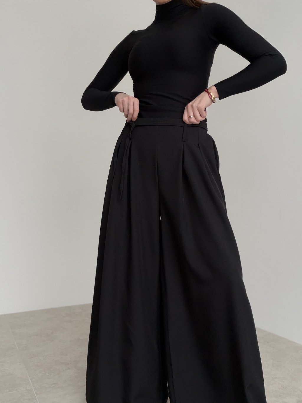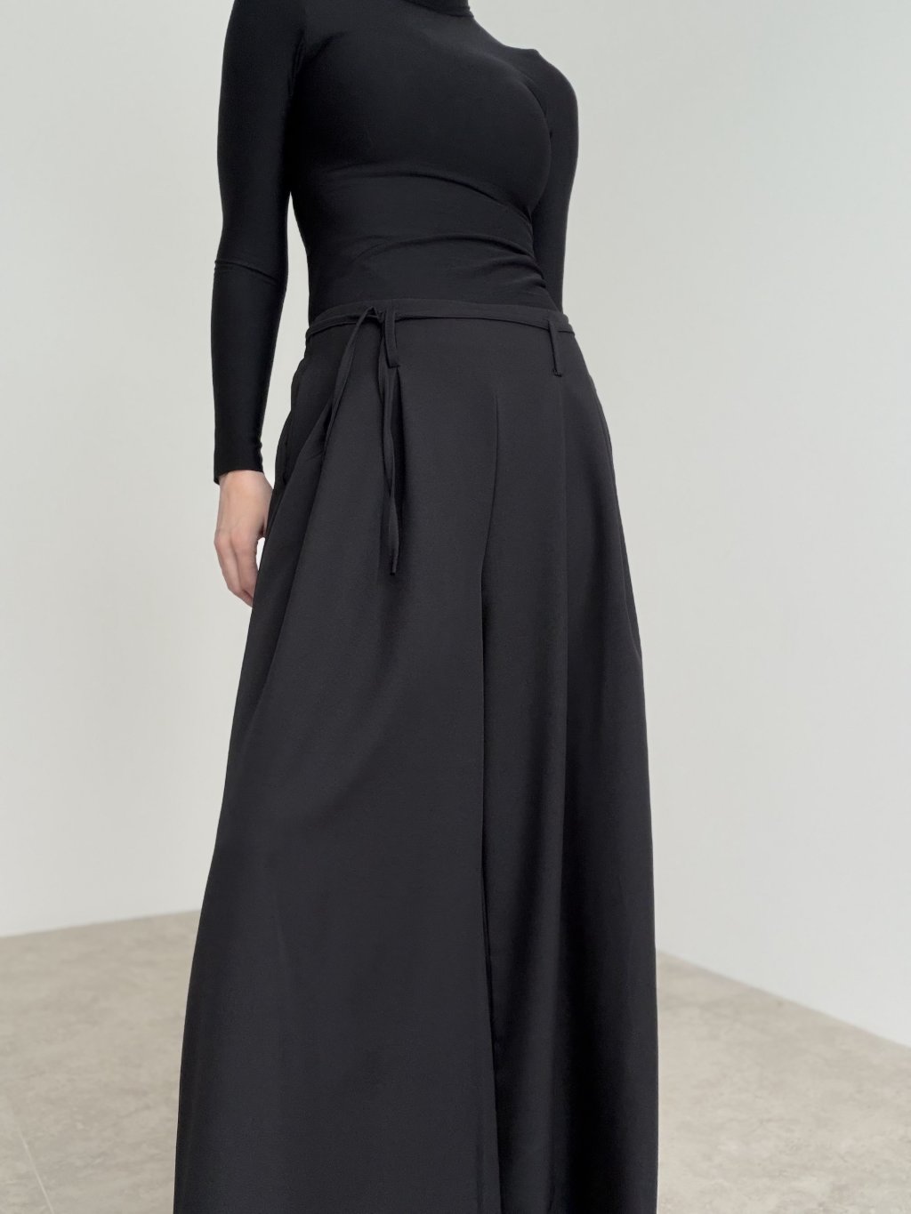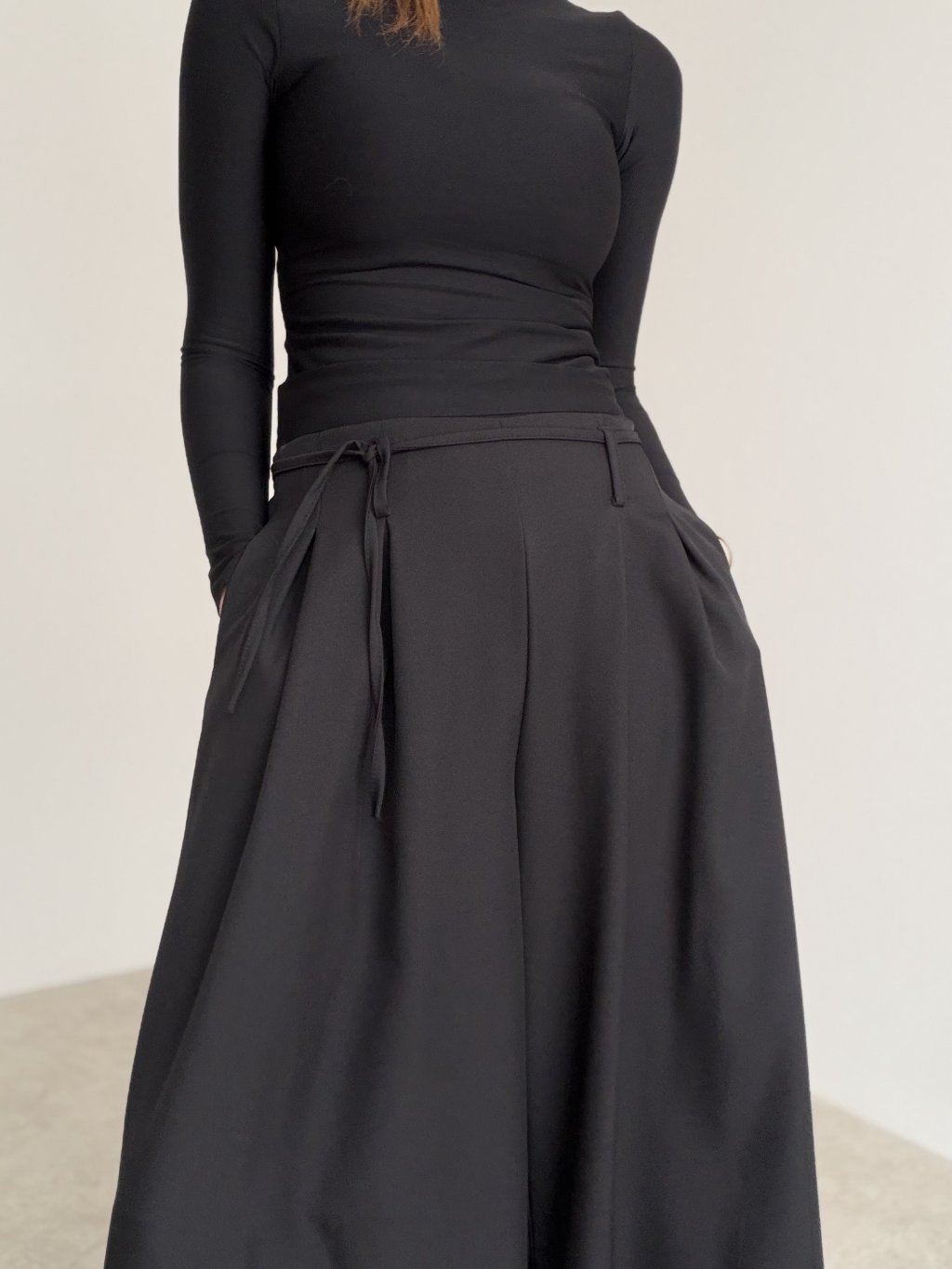 Spodnie z szerokimi nogawkami, wyższym stanem, zakładkami i wiązaniem w pasie. Lejący krój wygląda elegancko i zapewnia komfort na co dzień.