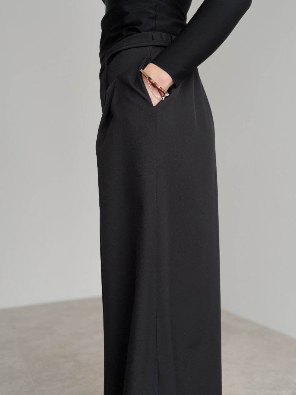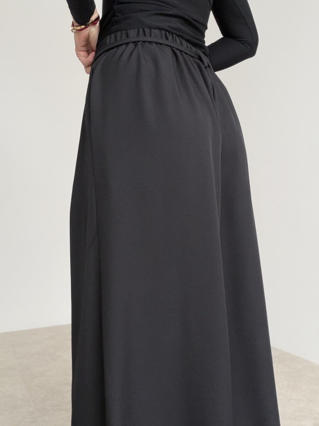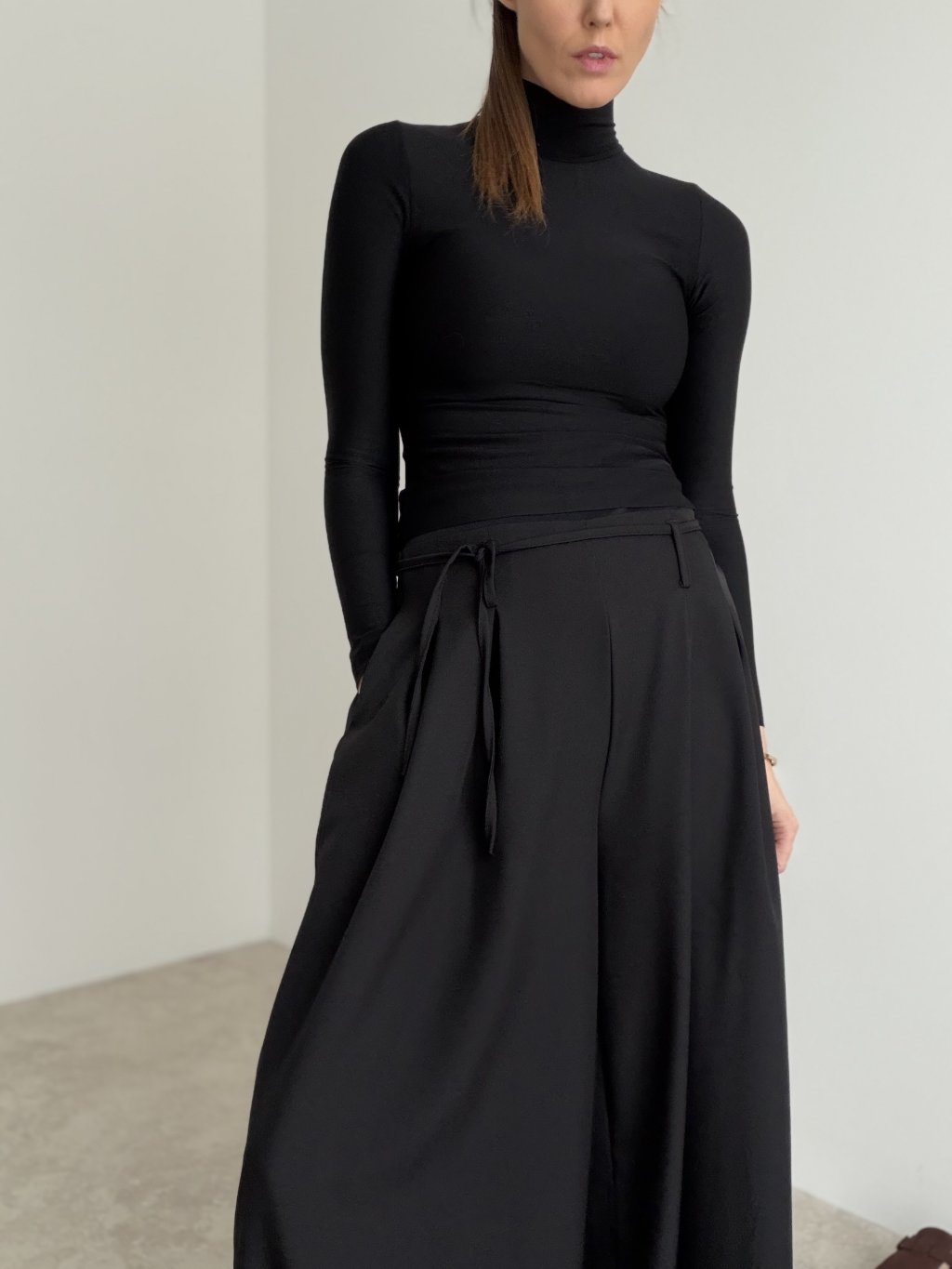 Spodnie z szerokimi nogawkami, wyższym stanem, zakładkami i wiązaniem w pasie. Lejący krój wygląda elegancko i zapewnia komfort na co dzień.