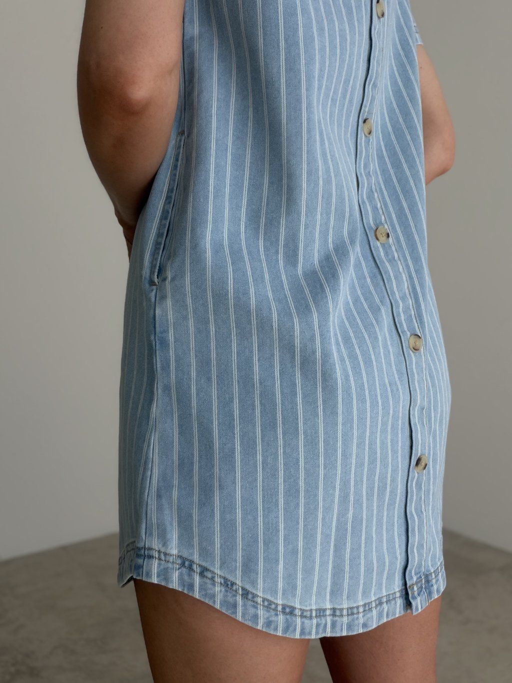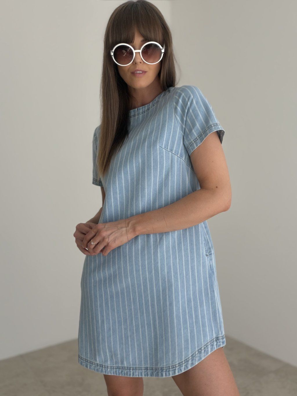 Sukienka w jeansowym stylu z delikatnym prążkowanym wzorem to idealny wybór na wygodne, codzienne stylizacje. Ma prosty, luźniejszy krój, krótkie rękawy i swobodny charakter, który wygląda lekko, kobieco i stylowo. Ciekawym detalem jest zapięcie na guziki z tyłu, które dodaje sukience oryginalnego wyglądu.