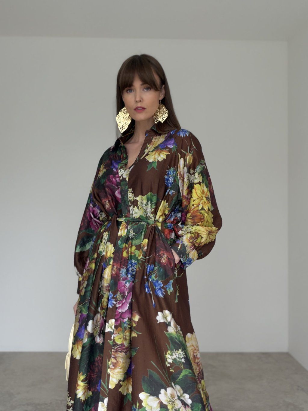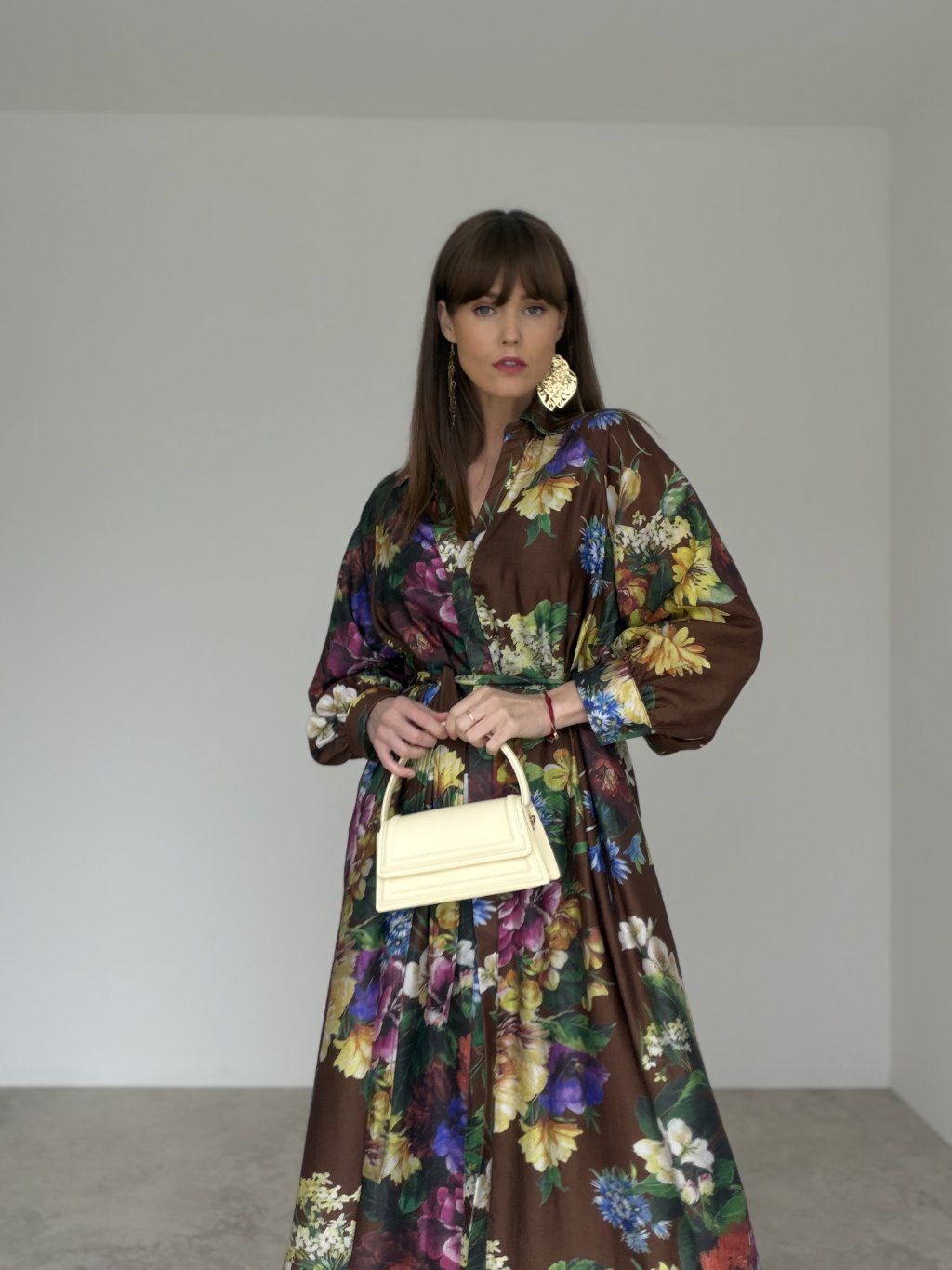 Ta sukienka prezentuje się bardzo kobieco, romantycznie i elegancko. Koszulowa góra w połączeniu z wiązaniem w talii pięknie podkreśla sylwetkę i nadaje całości uporządkowany, ponadczasowy charakter. Lekki materiał i lejący fason sprawiają, że sukienka wygląda efektownie już od pierwszego spojrzenia, a w ruchu prezentuje się wyjątkowo lekko i stylowo. To idealna propozycja dla kobiet, które lubią bardziej wyraziste elementy modowe, ale nadal chcą zachować elegancję i kobiecość.