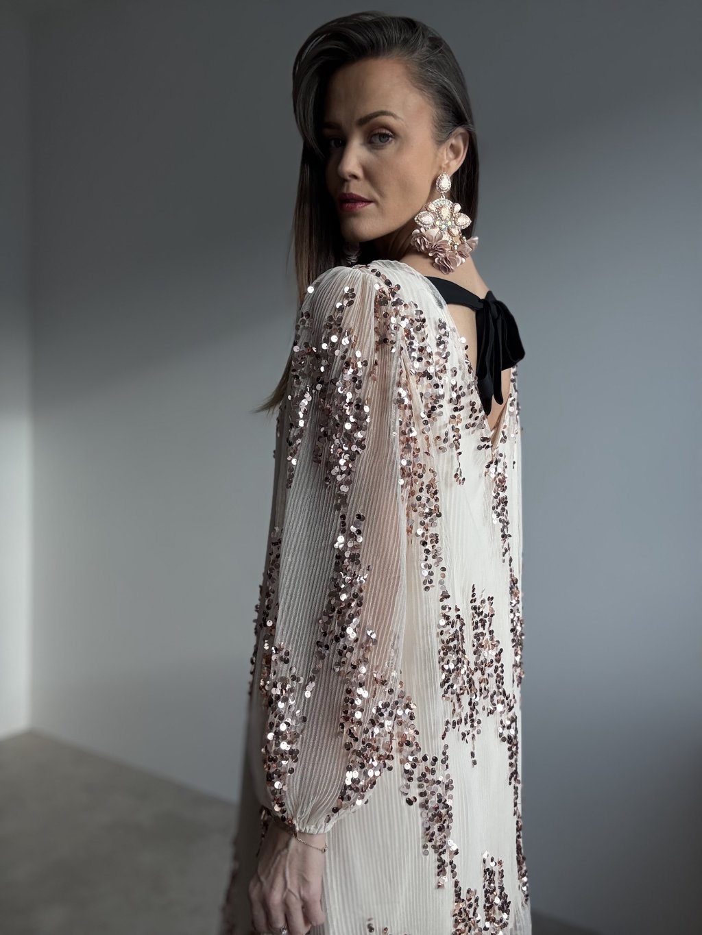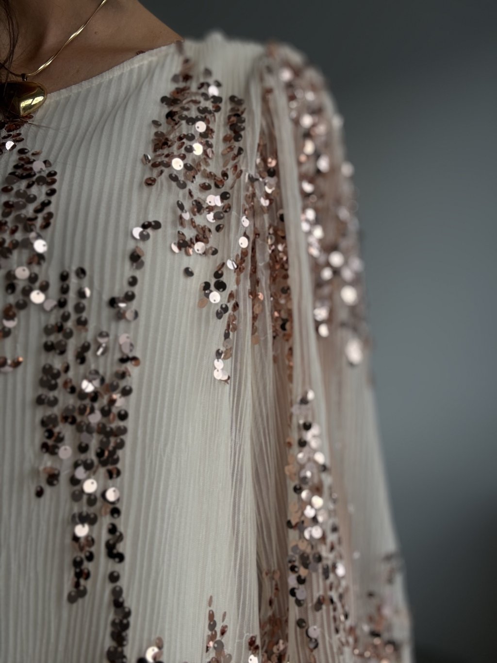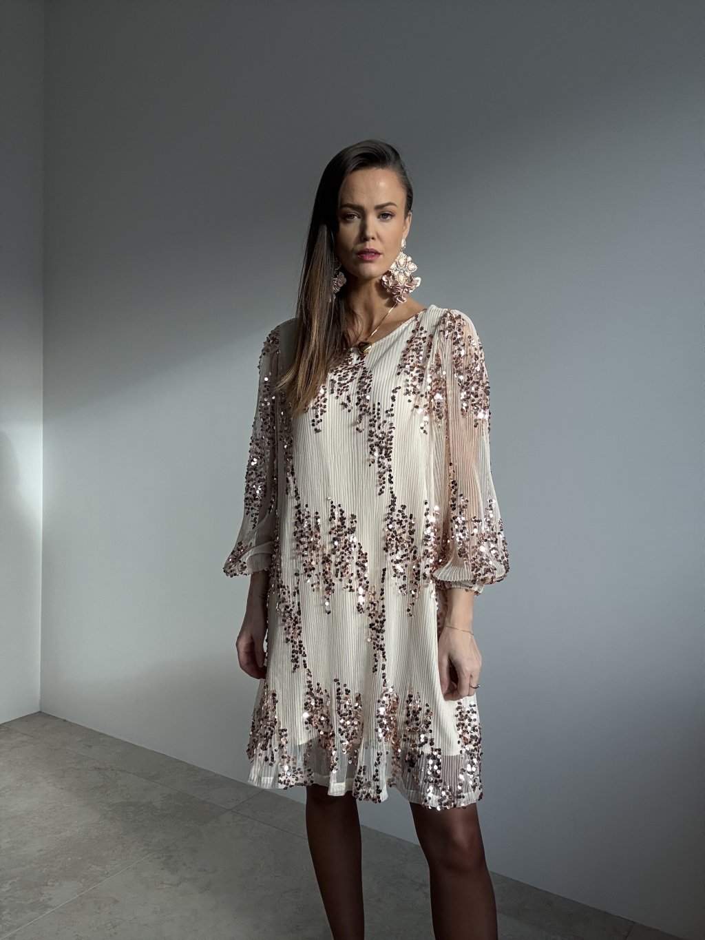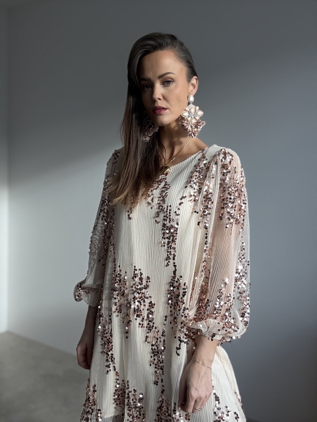Romantyczna sukienka z delikatną plisowaną strukturą i cekinowymi zdobieniami prezentuje się lekko, kobieco i bardzo elegancko. Zwiewny, lekko rozszerzany krój pięknie porusza się podczas chodzenia, a długie, półprzezroczyste rękawy dodają całości subtelnego uroku. Cekiny rozmieszczono tak, aby dawały luksusowy, lecz nienachalny błysk.