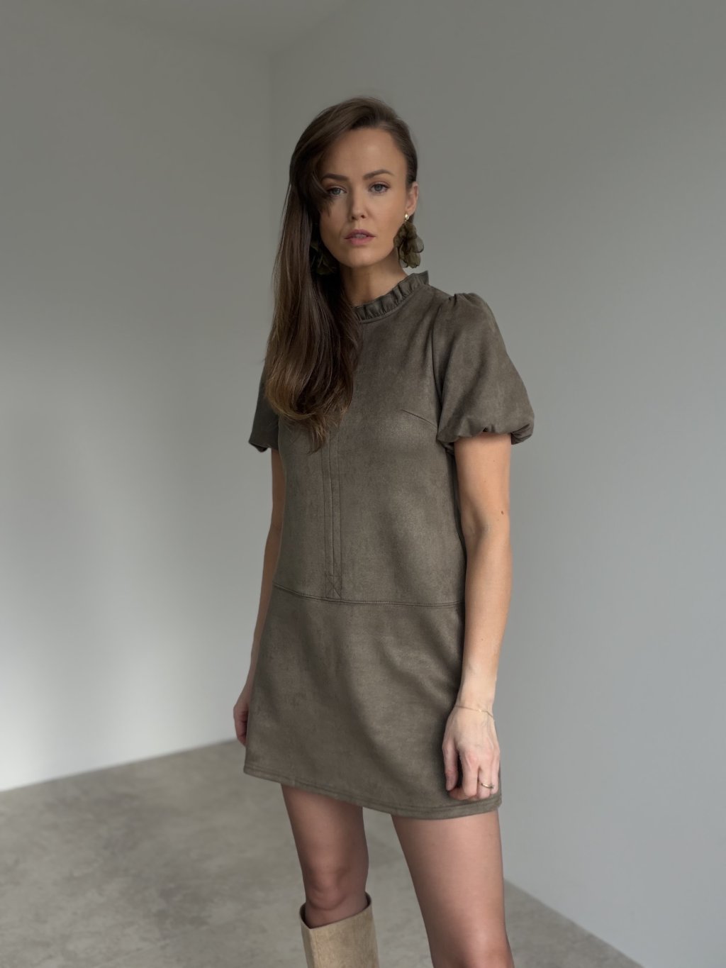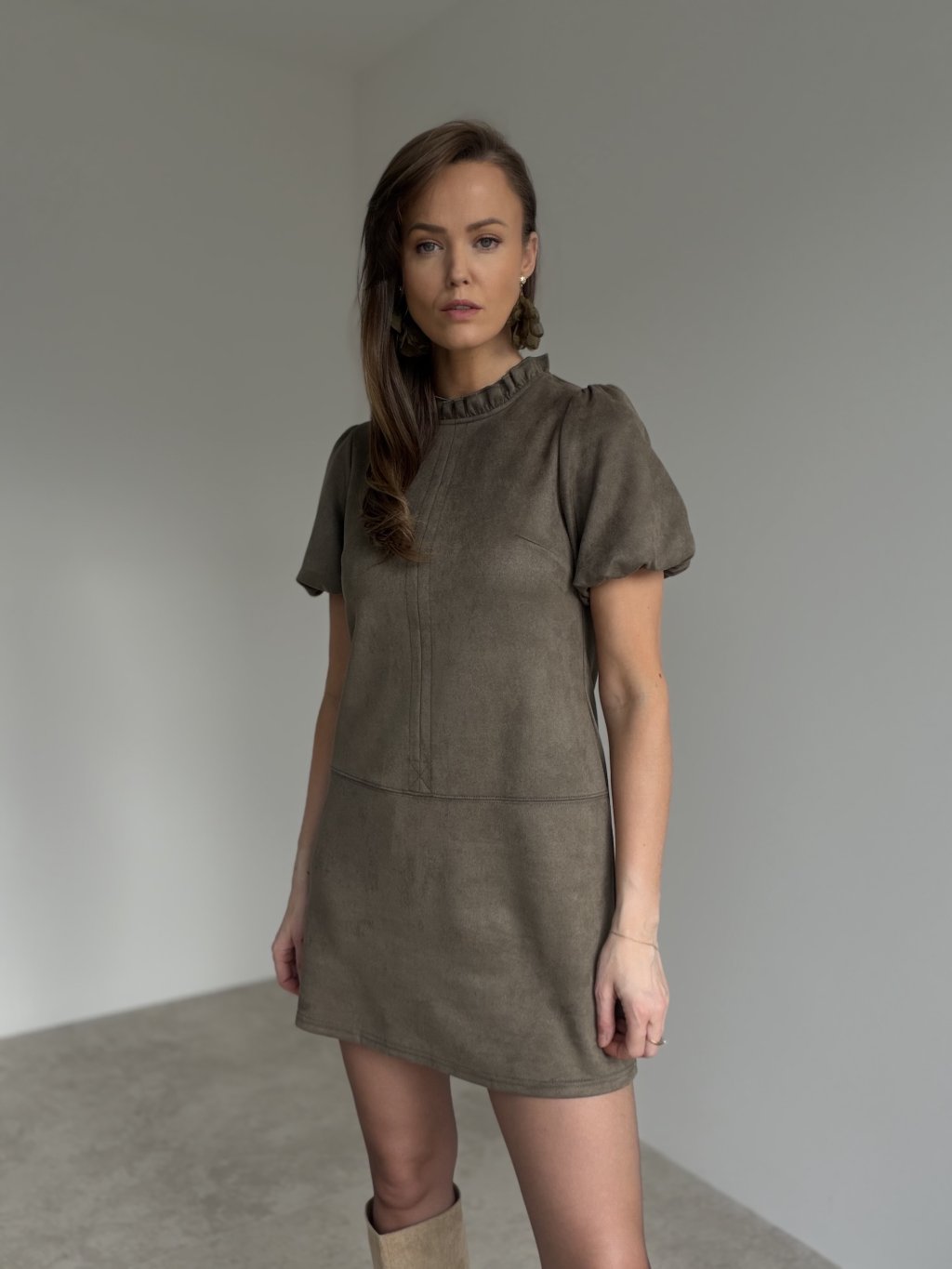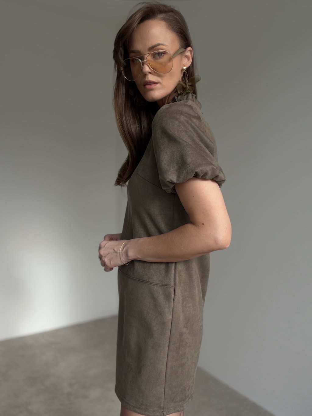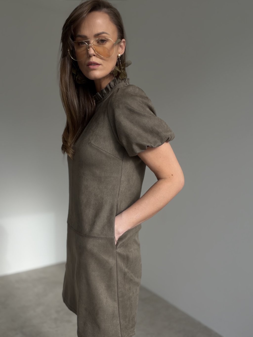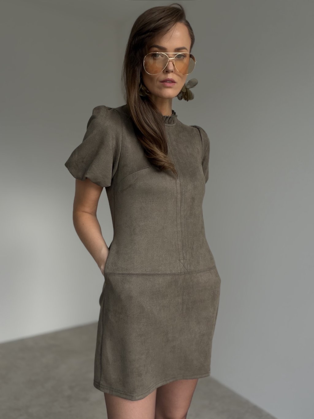 Sukienka o efekcie zamszu z marszczoną stójką, krótkimi rękawami z delikatną objętością i kieszeniami po bokach. Elegancka i wygodna na co dzień.