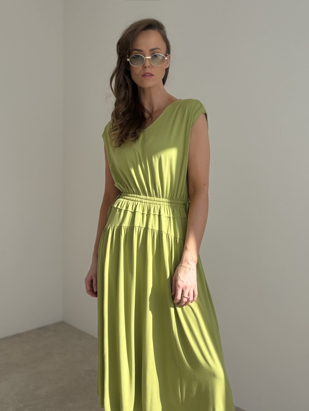 Ta sukienka jest idealna na dni, kiedy chcesz wyglądać schludnie, a jednocześnie czuć pełną swobodę. Ma luźny, lekko lejący fason z przyjemnej dzianiny, która ładnie układa się na sylwetce i pięknie pracuje w ruchu. Góra jest prosta i minimalistyczna, z delikatnie opuszczonym rękawem, co dodaje jej kobiecego, ale nadal casualowego charakteru. W talii znajduje się wygodne marszczenie oraz regulacja na troczek, dzięki czemu możesz dopasować ją do siebie. Kieszenie i bardziej rozkloszowana część spódnicowa zapewniają komfort przez cały dzień. Ciekawym detalem jest także wyraźniejszy panel z tyłu, który nadaje całości nowoczesnego wyglądu.