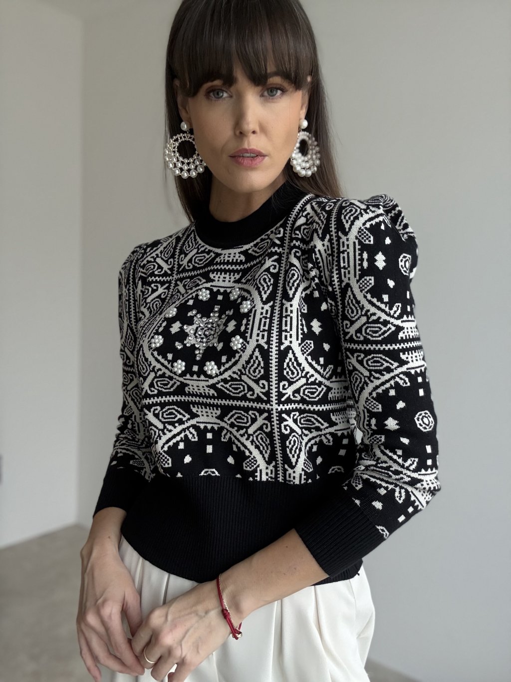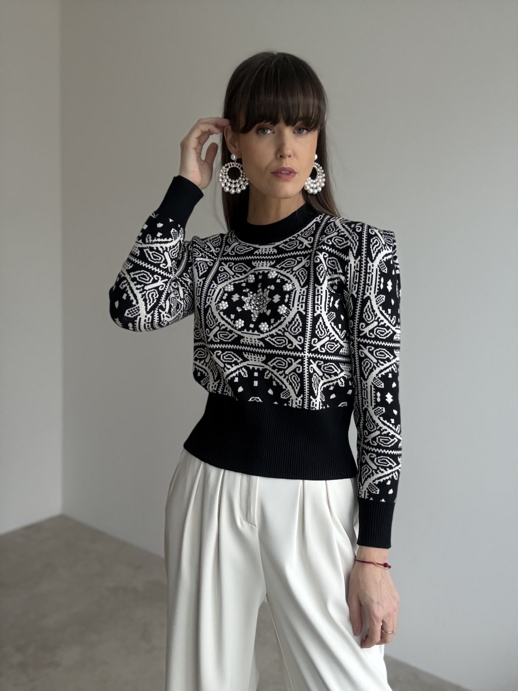 Sweter z geometrycznym wzorem i nowoczesnym krojem do stylowych kombinacji.
