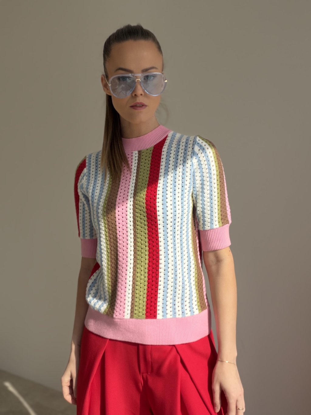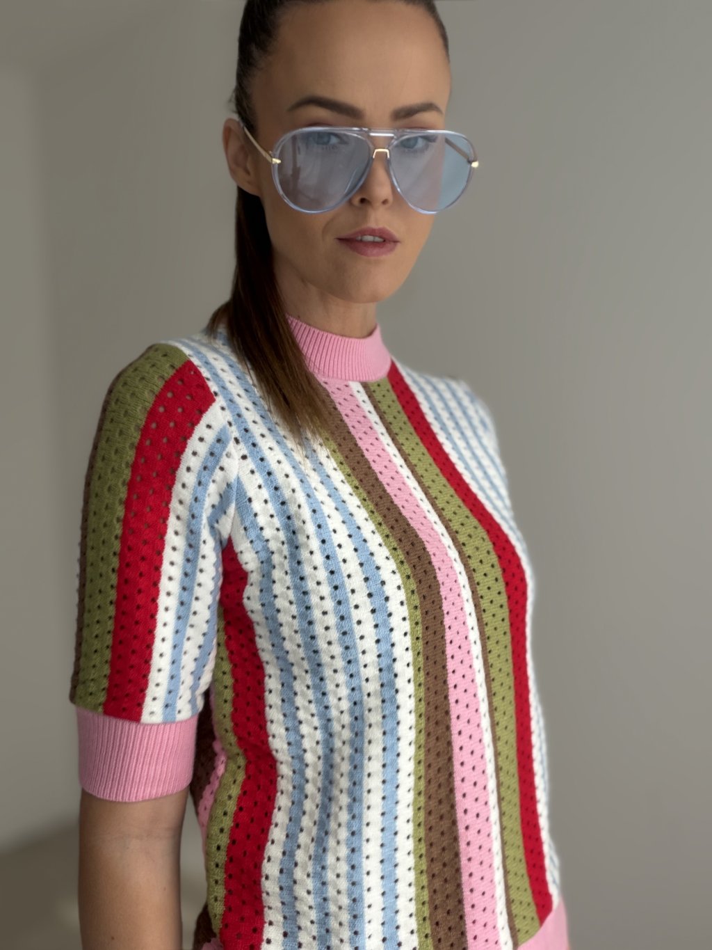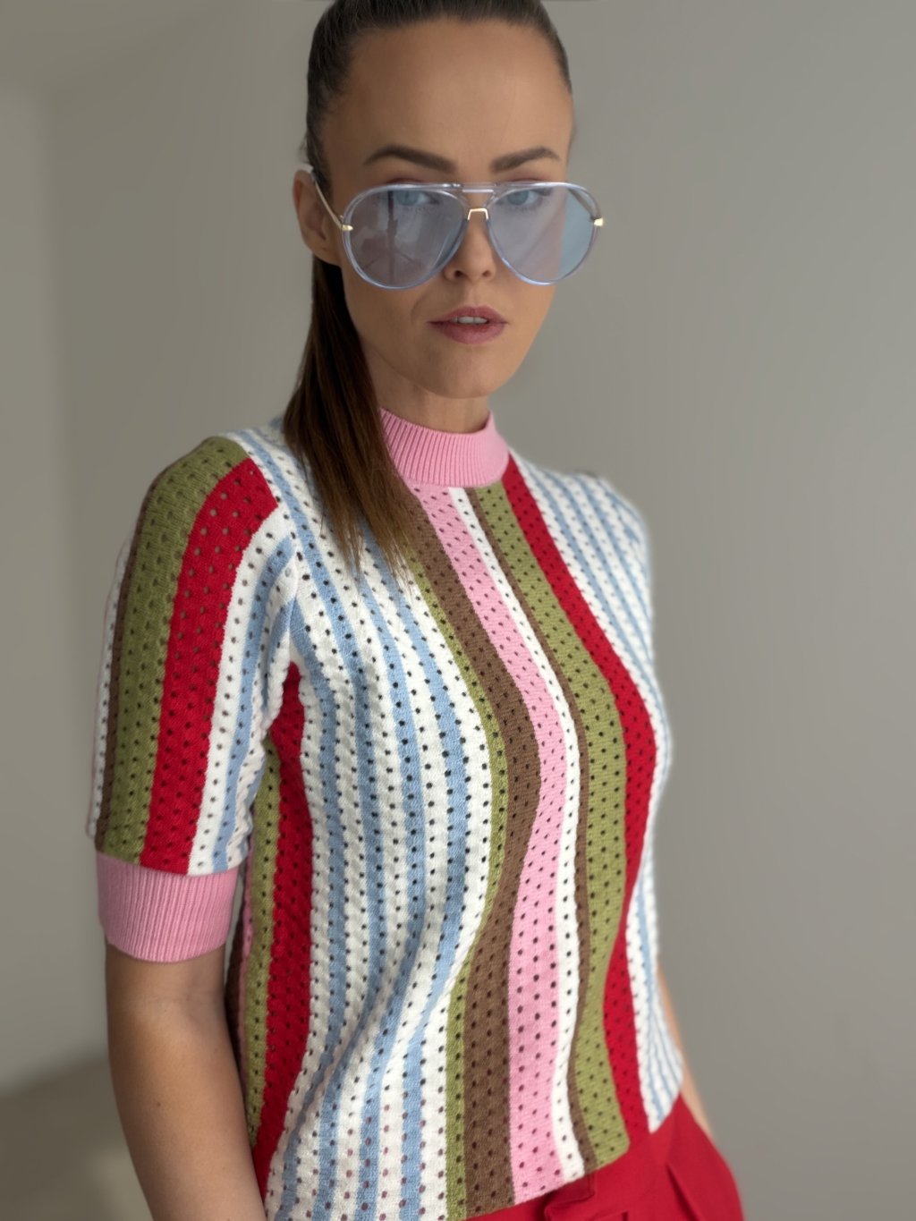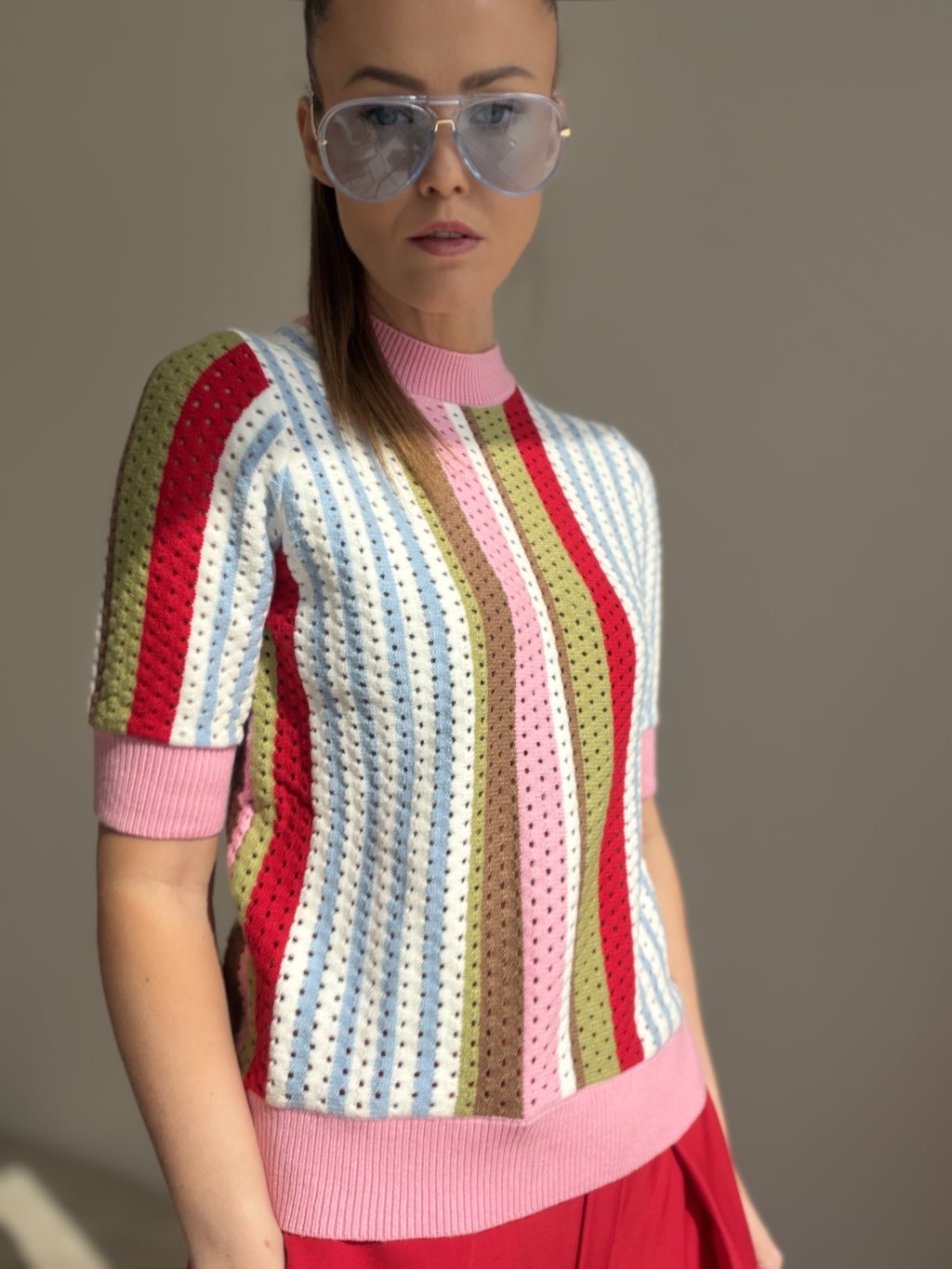 Ten sweter to wyjątkowy model, który od razu przyciąga uwagę i nadaje stylizacji świeżego, oryginalnego charakteru. Zachwyca delikatną dzianinową strukturą, krótkim rękawem oraz nowoczesnym krojem, który prezentuje się kobieco, stylowo i jednocześnie wygodnie. Dzięki swojemu wykonaniu świetnie sprawdzi się w okresie przejściowym oraz w dni, kiedy chcesz nosić dzianinę w lżejszej, bardziej przewiewnej formie. Doskonale łączy się ze spodniami, jeansami i spódnicą, tworząc outfit, który wygląda schludnie, ale nadal lekko i swobodnie. To idealny wybór dla kobiet, które lubią ciekawe detale i chcą wprowadzić do swojej garderoby coś wyjątkowego.