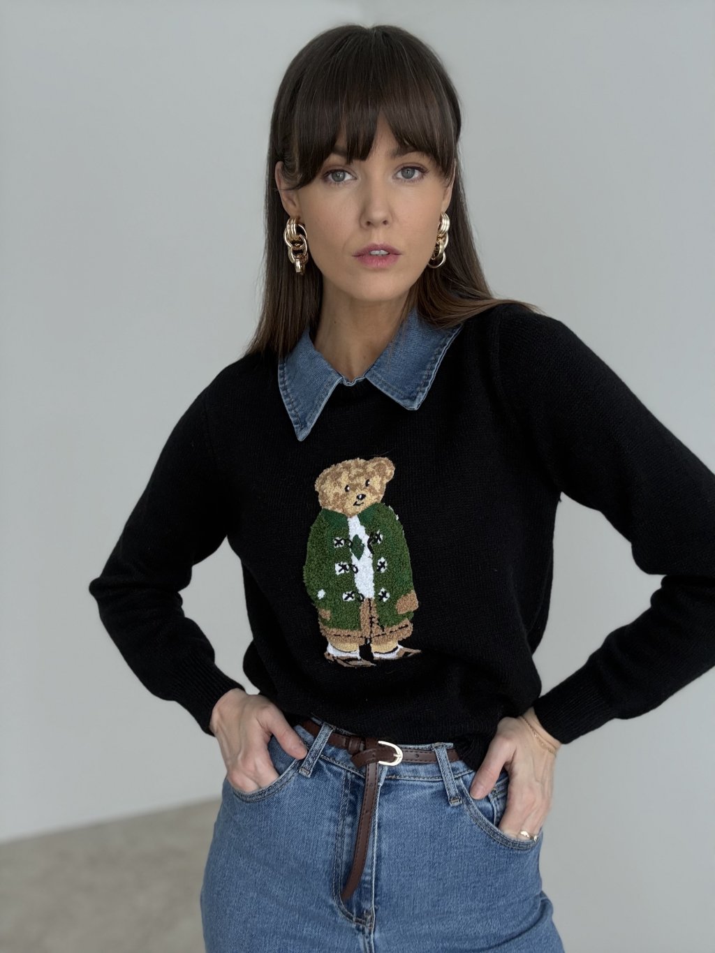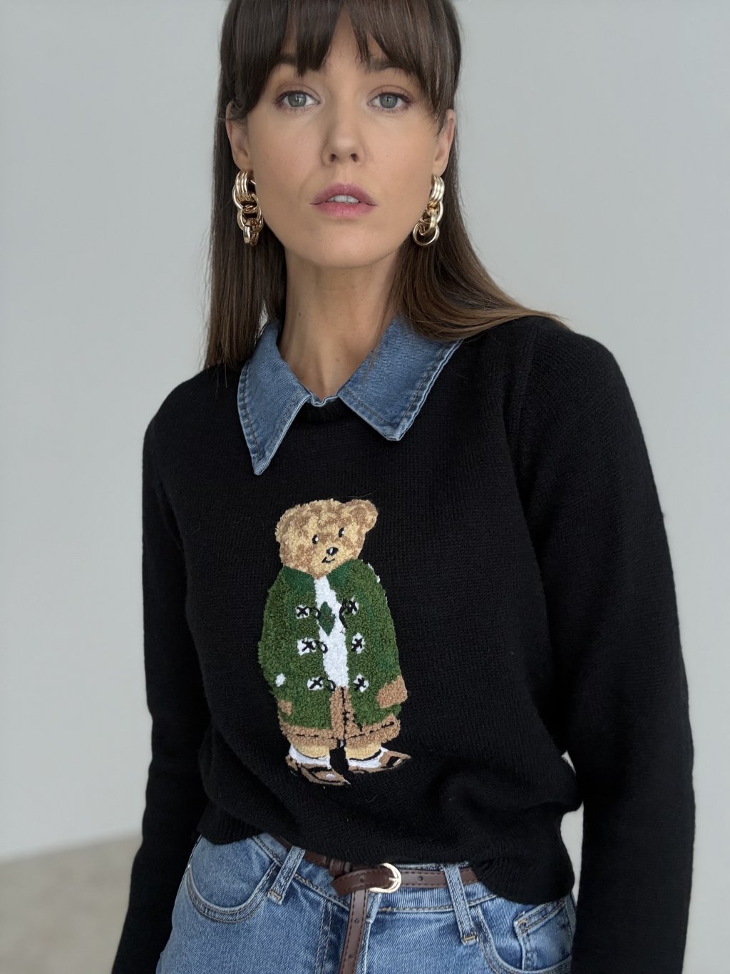 Ten sweter z kołnierzem to wyrazisty, a jednocześnie bardzo uniwersalny element garderoby, który wygląda schludnie nawet w prostej stylizacji. Przyjemna dzianina zapewnia komfort noszenia, a klasyczny krój sprawia, że świetnie sprawdzi się na co dzień oraz w zestawach w stylu smart casual. Kołnierz w stylu denim tworzy efekt warstw, bez potrzeby zakładania koszuli. Przód uzupełnia oryginalny motyw, który dodaje charakteru, ale całość nadal pozostaje elegancka i łatwa do zestawiania. Sweter pasuje zarówno do jeansów, spodni, jak i spódnic, dzięki czemu staje się praktycznym wyborem na wiele okazji.