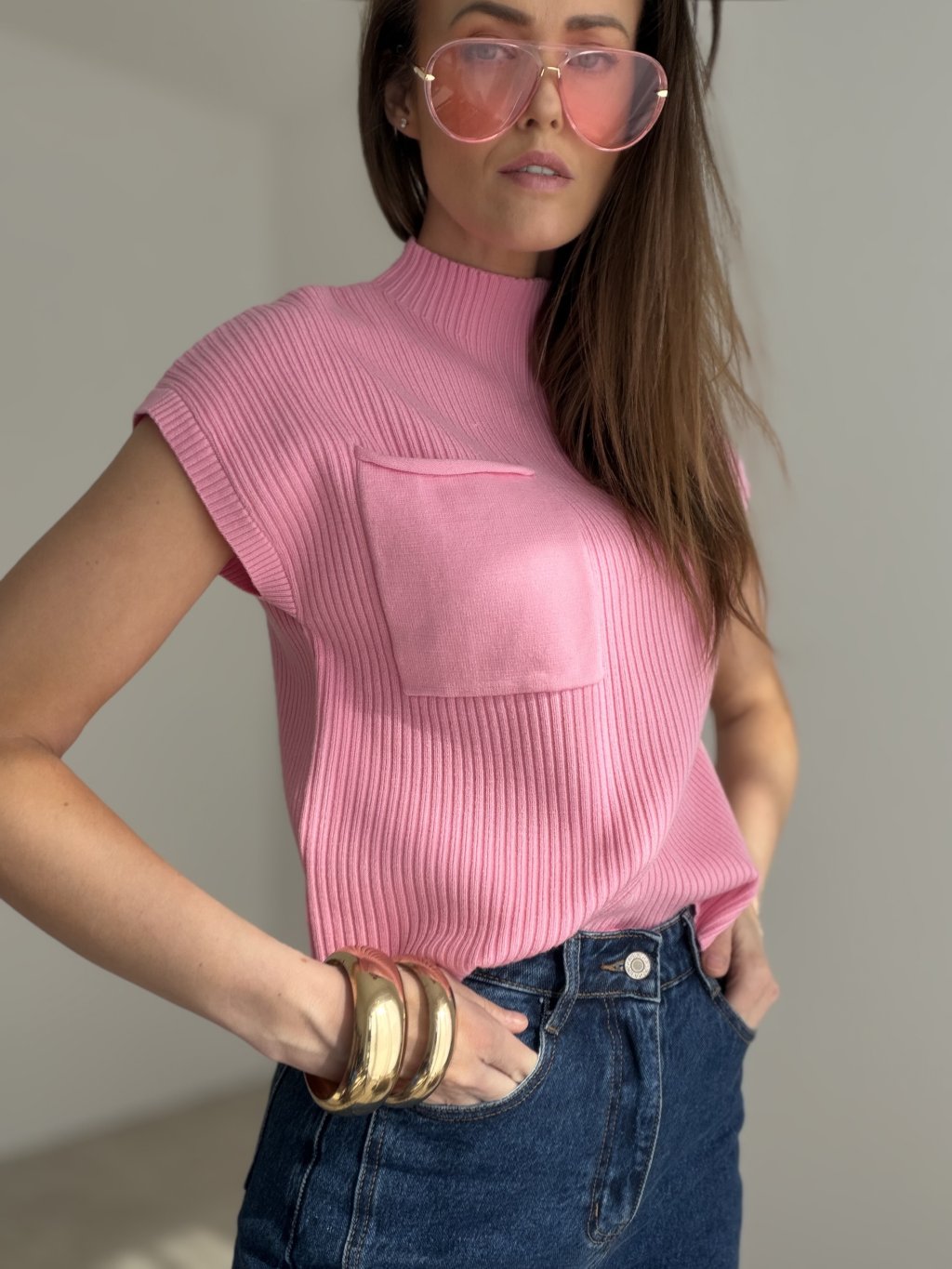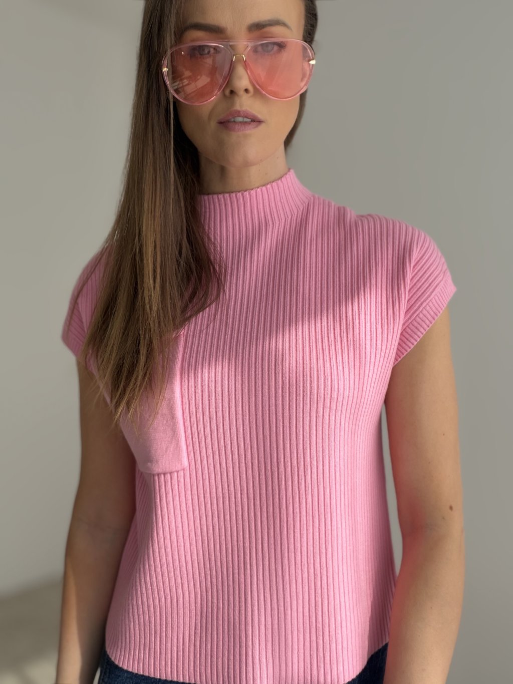 Delikatny prążkowany sweter to elegancki, a zarazem bardzo uniwersalny model, który z łatwością wpisuje się zarówno w codzienną, jak i bardziej dopracowaną garderobę. Zwraca uwagę czystą linią, bardziej dopasowanym krojem oraz wyższym kołnierzem, który nadaje mu nowoczesnego i stylowego charakteru. Krótki rękaw dodaje całości lekkości i kobiecego wyglądu, a subtelna kieszeń z przodu stanowi ciekawy detal, który pięknie uzupełnia cały fason.