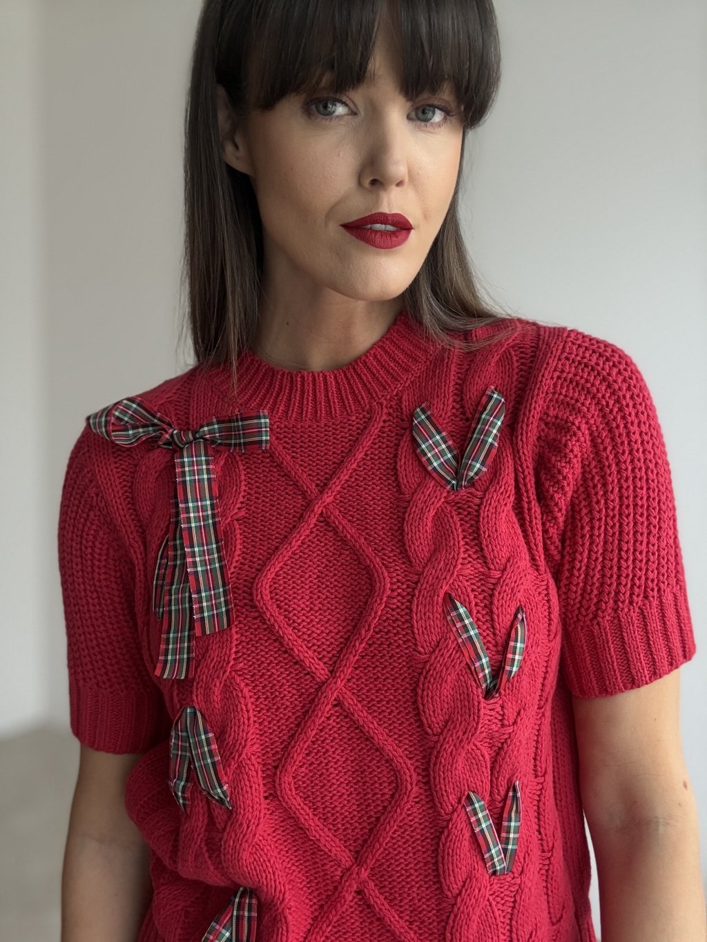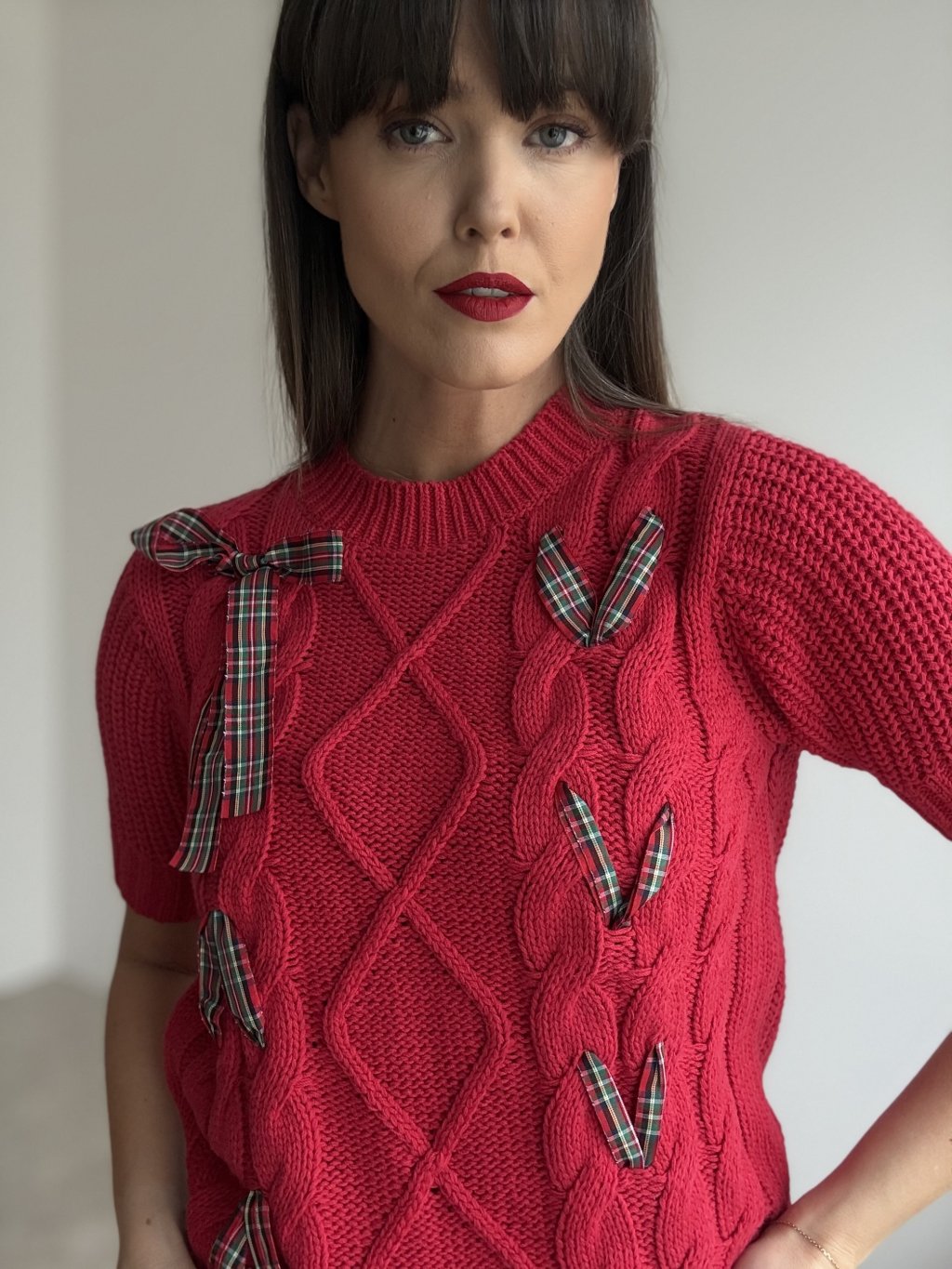 Dzianinowy sweter z krótkim rękawem, wzorem warkoczy i dekoracyjnymi kraciastymi kokardami z przodu, który dodaje stylizacjom dziewczęcego, świątecznego i jednocześnie eleganckiego charakteru.