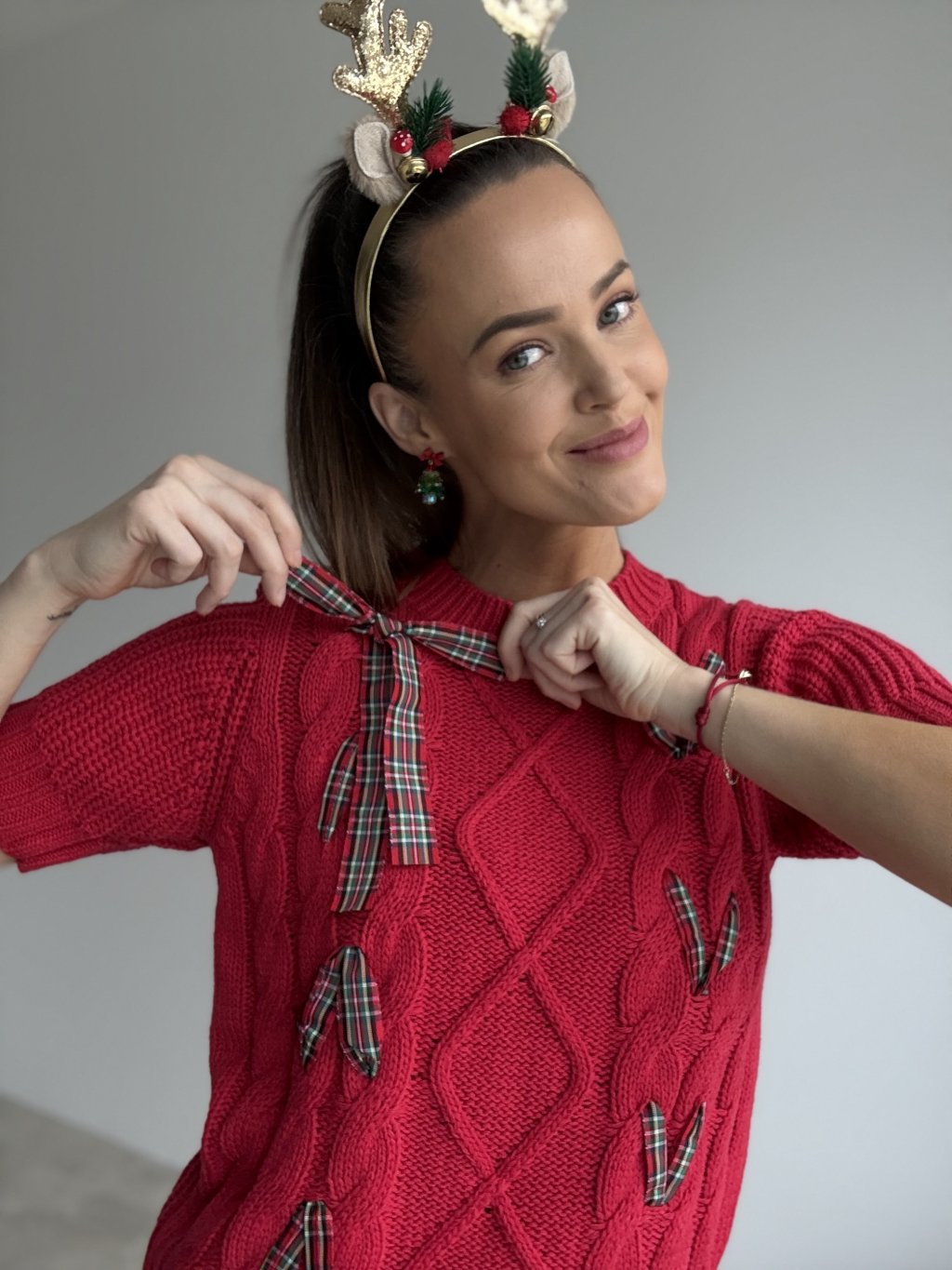 Oryginalny, dzianinowy sweter z krótkim rękawem, który łączy w sobie zabawny detal z eleganckim charakterem. Przód zdobi wyraźny wzór warkoczy, przepleciony kilkoma kokardami z kraciastej wstążki, co tworzy efekt „zapakowanego prezentu” i nadaje stylizacji świątecznego klimatu. Miękka dzianina jest przyjemna dla skóry, nie gryzie i wygodnie dopasowuje się do sylwetki. Ściągacze przy dekolcie, w pasie i na rękawach pomagają utrzymać kształt swetra i delikatnie podkreślają figurę. To model, który świetnie wygląda na zdjęciach, a jednocześnie jest komfortowy na cały dzień.