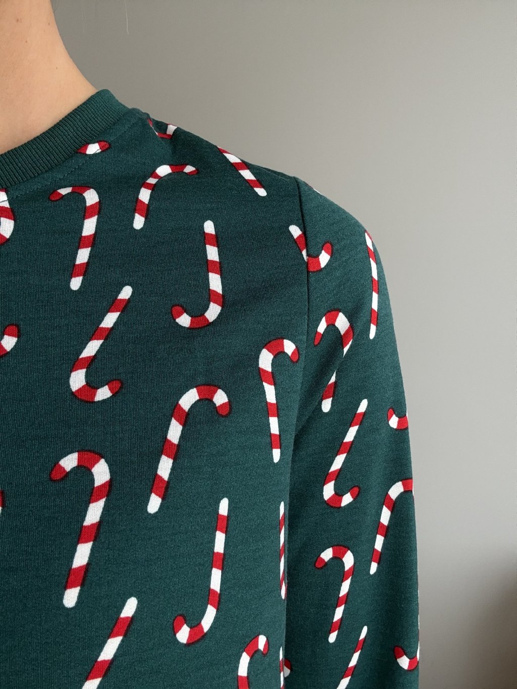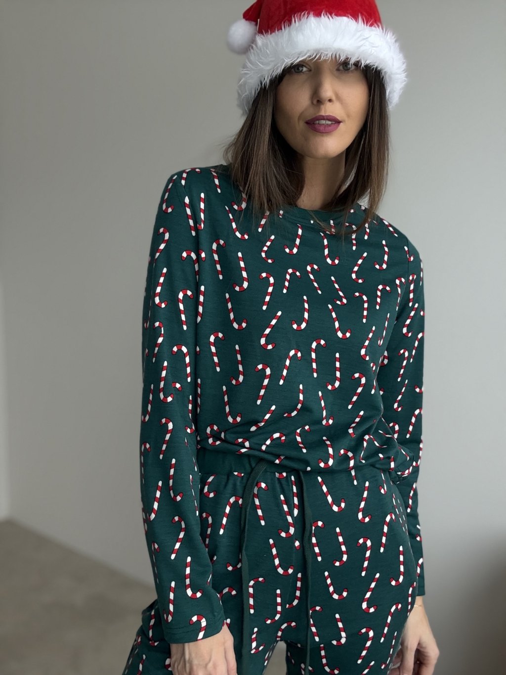 Świąteczna piżama z miękkiej, przyjemnej w dotyku tkaniny – idealna na zimowe wieczory, świąteczne dni i domowy relaks. Górna część ma luźny krój z długimi rękawami i wygodnym dekoltem, dzięki czemu świetnie nosi się przez cały dzień i noc. Spodnie posiadają elastyczną talię ze sznurkiem oraz ściągacze na dole, aby dobrze trzymały się na miejscu. Całość zdobi wesoły motyw cukrowych lasek, wprowadzający prawdziwy świąteczny klimat.