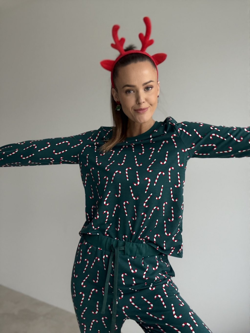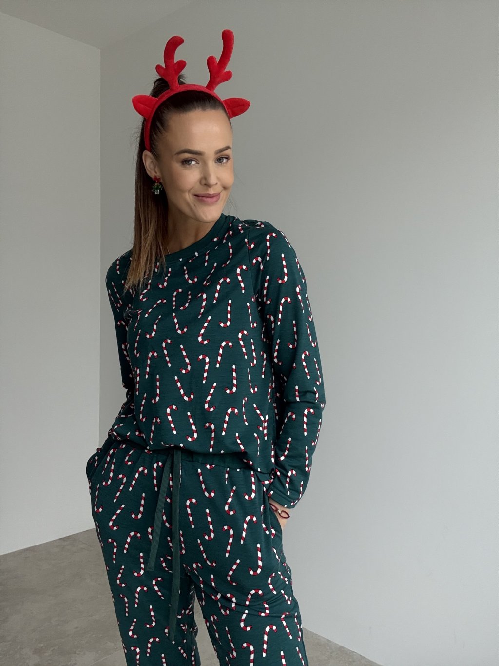Miękka świąteczna piżama z długimi rękawami i elastycznymi spodniami, ozdobiona motywem cukrowych laseczek – idealna na zimową, domową atmosferę.