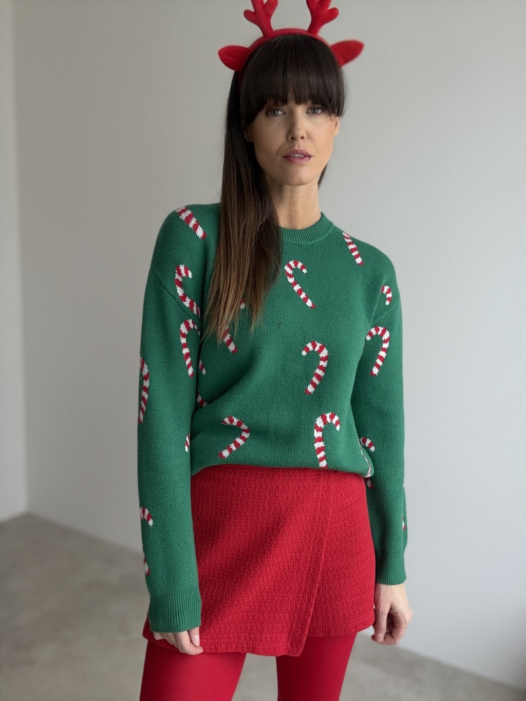• Do świątecznych zdjęć połącz go ze spódnicą z podwyższonym stanem i kozakami.