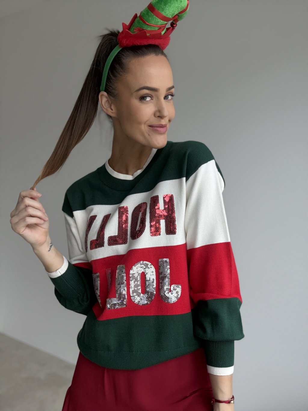 Świąteczny sweter w paski z wyrazistym napisem z cekinów i wygodnym krojem, doskonały do tworzenia radosnych, zimowych stylizacji na czas świąt.