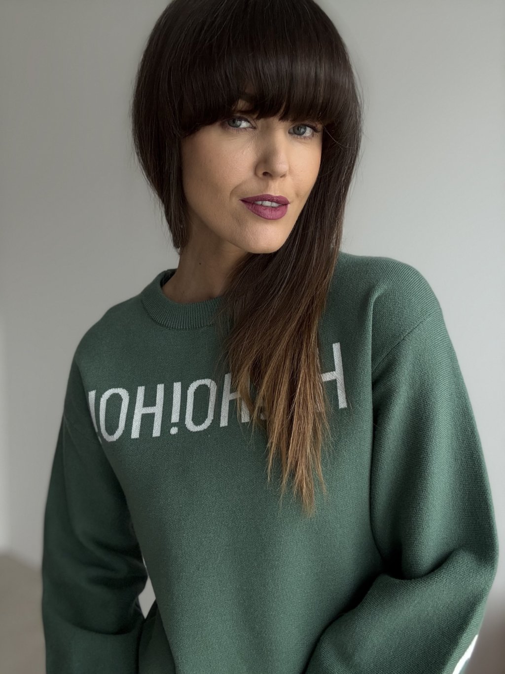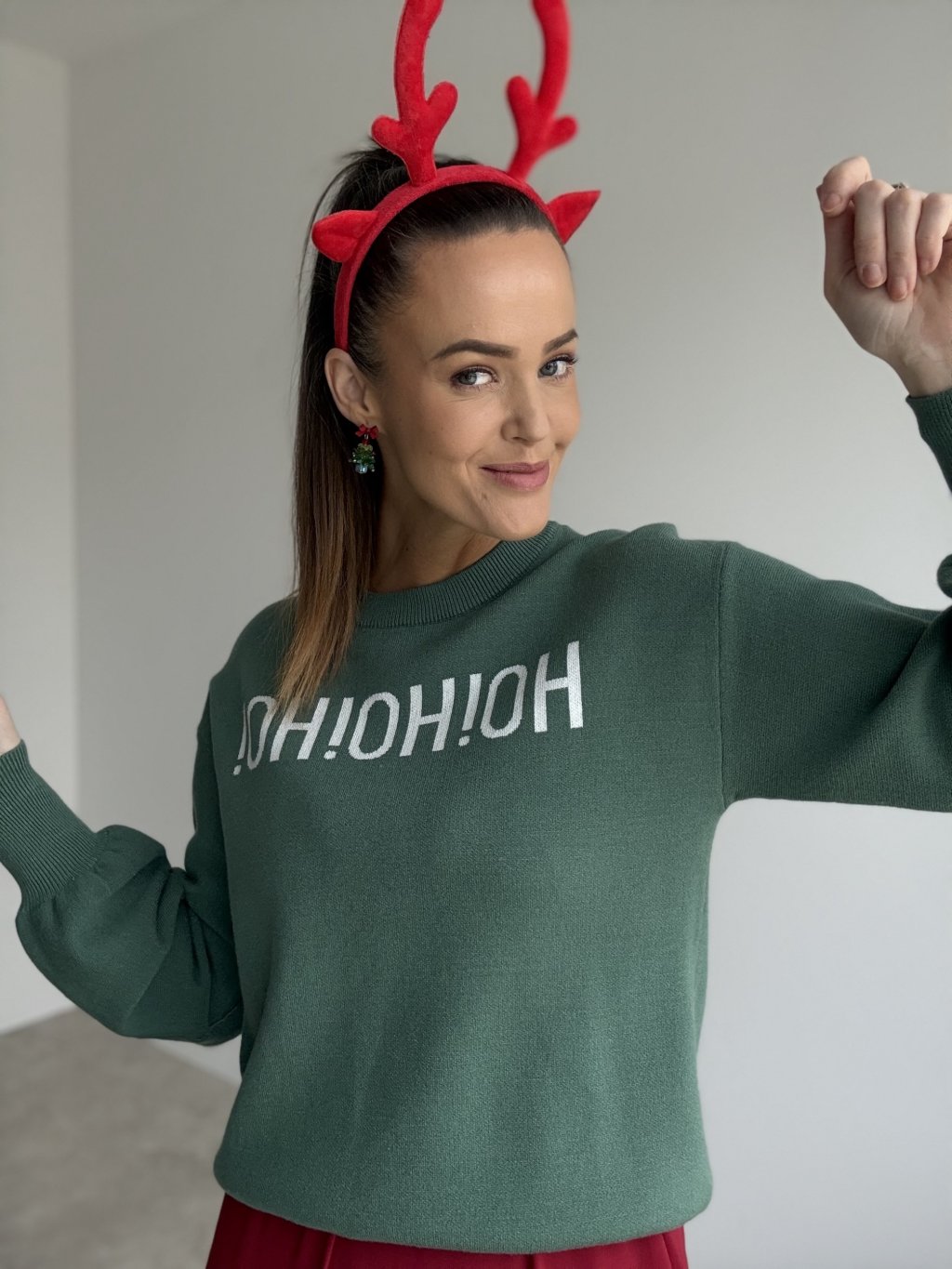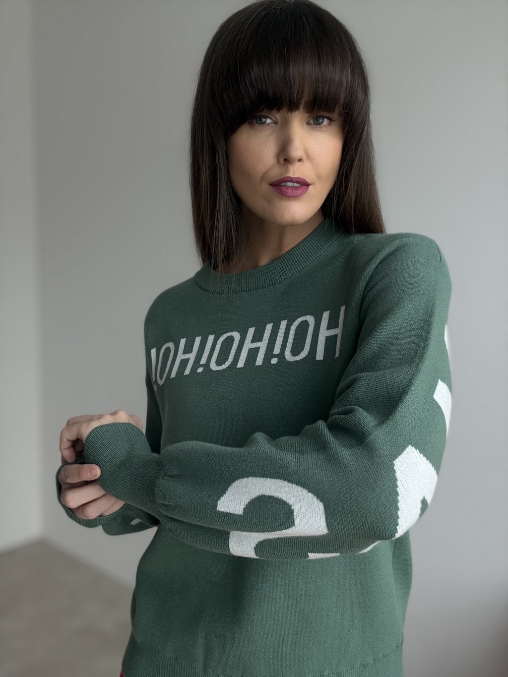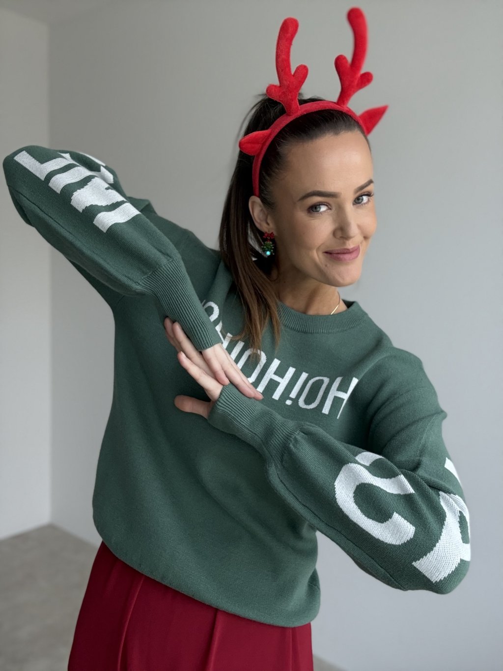 Świąteczny sweter z miękkiej, dzianinowej tkaniny, idealny na zimowy czas i bożonarodzeniowe dni. Wygodny krój z okrągłym dekoltem i długimi rękawami zapewnia komfort noszenia przez cały dzień i nie krępuje ruchów. Przód oraz rękawy ozdobione są wyrazistym świątecznym napisem, który nadaje całości wesoły, a jednocześnie stylowy charakter. Ściągacze przy dole, mankietach i dekolcie sprawiają, że sweter dobrze trzyma kształt i wygląda schludnie w każdej stylizacji – z dżinsami, spódnicą czy domowymi spodniami.