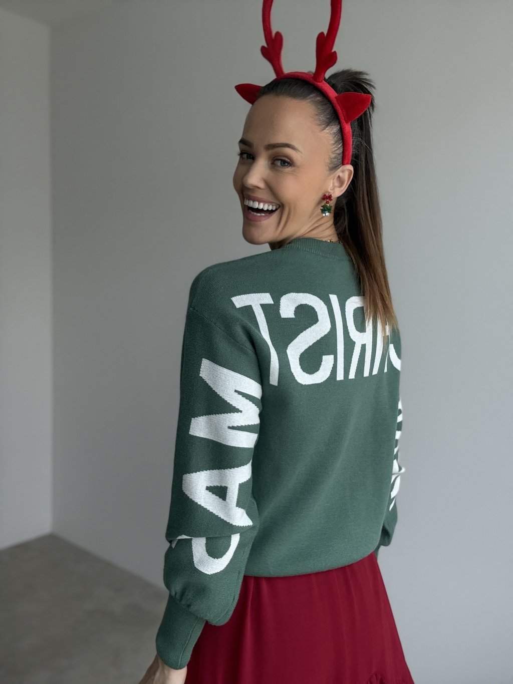 Miękki świąteczny sweter o wygodnym kroju z wyrazistym, świątecznym napisem z przodu i na rękawach, idealny na zimowe dni i bożonarodzeniowy klimat.