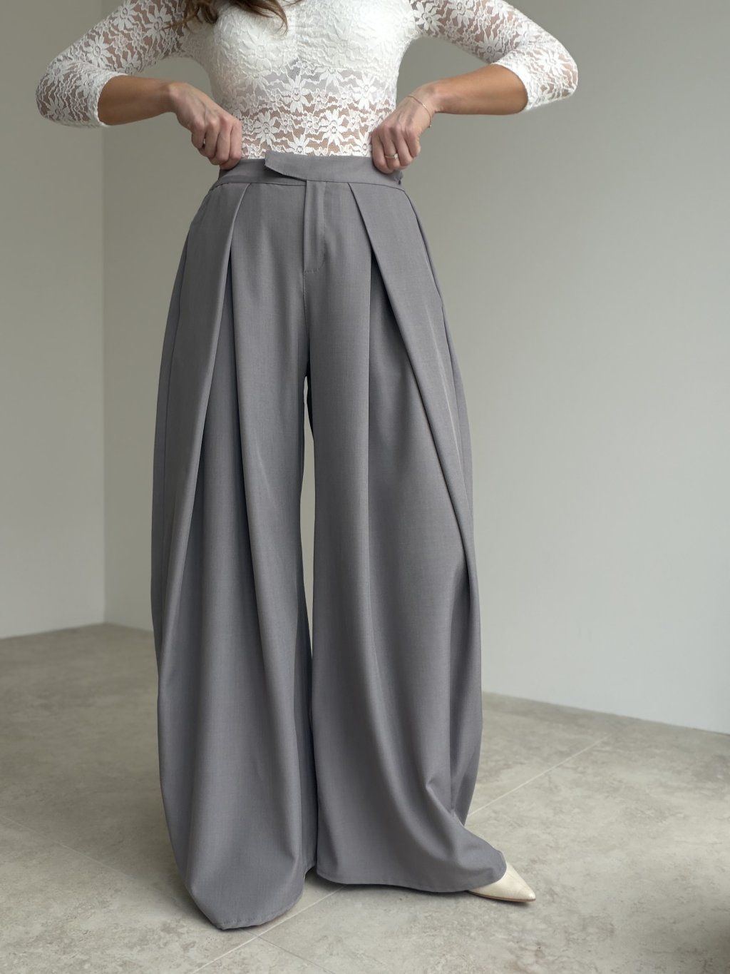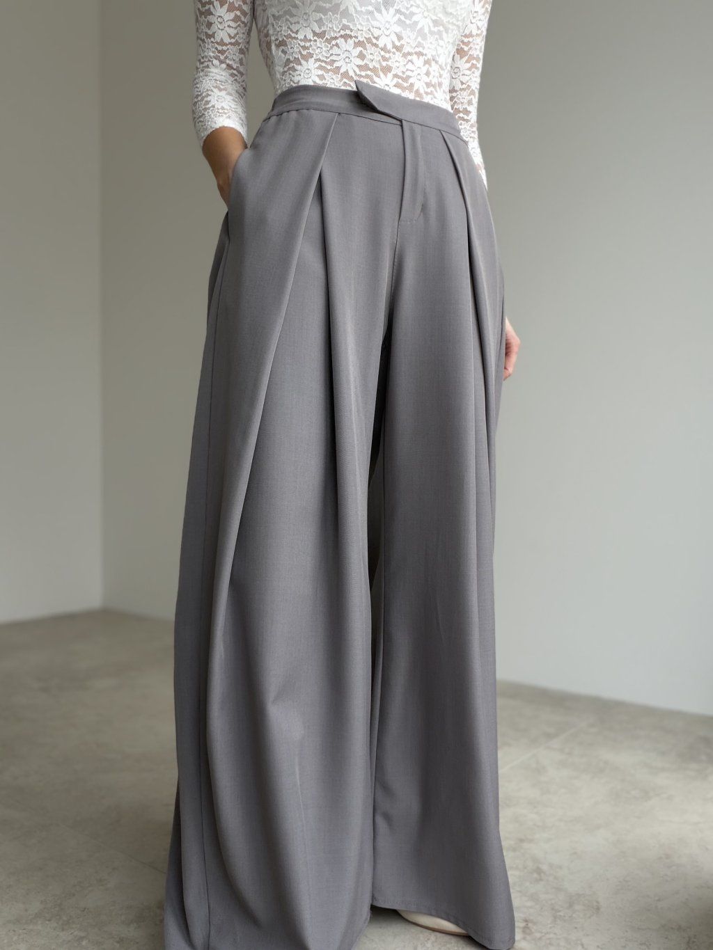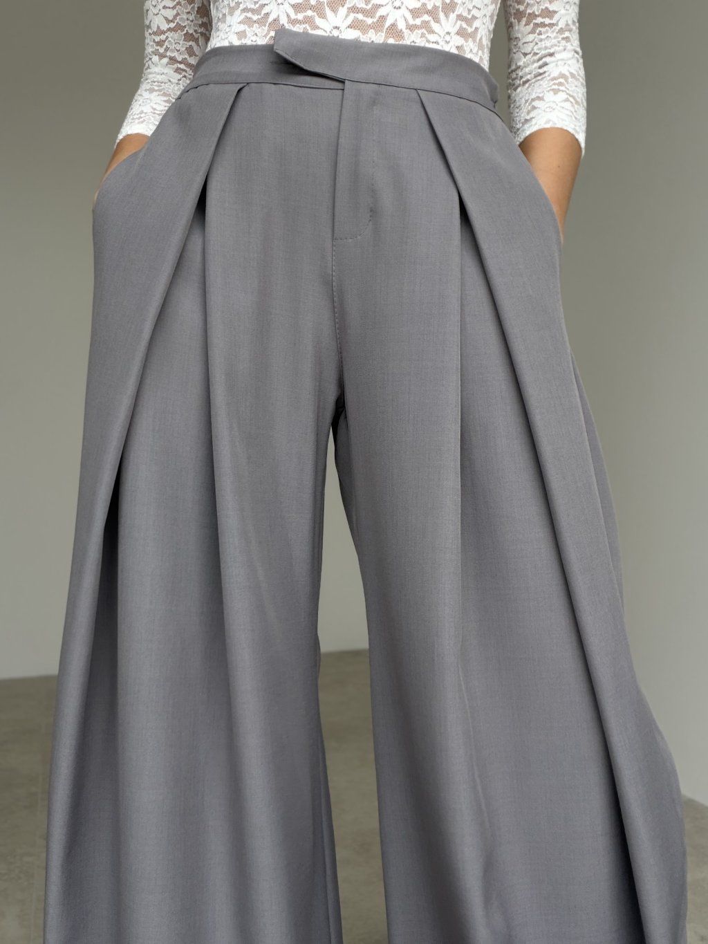 Spodnie wide z wysokim stanem i zakładkami z przodu, które tworzą elegancką sylwetkę. Szeroka nogawka układa się lekko i pasuje zarówno na co dzień, jak i na bardziej formalne wyjścia.
