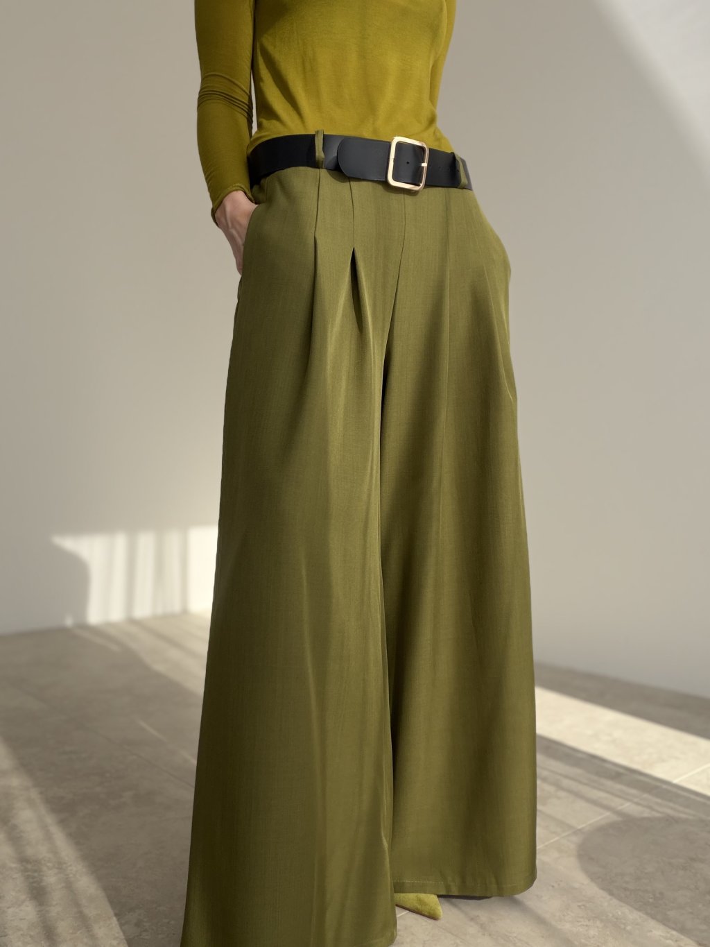 Eleganckie spodnie z szerokimi nogawkami, które pięknie wydłużają sylwetkę i nadają stylizacji dopracowany charakter. Krój podkreśla talię, a jednocześnie zapewnia wygodę w ciągu dnia. Delikatne zakładki z przodu dodają klasy i sprawiają, że spodnie ładnie układają się w ruchu. Praktyczne kieszenie i uniwersalny fason czynią je świetnym wyborem do pracy, na spotkania oraz na wieczór – wystarczy zmienić górę i dodatki.