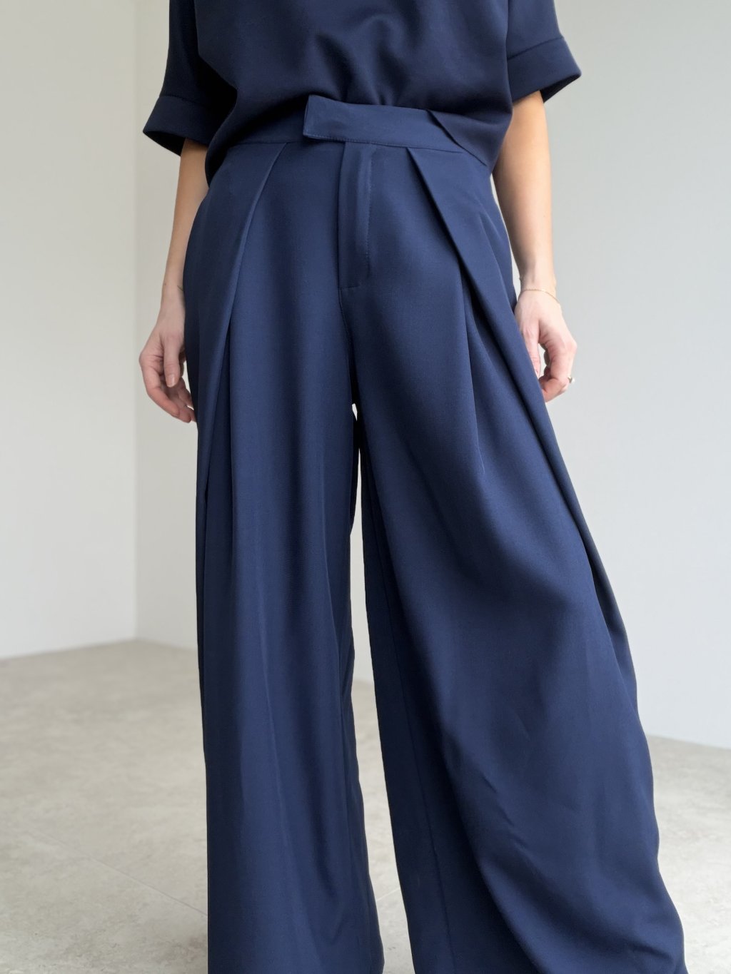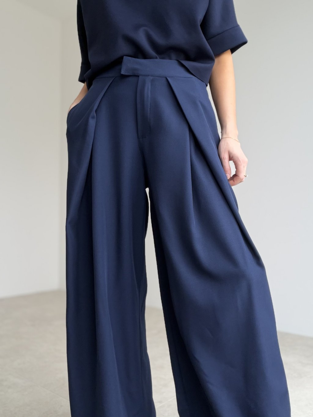 Eleganckie spodnie z bardzo szerokimi nogawkami to świetny wybór dla kobiet, które cenią wygodę i jednocześnie dopracowany, kobiecy wygląd. Z przodu prezentują się bardzo stylowo dzięki czystej linii kroju i delikatnym zakładkom w pasie, które tworzą piękny, lejący efekt podczas chodzenia. Krój optycznie wydłuża sylwetkę i nadaje stylizacji elegancki charakter.