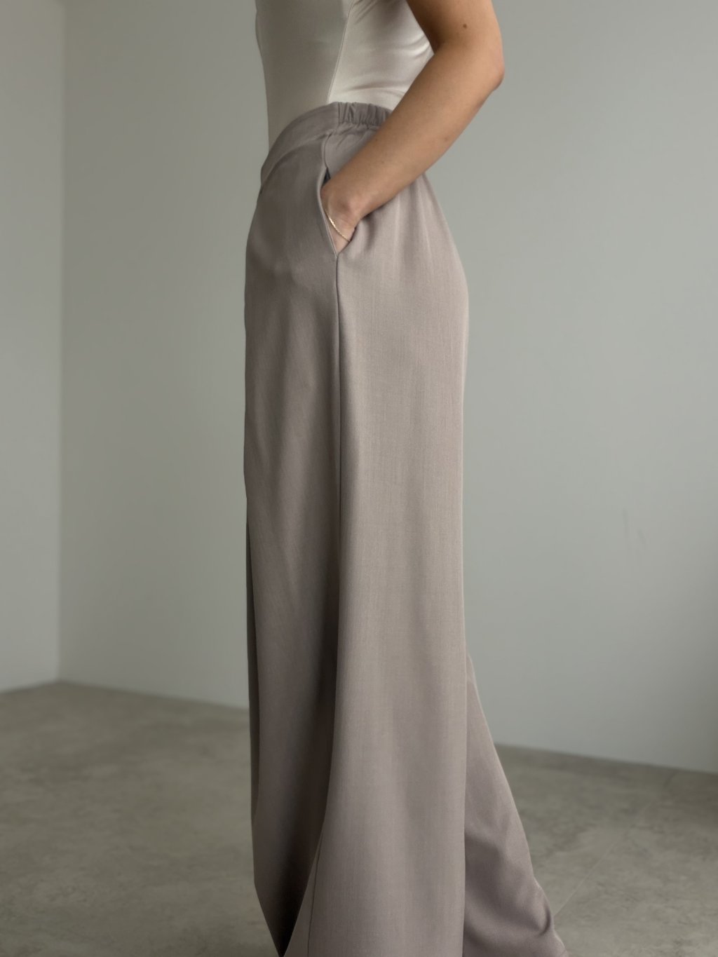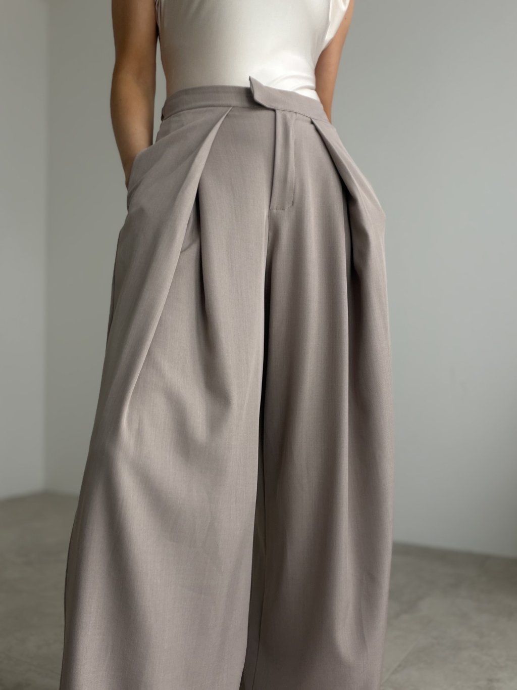 Eleganckie szerokie spodnie o lejącym fasonie i wygodnym kroju. Zakładki z przodu nadają modelowi stylowy wygląd, a elastyczna tylna część pasa zapewnia komfort noszenia.