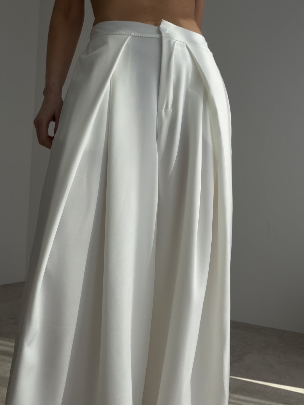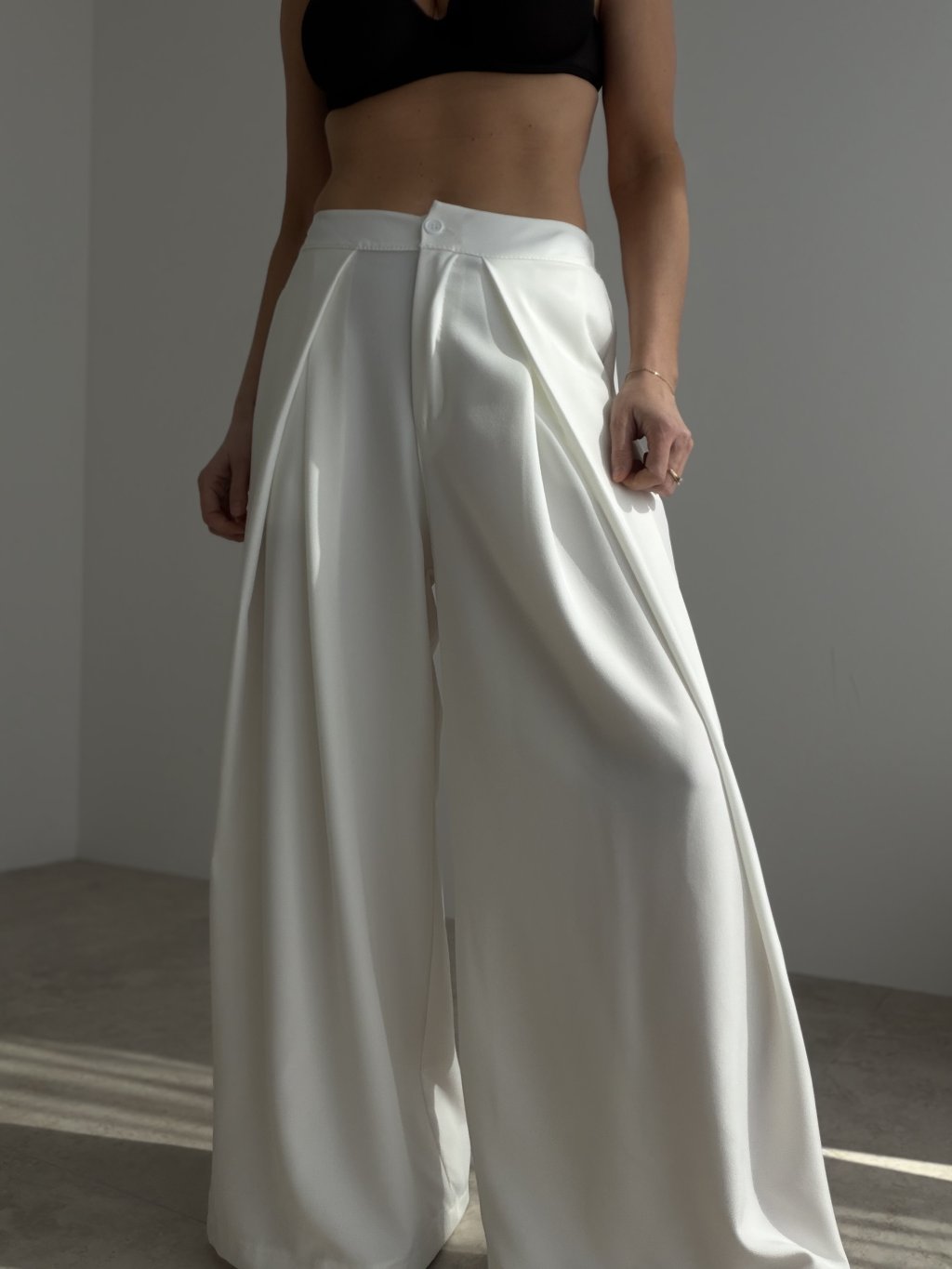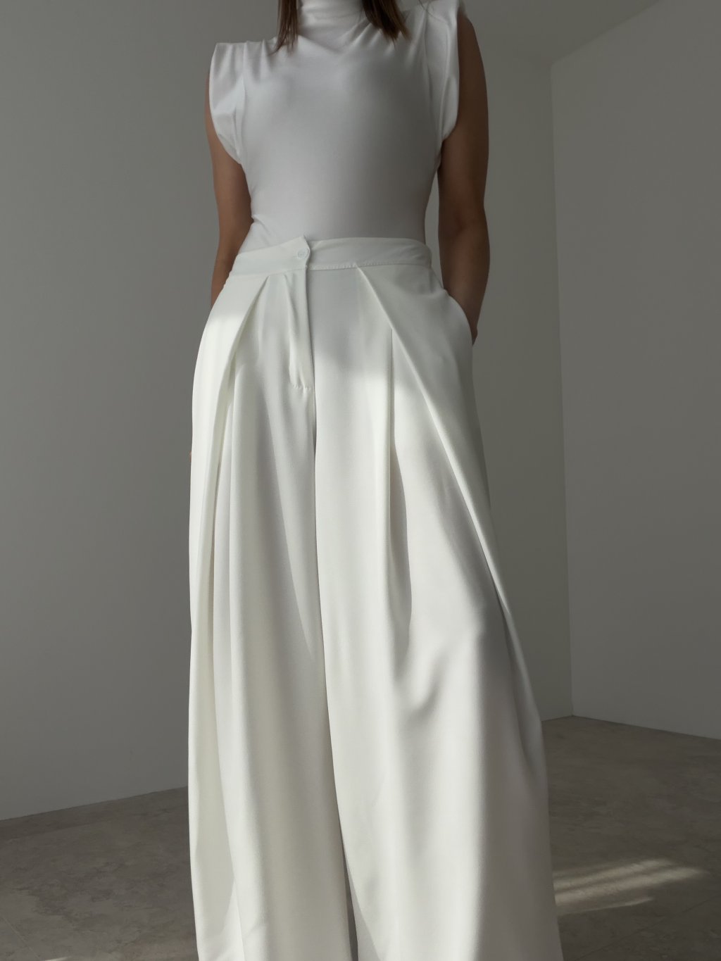 Szerokie spodnie to efektowny i ponadczasowy element garderoby, który dodaje stylizacji elegancji, kobiecego charakteru i nowoczesnego wyglądu. Ich szeroki, lekko opływający fason prezentuje się bardzo stylowo, a jednocześnie zapewnia wygodę noszenia. Z przodu wyglądają elegancko i schludnie, natomiast tylna część pasa została wykończona gumą, dzięki czemu spodnie lepiej dopasowują się do sylwetki i pozostają komfortowe przez cały dzień. Ten model doskonale sprawdzi się zarówno w eleganckich, jak i minimalistycznych stylizacjach i z łatwością połączysz go z body, topem, bluzką lub marynarką.