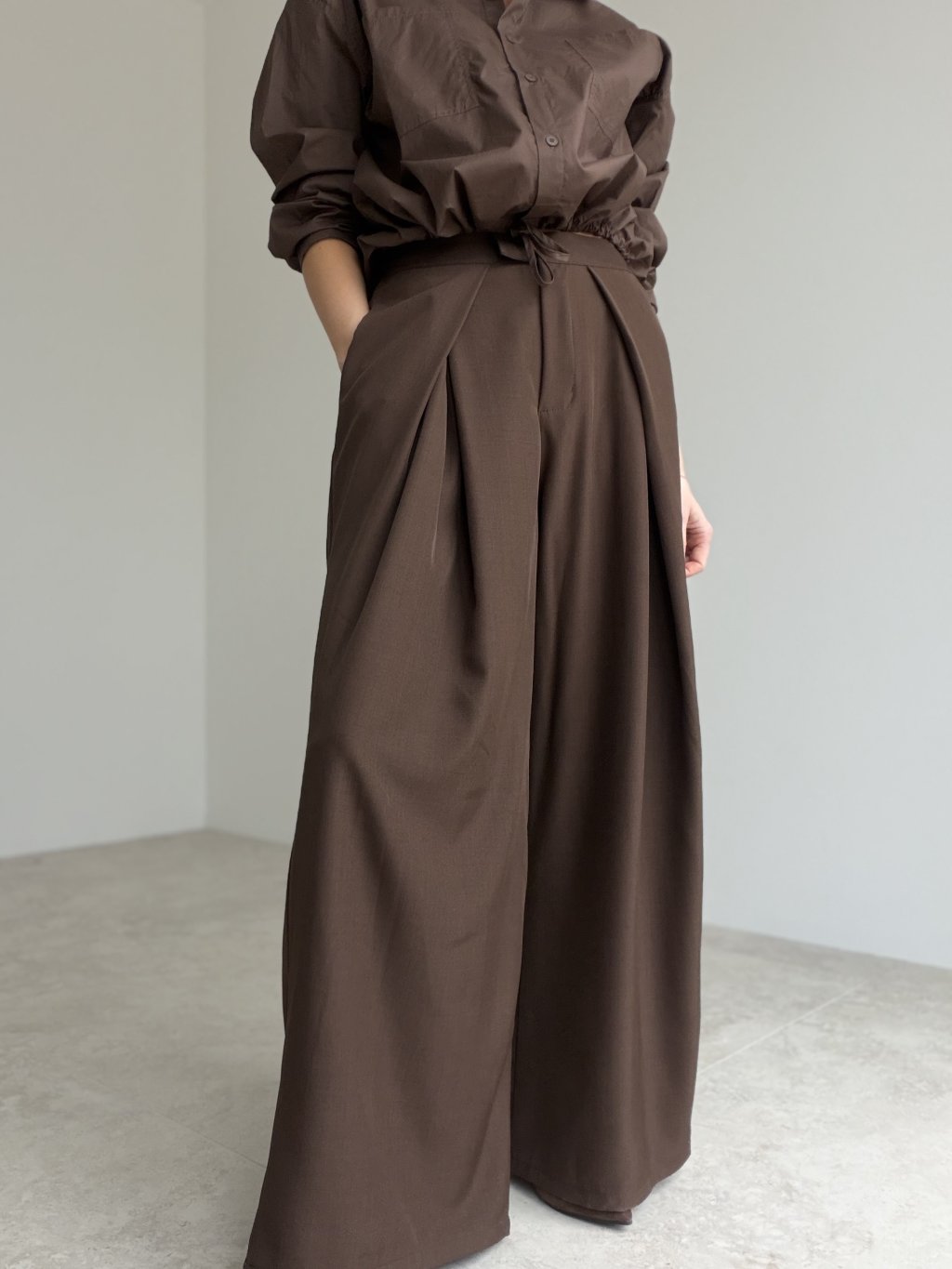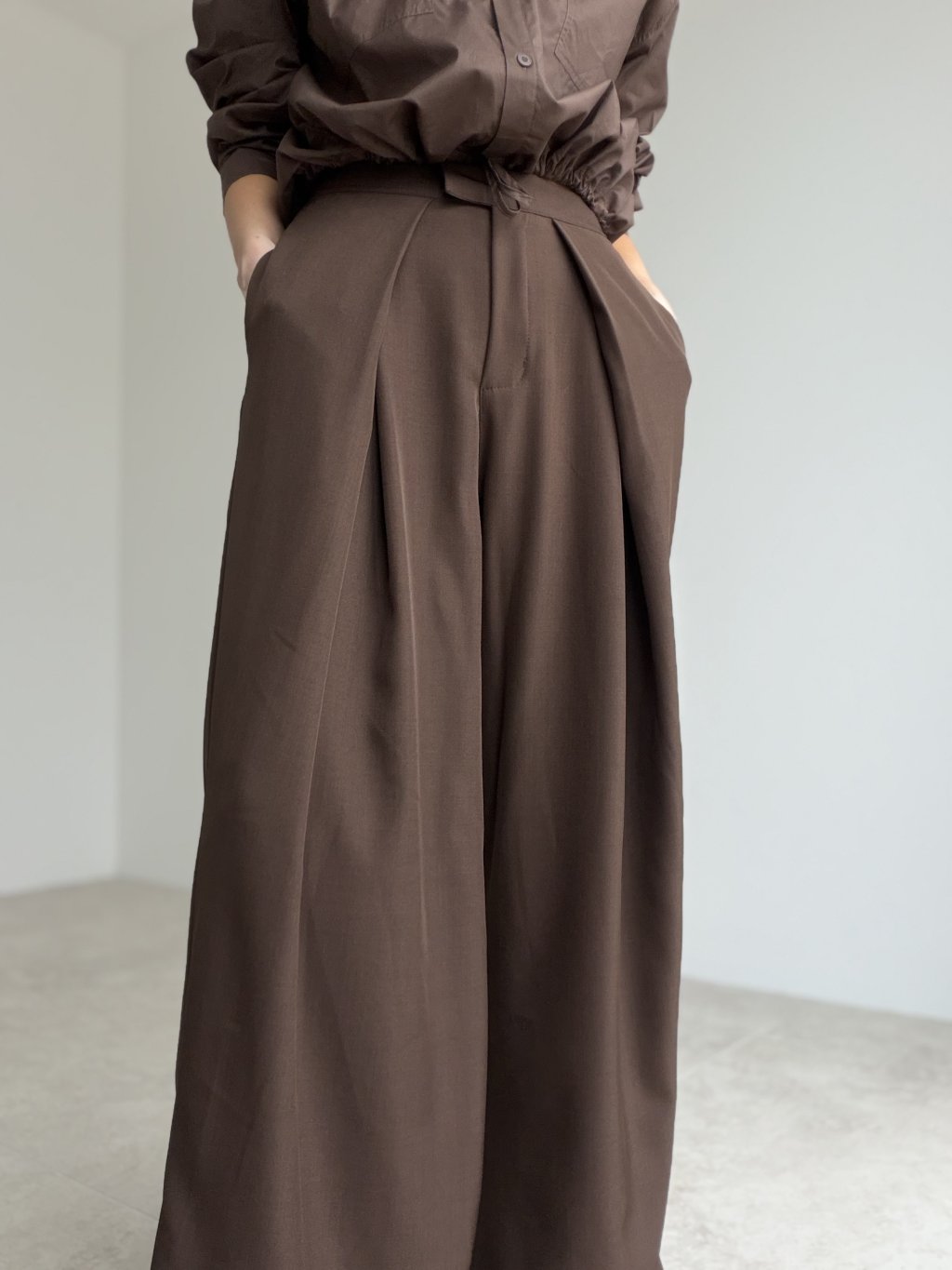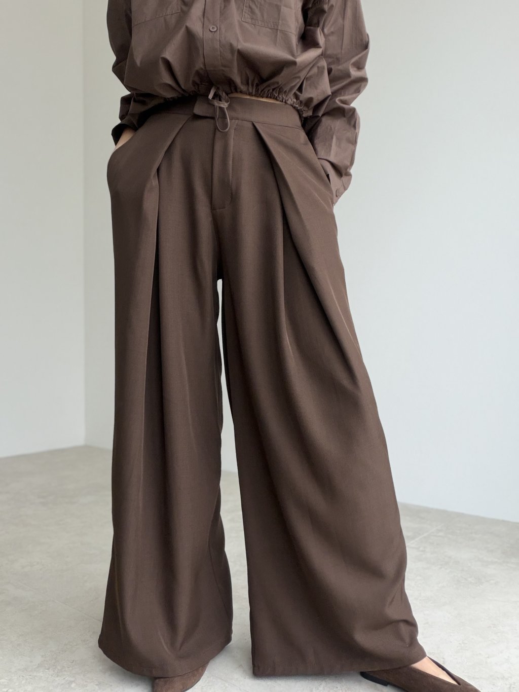Eleganckie szerokie spodnie o lejącym fasonie i wygodnym kroju. Zakładki z przodu nadają modelowi stylowy wygląd, a elastyczna tylna część pasa zapewnia komfort noszenia.
