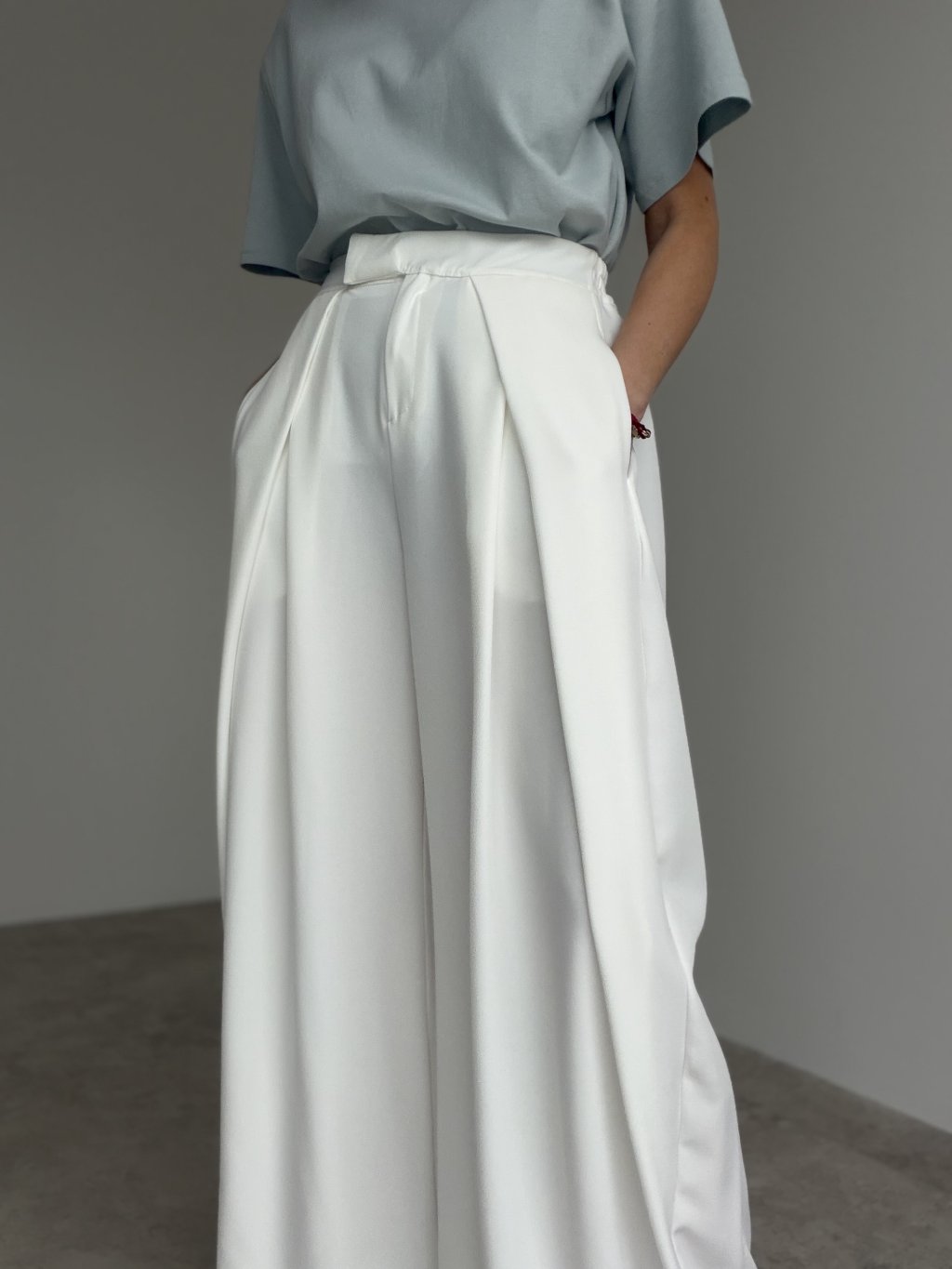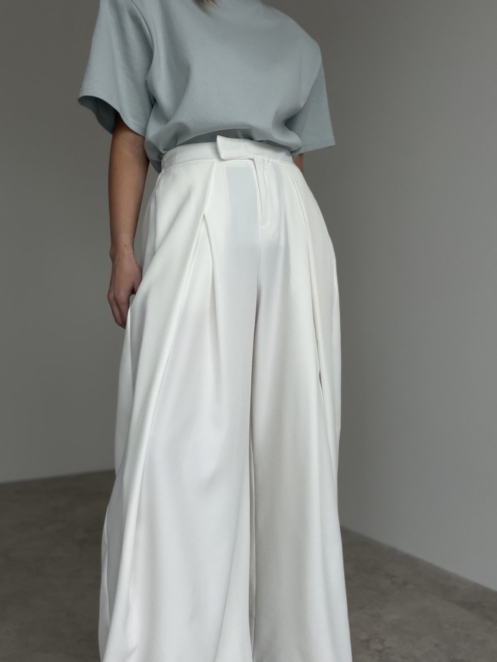 Spodnie wide z wysokim stanem i zakładkami z przodu, które tworzą elegancką sylwetkę. Szeroka nogawka układa się lekko i pasuje zarówno na co dzień, jak i na bardziej formalne wyjścia.