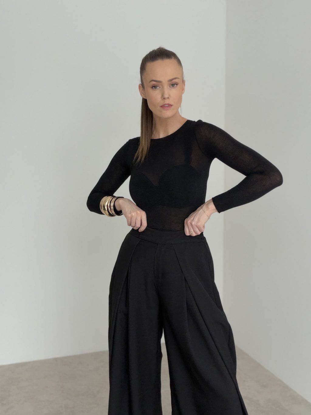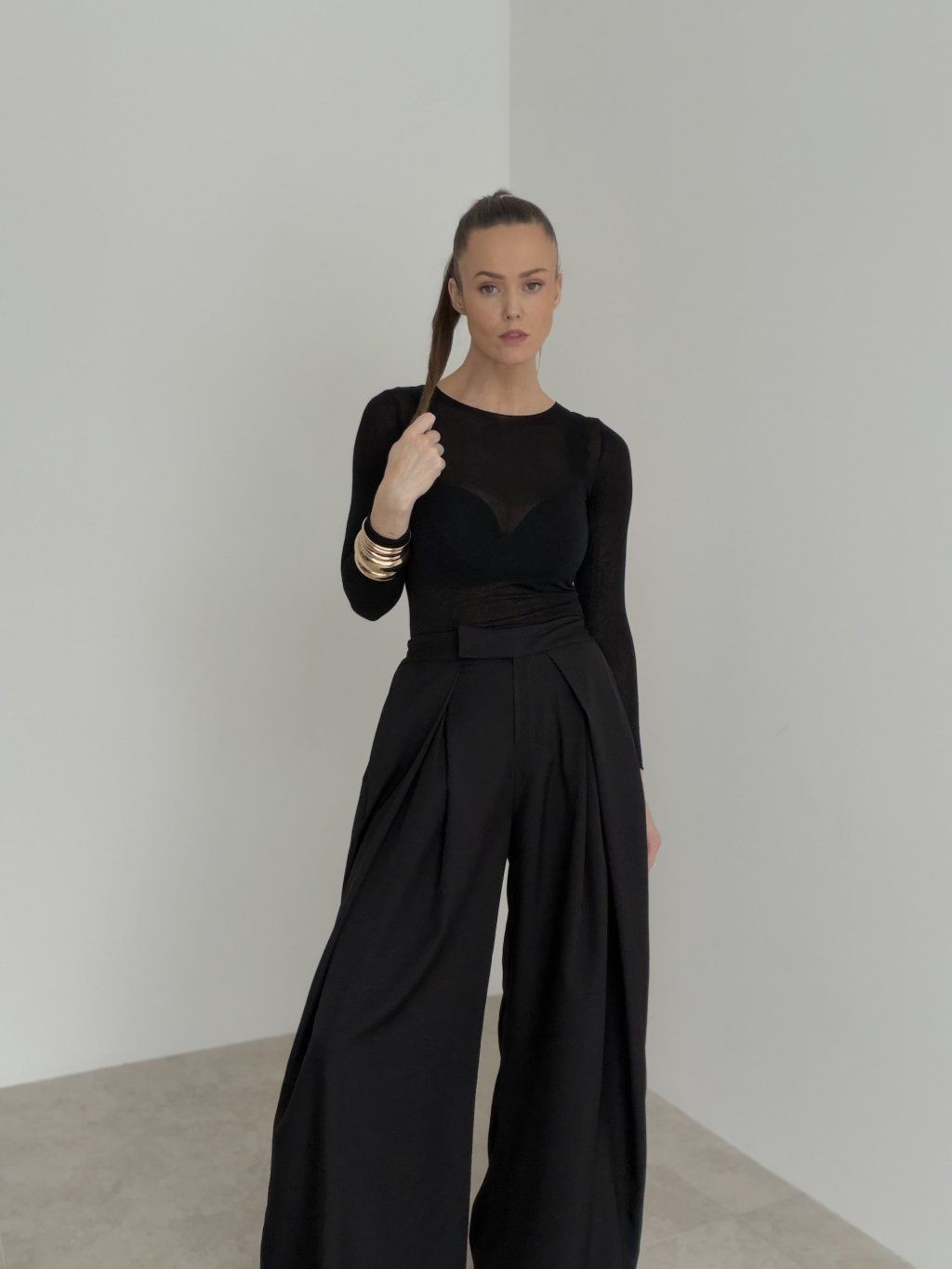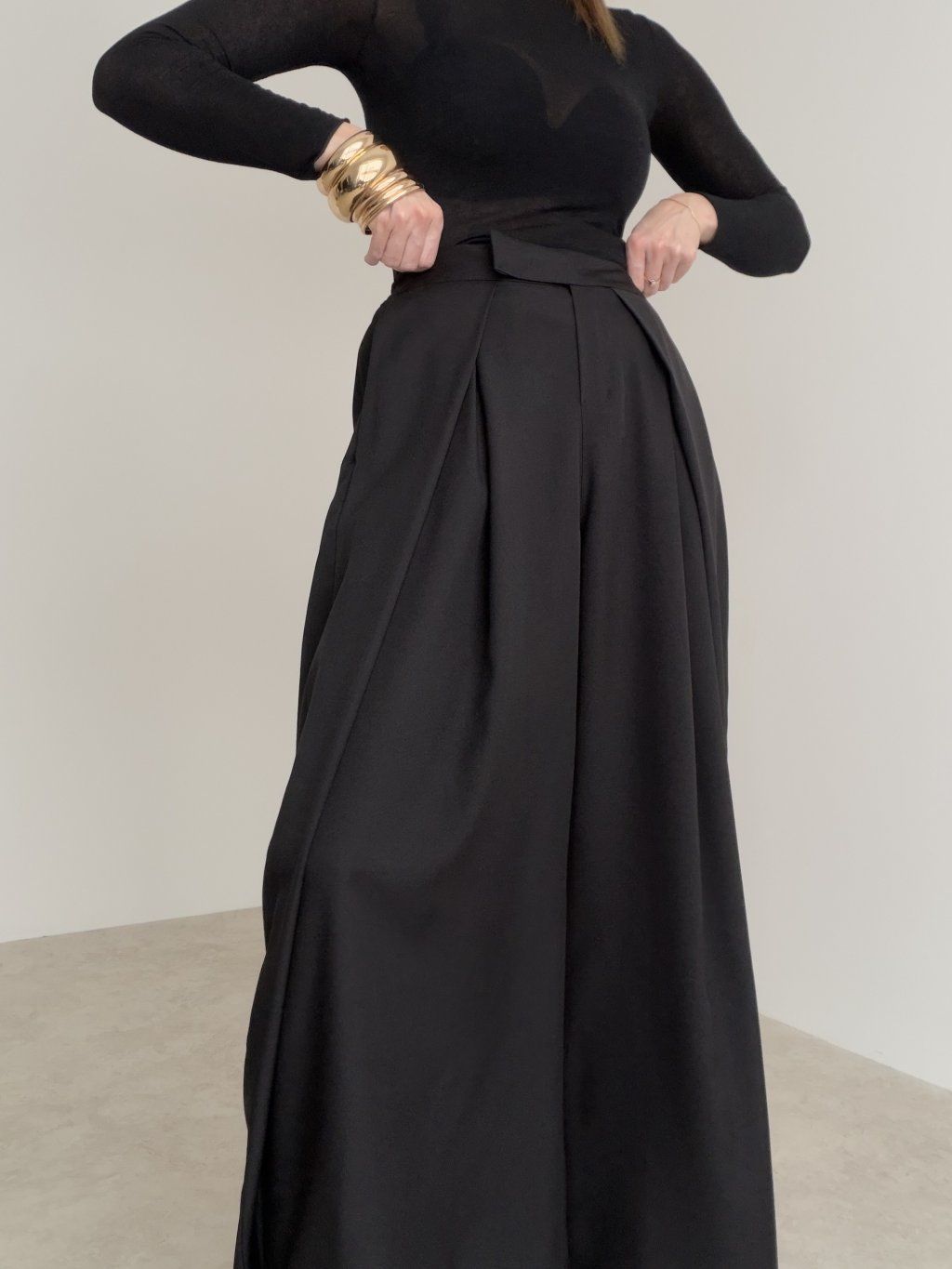 Spodnie wide z wysokim stanem i zakładkami z przodu, które tworzą elegancką sylwetkę. Szeroka nogawka układa się lekko i pasuje zarówno na co dzień, jak i na bardziej formalne wyjścia.