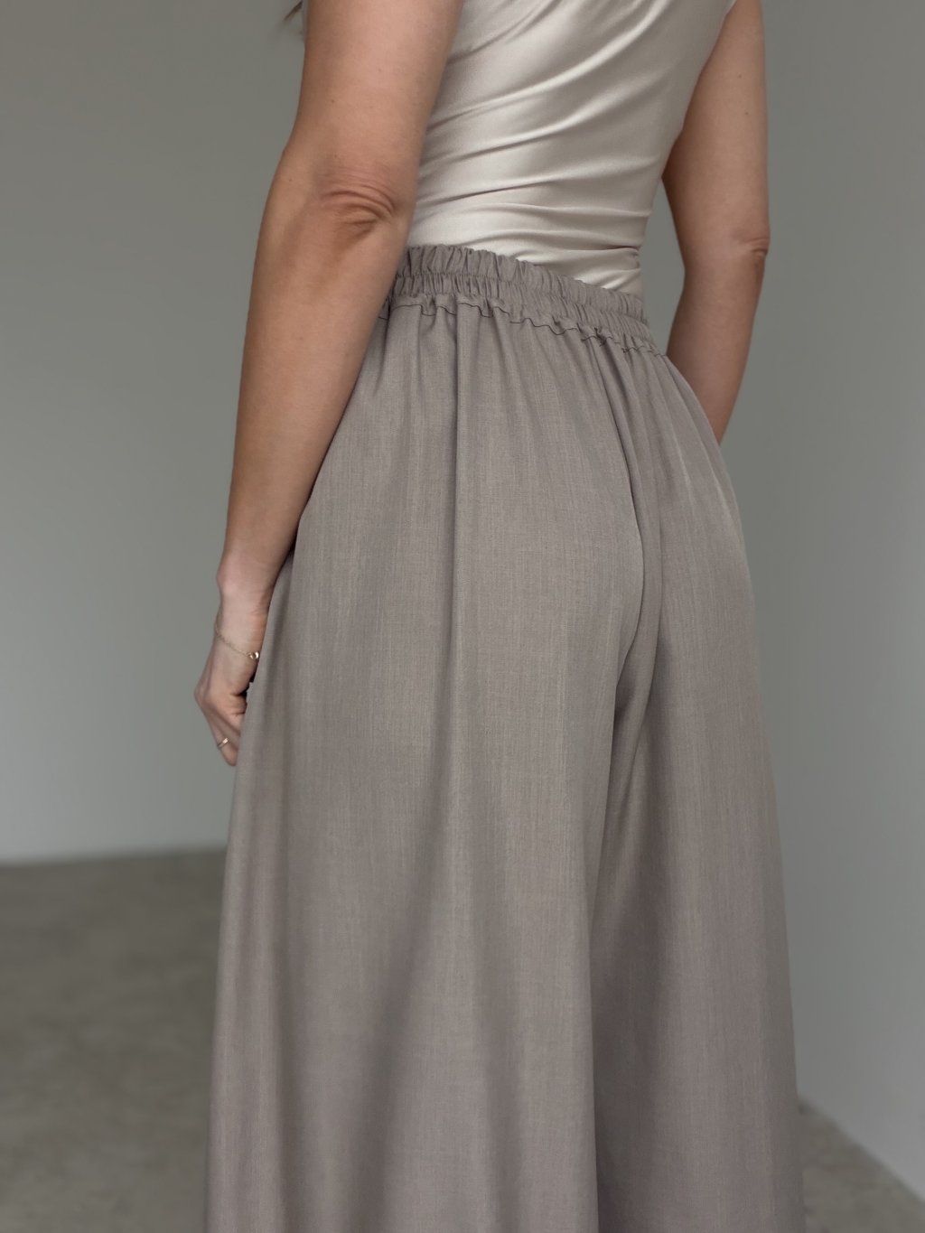Te spodnie typu wide to mocny, a jednocześnie ponadczasowy wybór do eleganckich i wygodnych stylizacji. Mają wysoki stan oraz dopracowane zakładki z przodu, które pięknie modelują sylwetkę i nadają całości krawiecki, wyrafinowany charakter. Szeroka nogawka wygląda lekko, świetnie układa się w ruchu i optycznie wydłuża nogi. Dzięki eleganckiemu krojowi sprawdzą się do pracy, na spotkanie oraz na wieczór — wystarczy zmienić górę i dodatki. Najlepiej wyglądają z koszulą włożoną w pas, z gładkim golfem lub z marynarką.