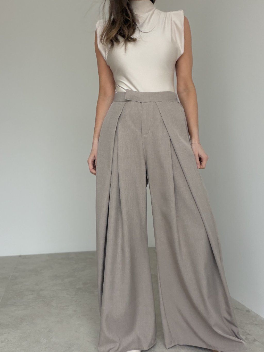 Spodnie wide z wysokim stanem i zakładkami z przodu, które tworzą elegancką sylwetkę. Szeroka nogawka układa się lekko i pasuje zarówno na co dzień, jak i na bardziej formalne wyjścia.