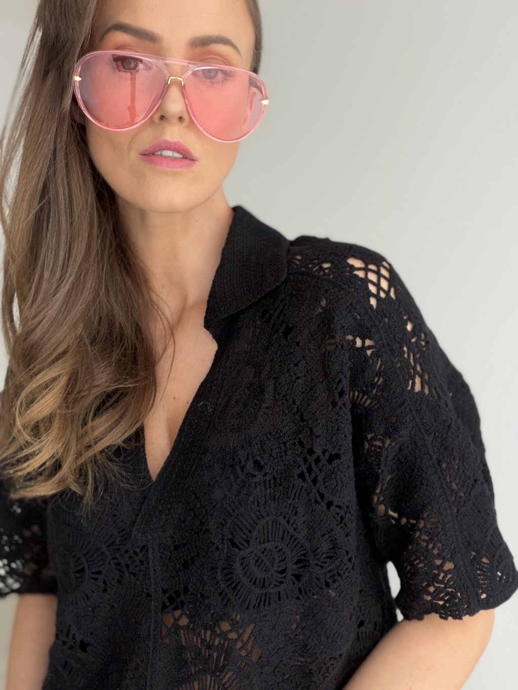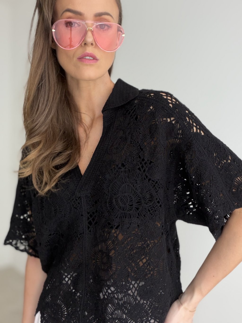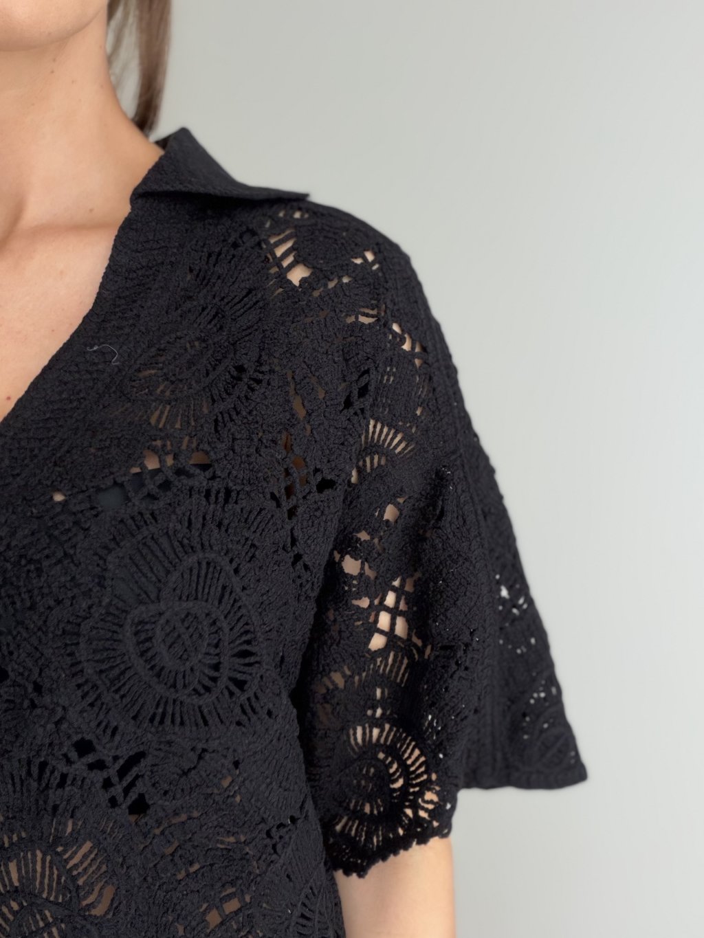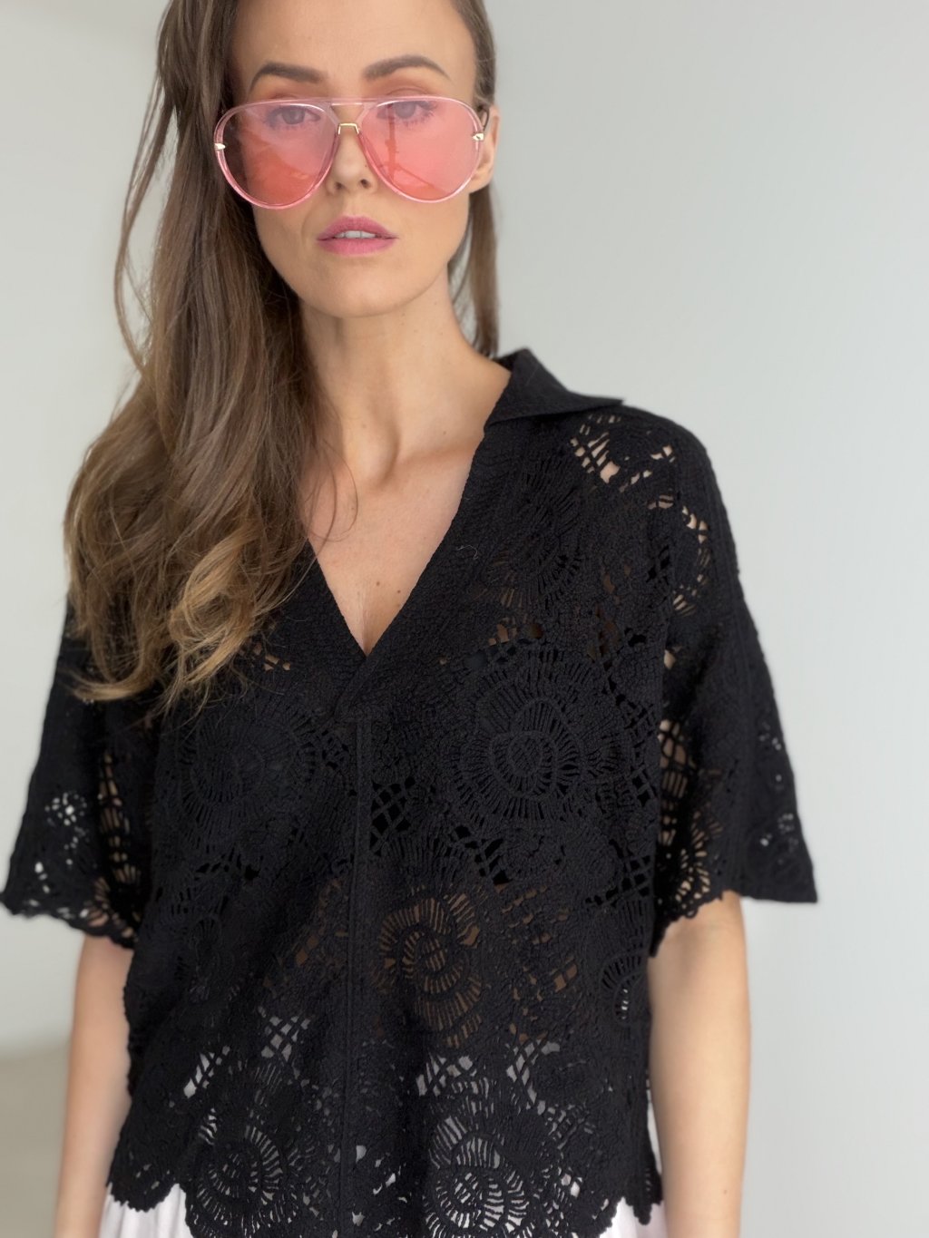 Lekki top szydełkowy o wyrazistej fakturze i delikatnej przejrzystości wygląda zwiewnie, a jednocześnie bardzo elegancko. Luźniejszy krój z krótkim rękawem zapewnia komfort noszenia, a subtelny kołnierzyk i dekolt w serek ułatwiają stylizowanie na co dzień i na wyjazdy. Ozdobny ażurowy wzór oraz wykończenie dołu nadają całości charakteru nawet w połączeniu z prostymi elementami garderoby.