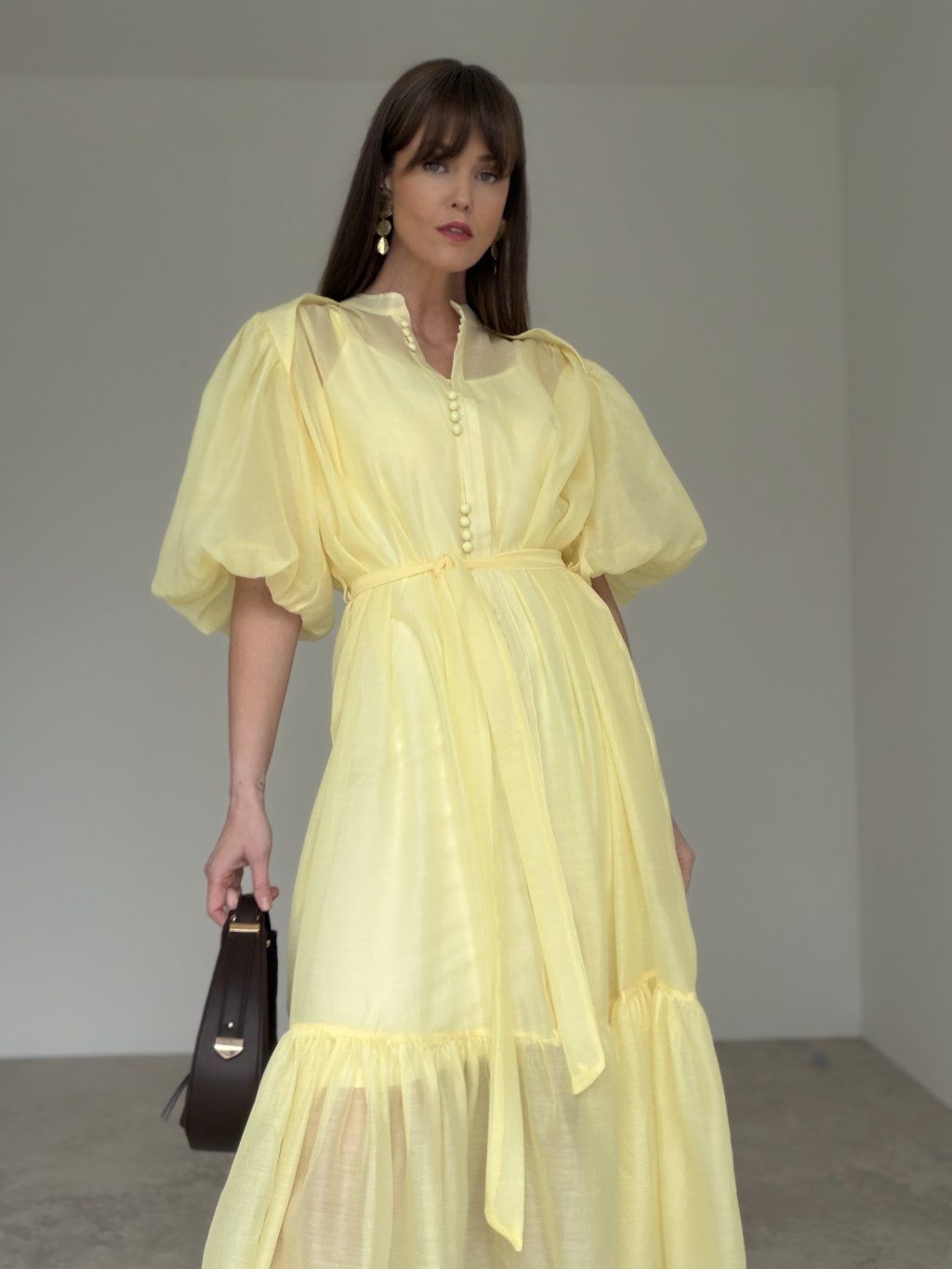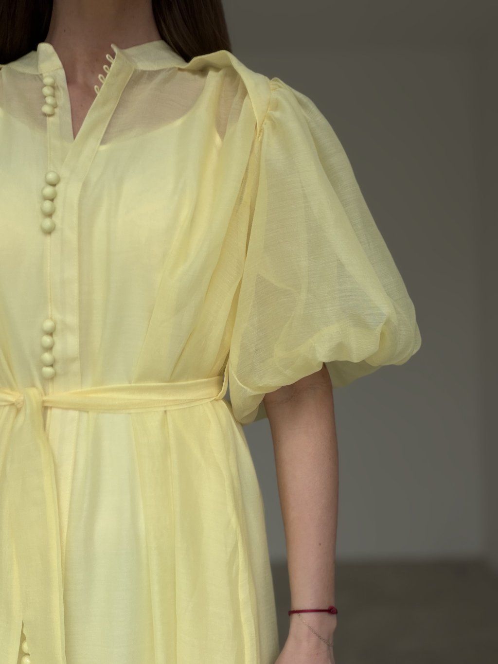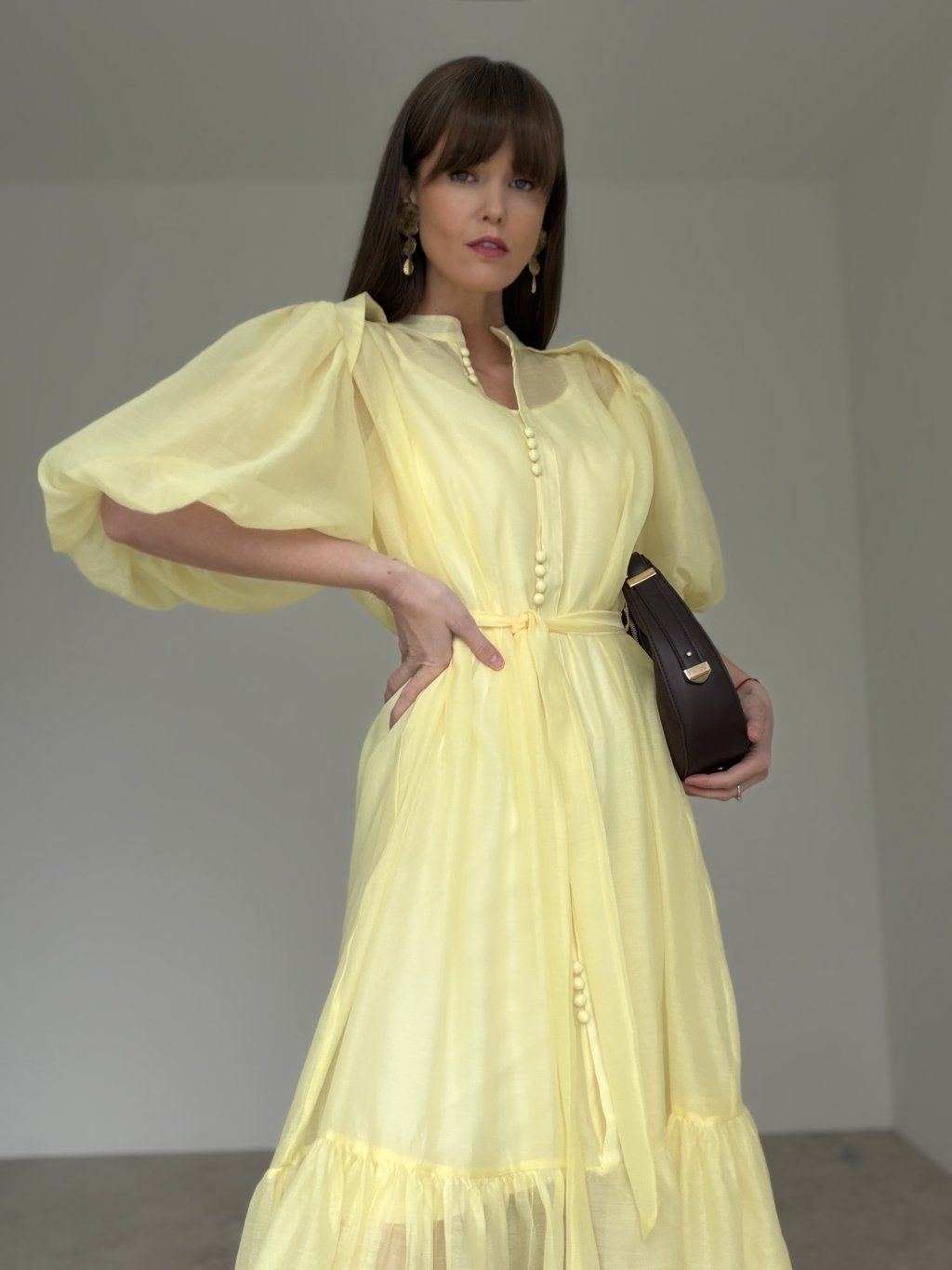 Ta sukienka prezentuje się bardzo delikatnie, romantycznie i elegancko. Ma lekki, zwiewny charakter, który od pierwszego spojrzenia daje subtelny i wysmakowany efekt. Wyrazistym elementem są bufiaste rękawy, które dodają modelowi objętości, kobiecości i modowego charakteru. Wiązanie w talii pięknie podkreśla sylwetkę, a lejący dół tworzy miękki i efektowny ruch podczas chodzenia. Całość wygląda bardzo schludnie, odświętnie i jednocześnie nowocześnie.