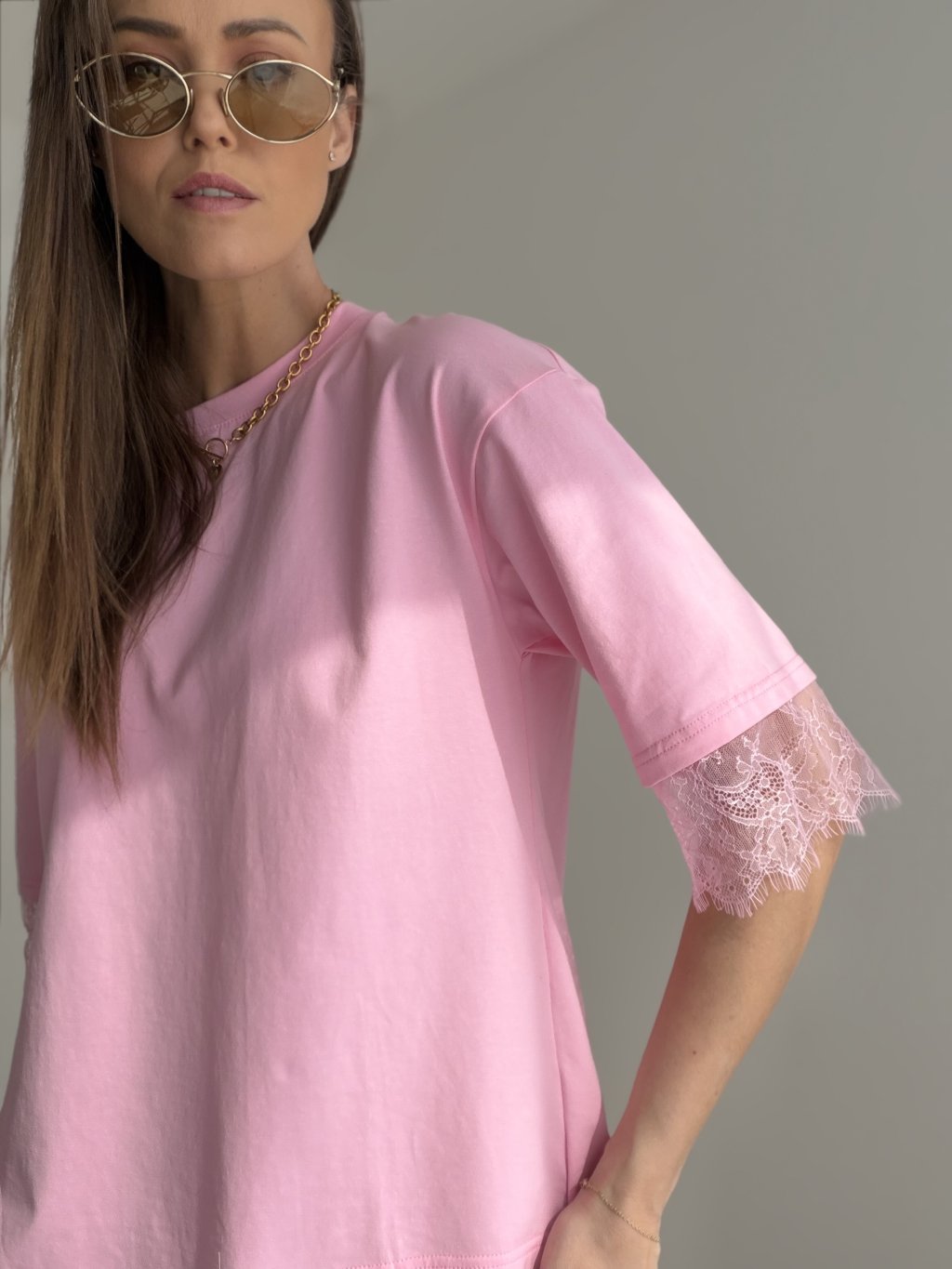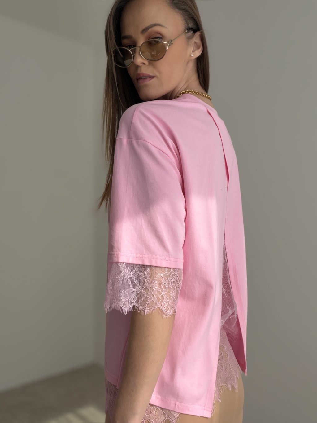 T-shirt z koronką to wyjątkowy model, który łączy komfort bawełnianego materiału z delikatnymi, kobiecymi detalami. Na pierwszy rzut oka prezentuje się prosto i minimalistycznie, jednak koronkowe wykończenie oraz efektownie zaprojektowany tył nadają mu oryginalnego i eleganckiego charakteru. Luźniejszy krój zapewnia wygodę przez cały dzień, a romantyczne akcenty sprawiają, że ten model wyróżnia się w każdej garderobie.