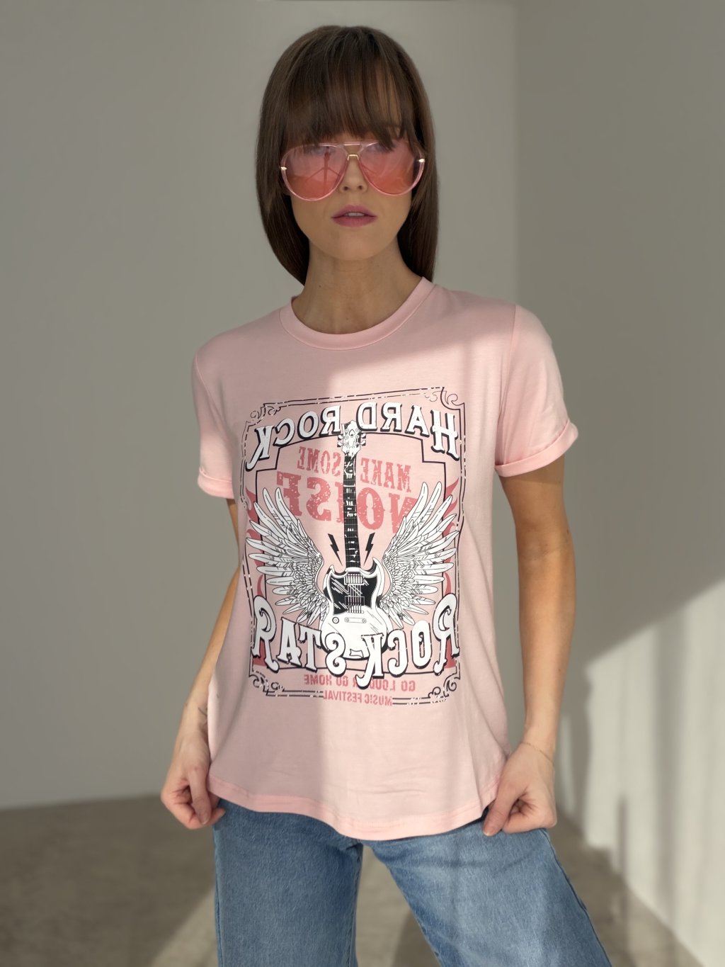 Wygodny t-shirt z nadrukiem, okrągłym dekoltem i krótkim rękawem. Uniwersalny model do codziennego noszenia.