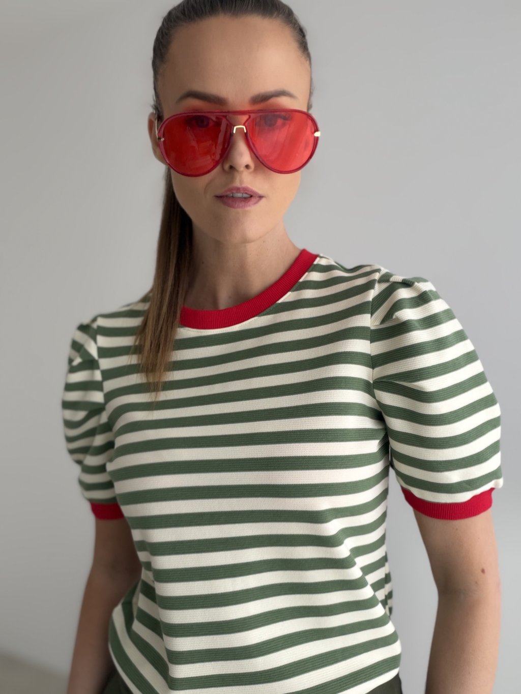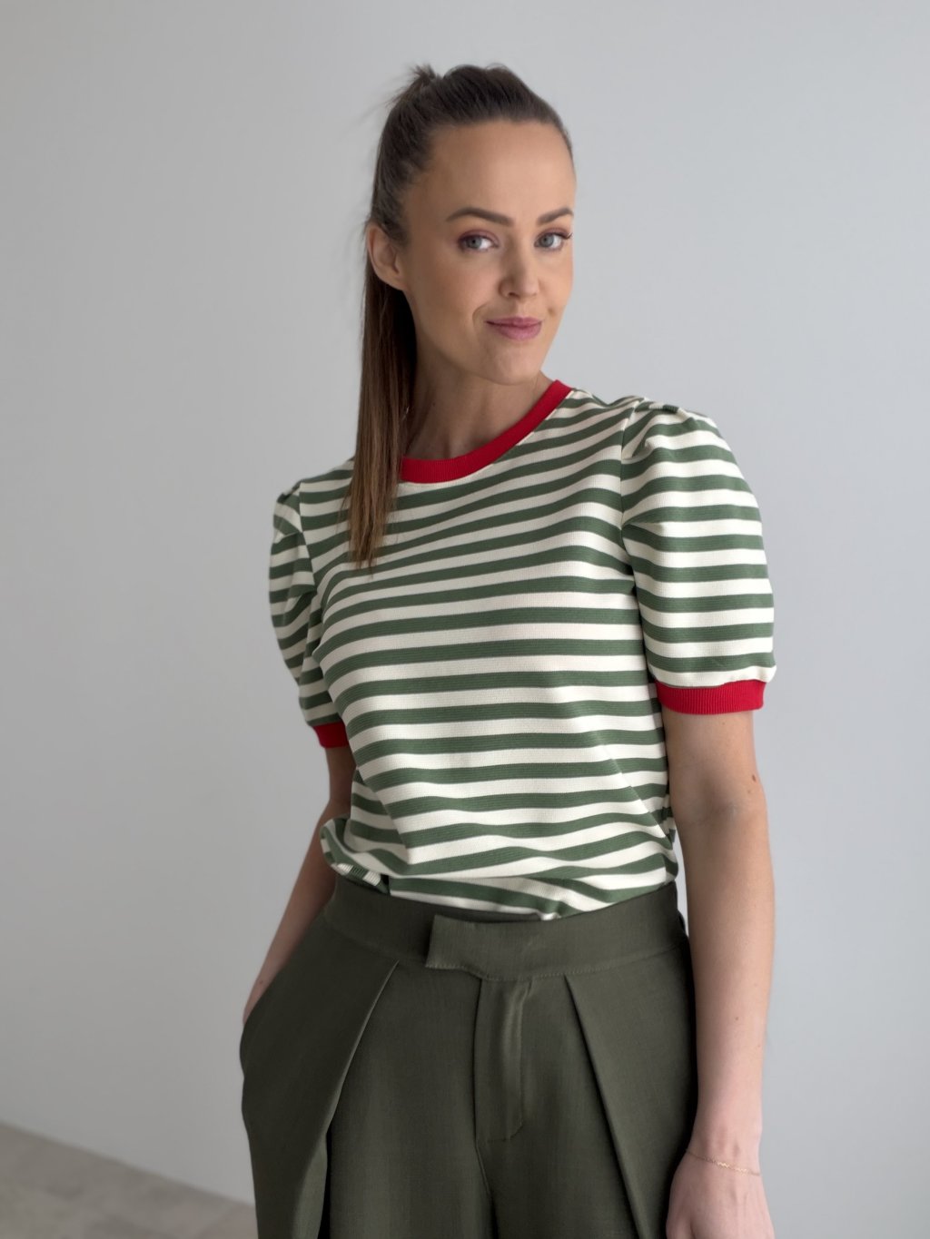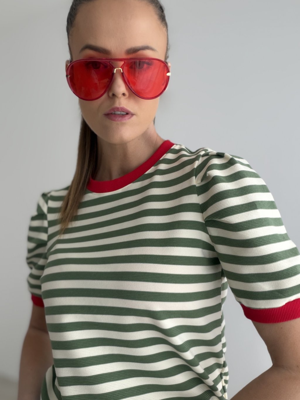 Top w paski o delikatnie strukturalnej fakturze to wygodna baza, która wygląda bardzo dopracowanie. Ma klasyczny, okrągły dekolt wykończony ściągaczem oraz krótkie rękawy z lekkim marszczeniem przy ramionach, dzięki czemu sylwetka prezentuje się kobieco i nowocześnie. Ściągacze utrzymują formę i dodają całości bardziej „premium” charakteru. Krój jest komfortowy i łatwy do stylizacji na co dzień, świetnie pasuje do jeansów, spodni z wysokim stanem i spódnic.