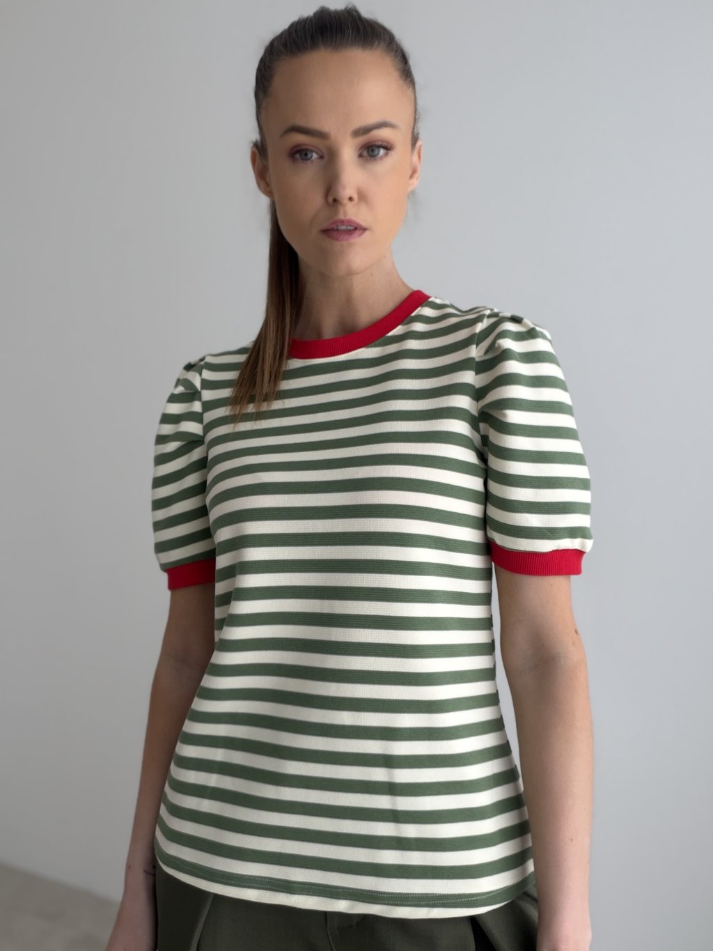 Top w paski o strukturalnej fakturze z okrągłym dekoltem i ściągaczami. Krótkie rękawy z lekkim marszczeniem przy ramionach tworzą kobiecą, nowoczesną formę.