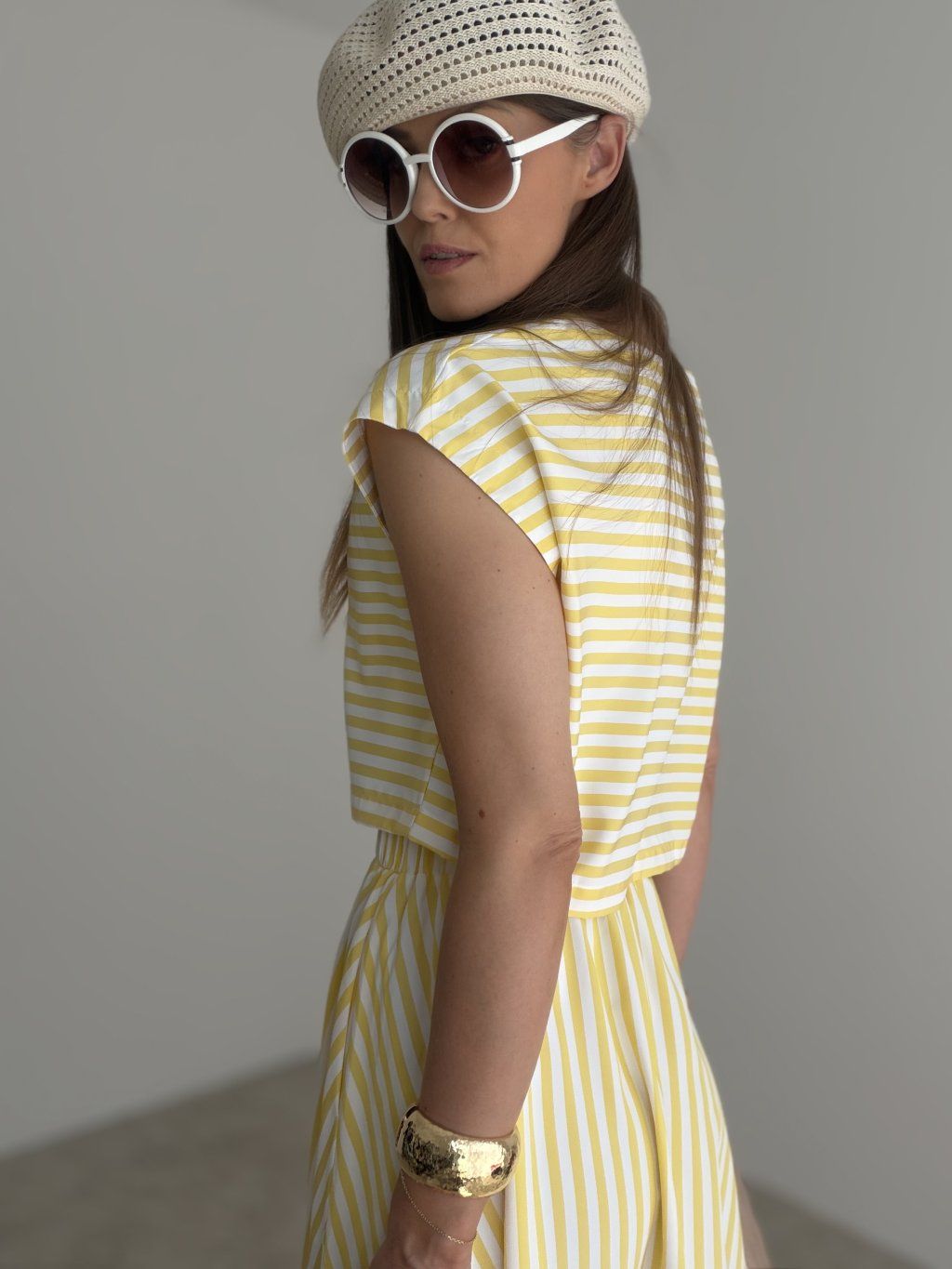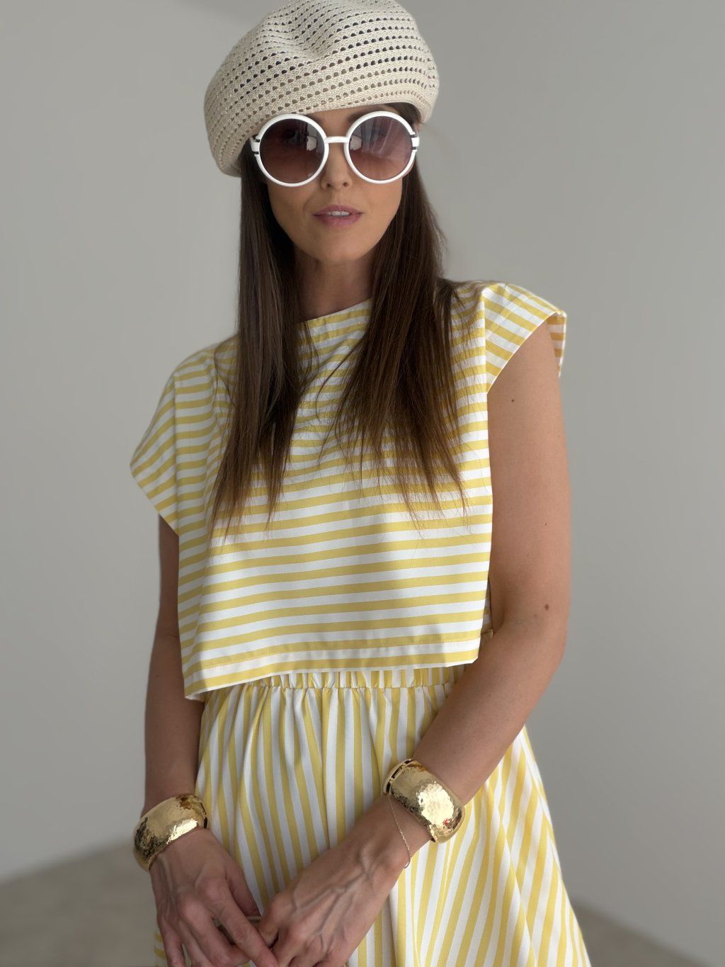 Top w paski o krótszym, luźniejszym kroju, z okrągłym dekoltem i swobodnymi rękawami. Świeży i wygodny model na letnie dni oraz codzienne stylizacje.