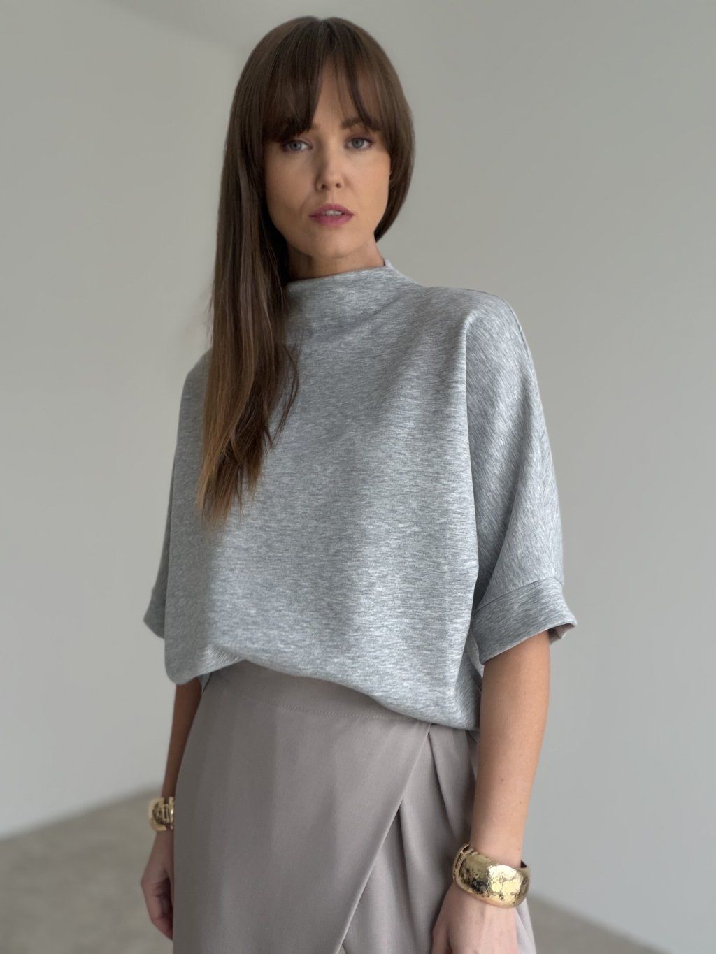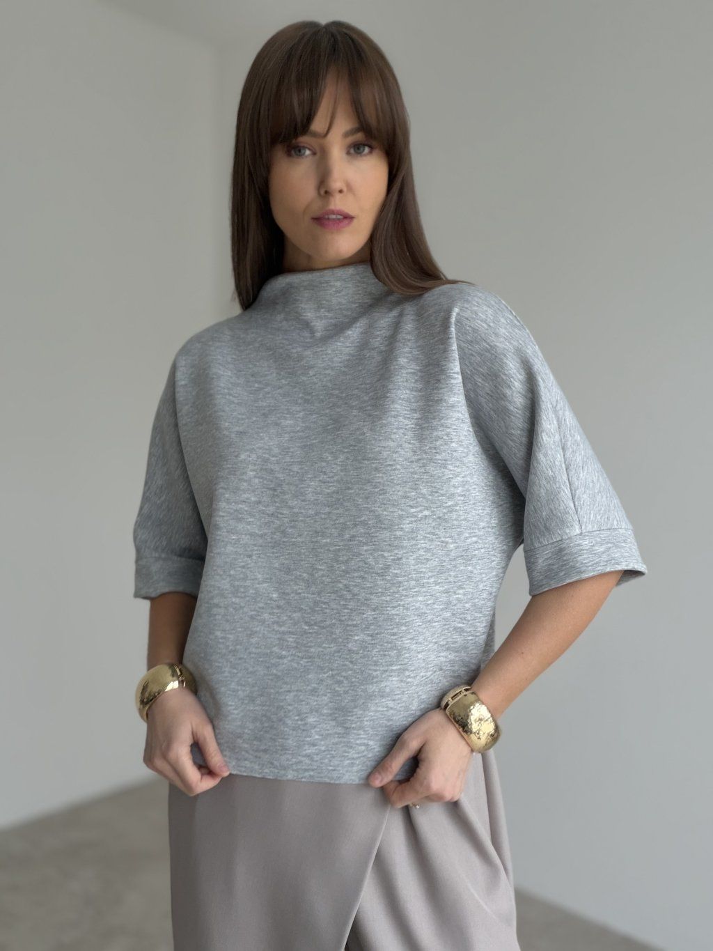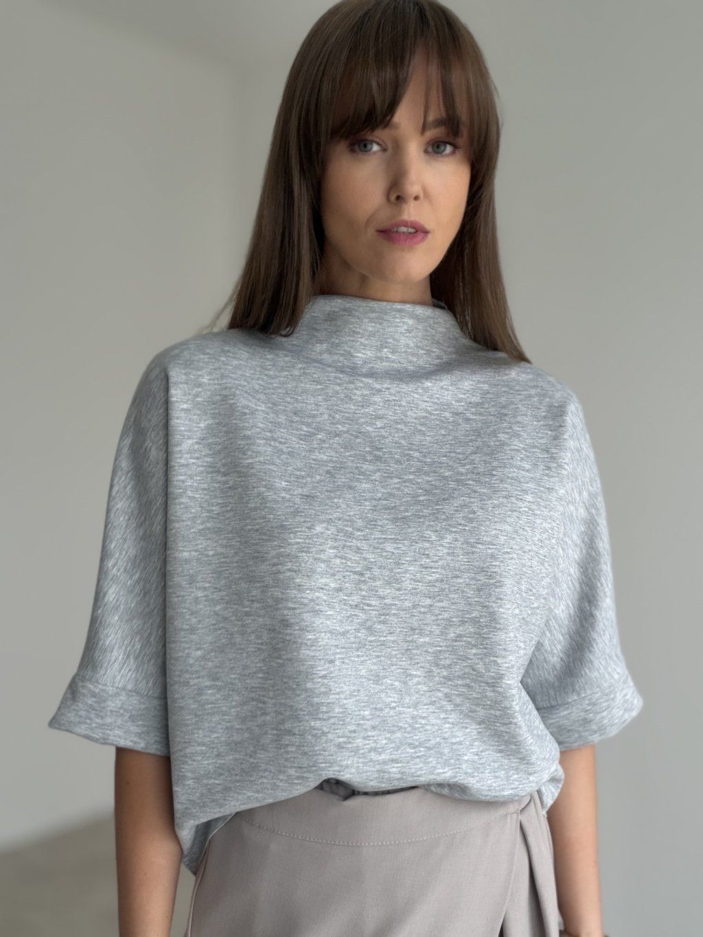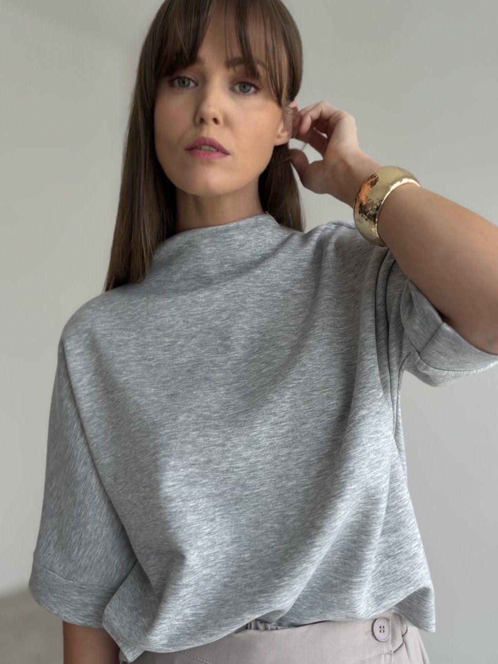 Top ze stójką o luźniejszym kroju i szerszych rękawach z mankietem. Minimalistyczny, wygodny i łatwy do stylizacji.