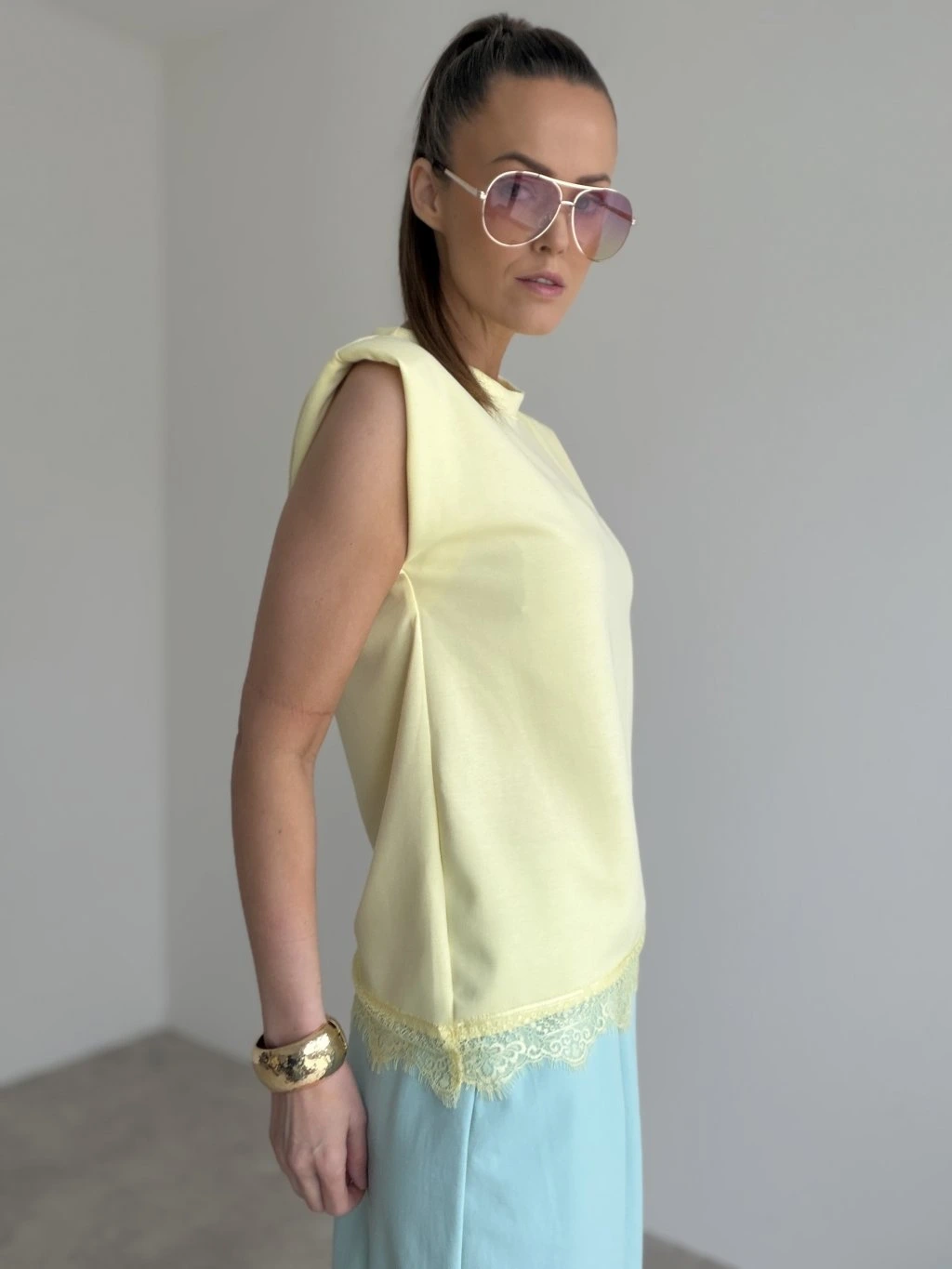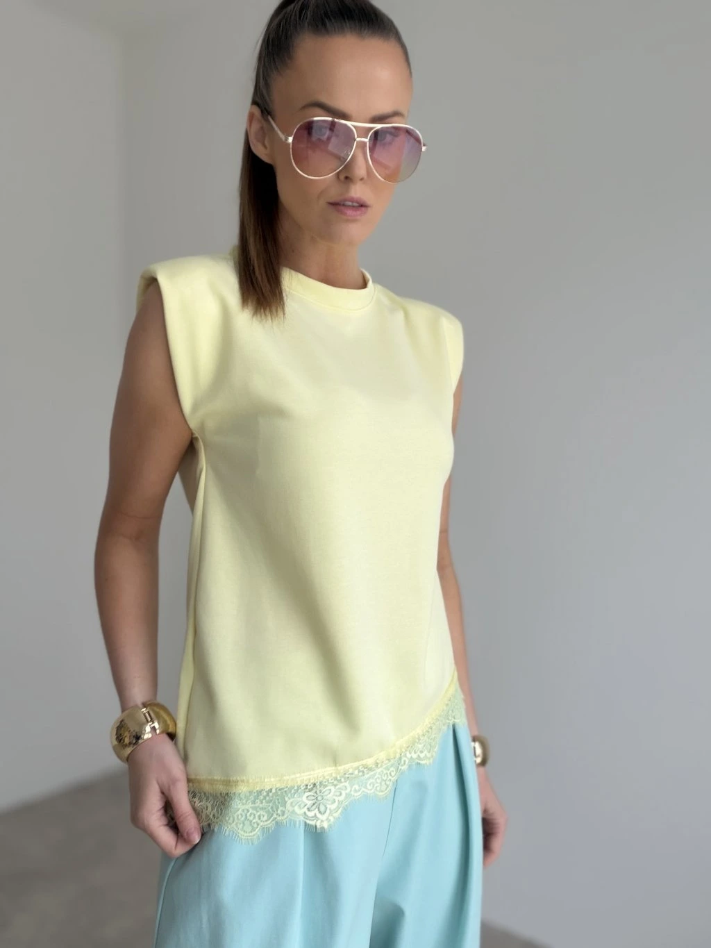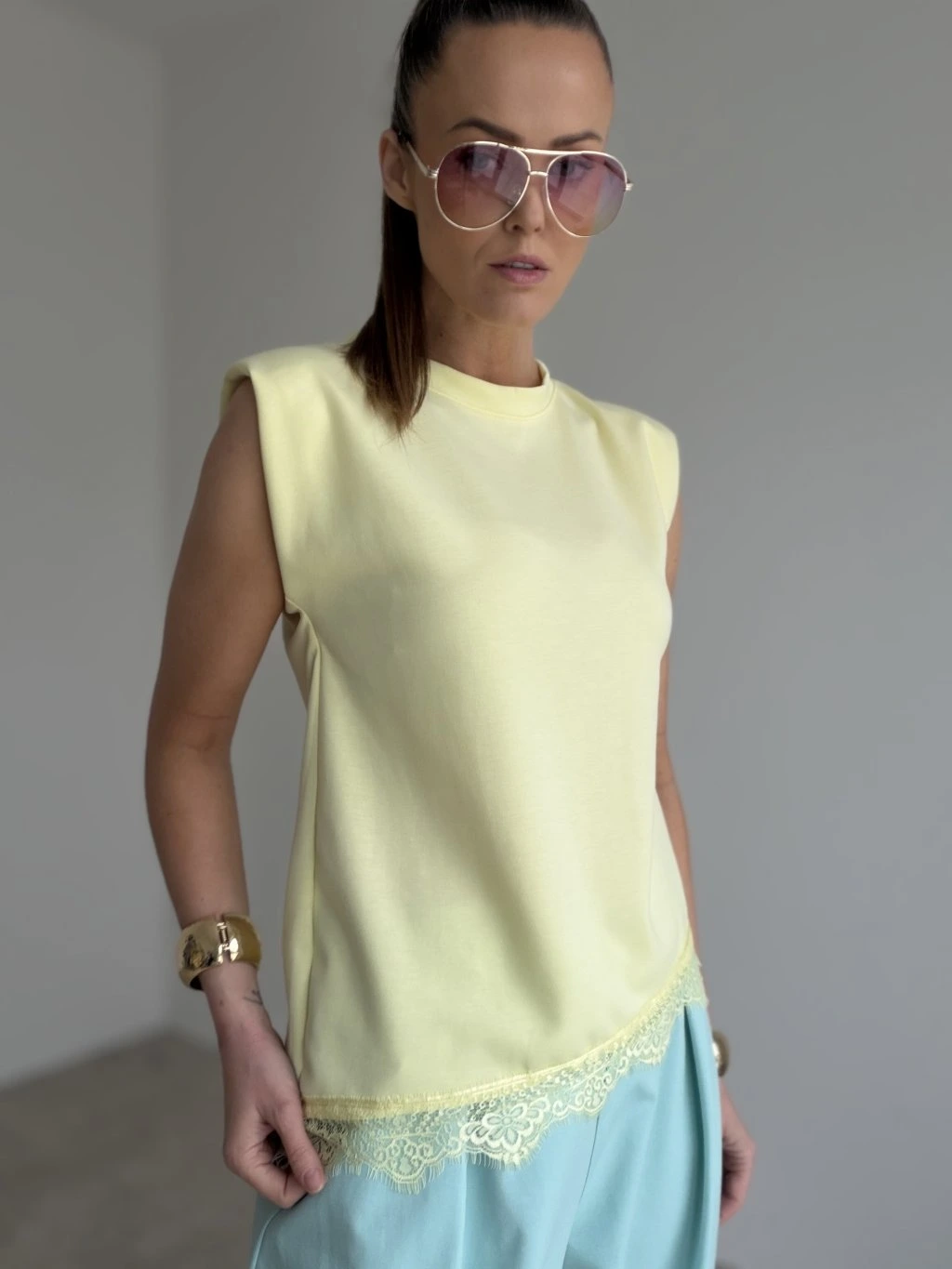 Elegancki top bez rękawów z delikatnym koronkowym detalem u dołu. Kobiecy i uniwersalny model, który łatwo dopasować do codziennych i bardziej eleganckich stylizacji.