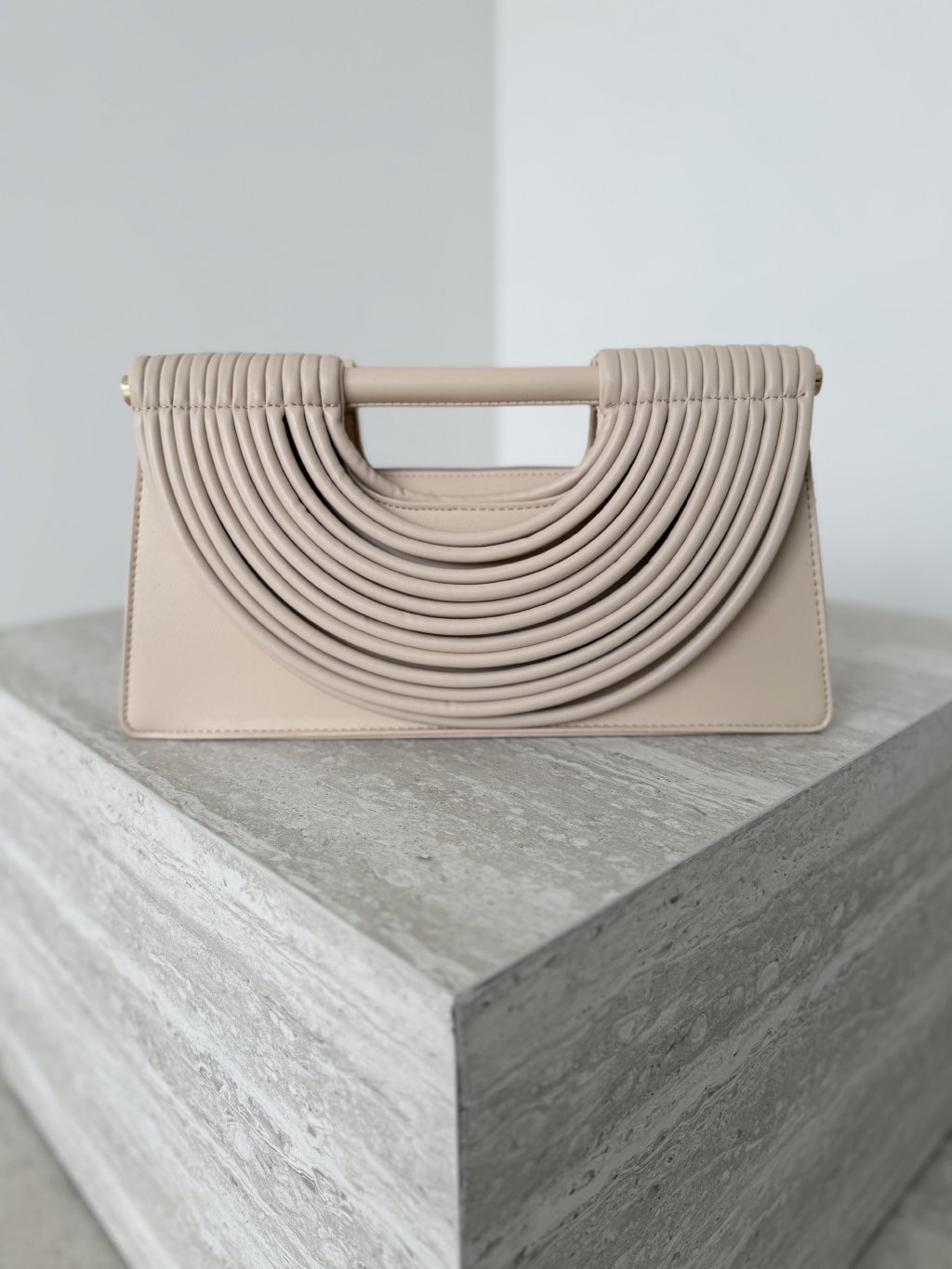 Sztywna torebka z efektownym, przestrzennym przodem, górnym uchwytem i odpinanym paskiem. Zapięcie na zamek i kompaktowe wnętrze na najpotrzebniejsze rzeczy.