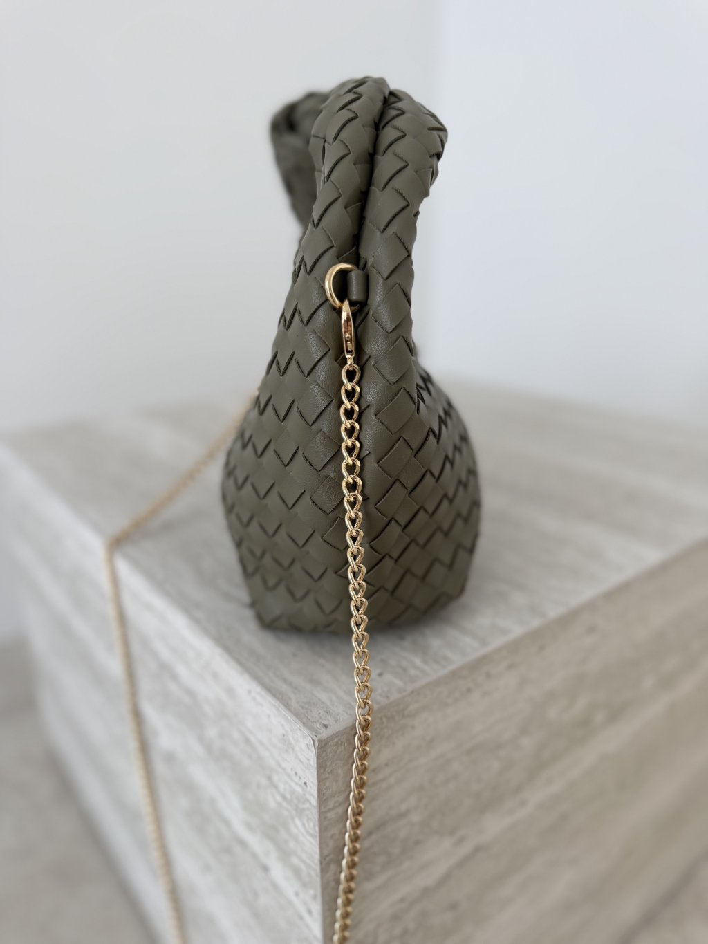Kompaktowa torebka z efektem plecionki i odpinanym łańcuszkiem. Do noszenia w dłoni lub na ramieniu/crossbody, idealna na codzienne niezbędniki.