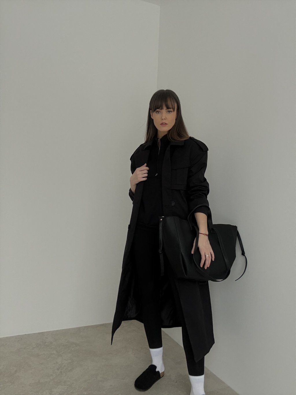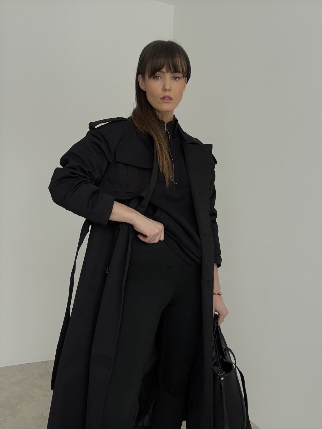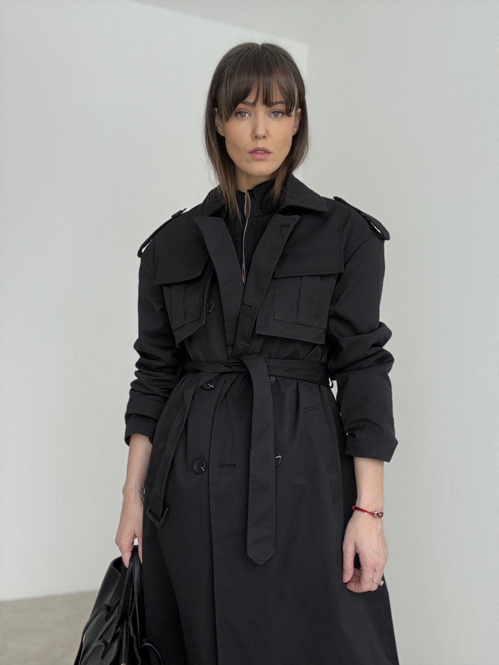 Długi trencz z wiązaniem w talii i praktycznymi kieszeniami, który nadaje stylizacji elegancki, miejski wygląd. Idealny na sezon przejściowy.