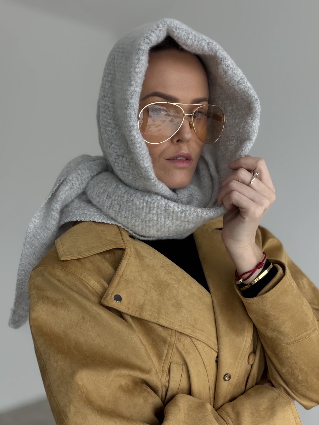 Aby uzyskać efekt kaptura, narzuć szalik na głowę i luźno zawiąż końce lub schowaj je pod kołnierz płaszcza.