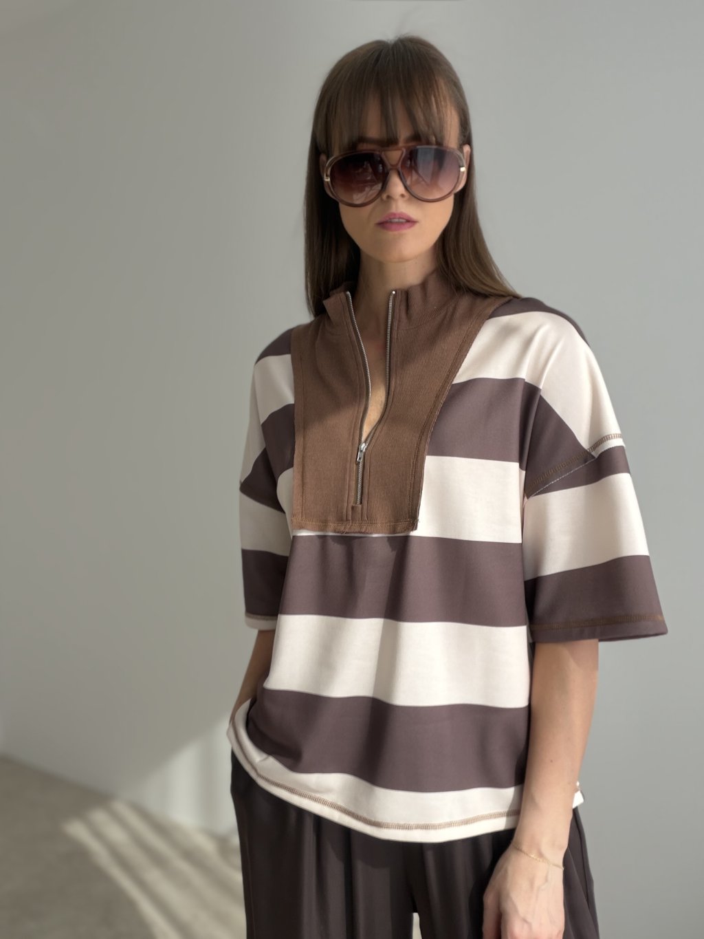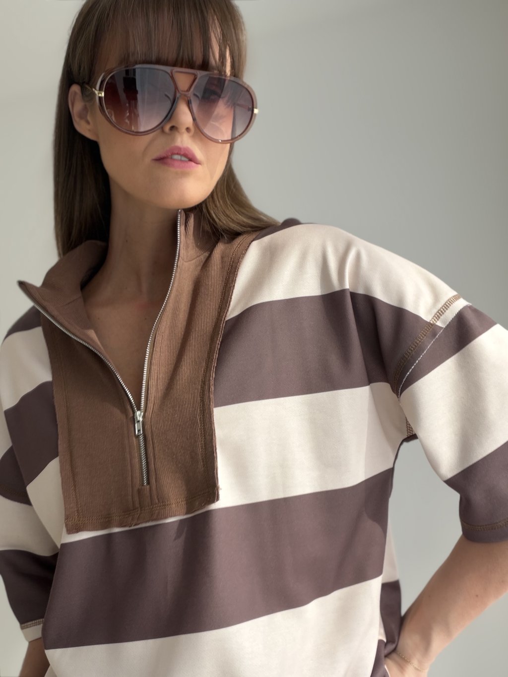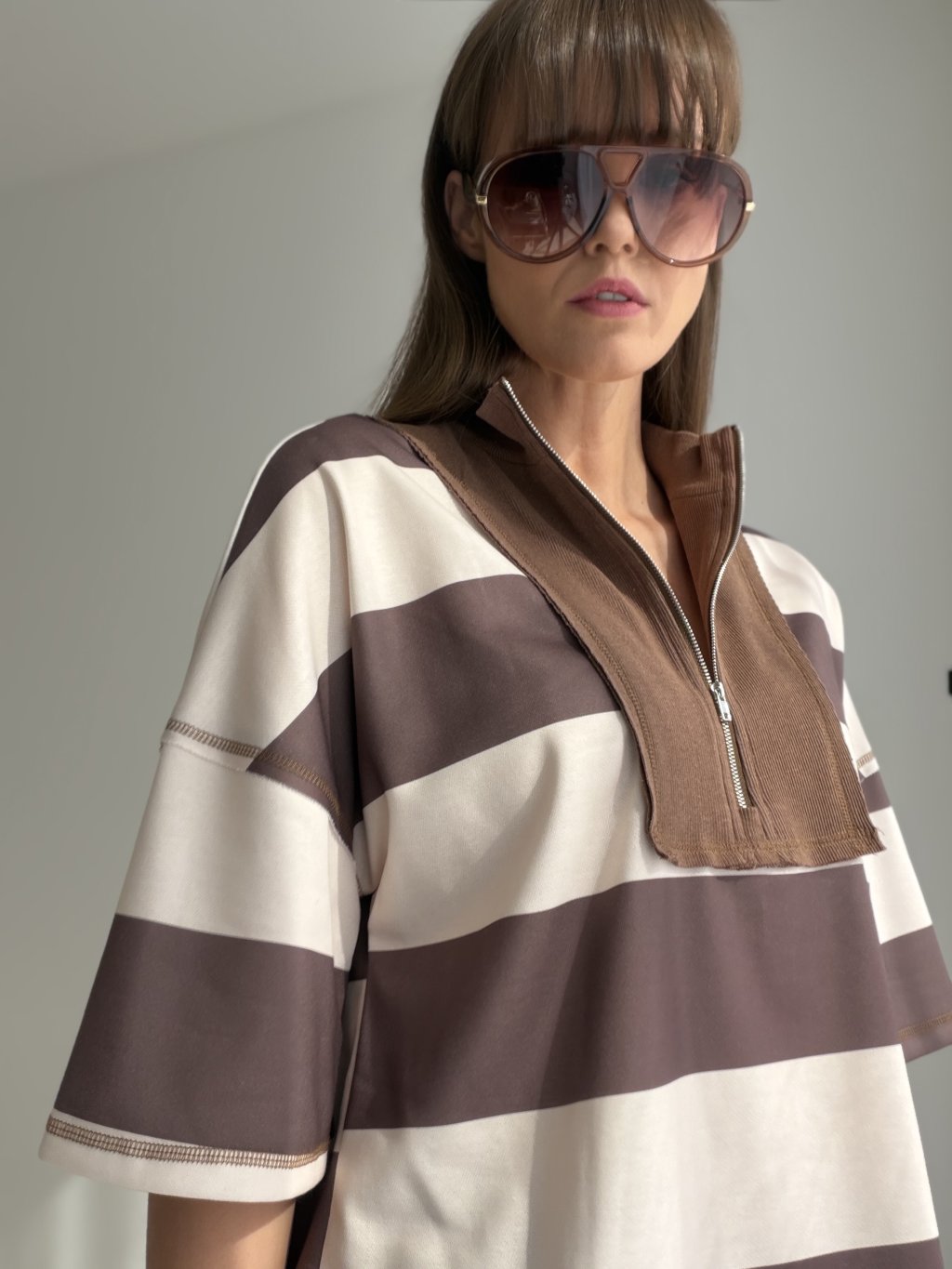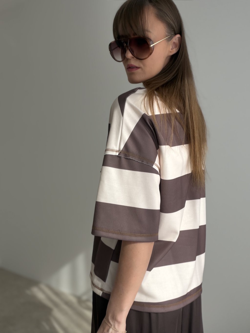 Tunika w paski o luźniejszym kroju, z krótszym rękawem i wyrazistym detalem przy dekolcie. Wygodny i stylowy model na co dzień.