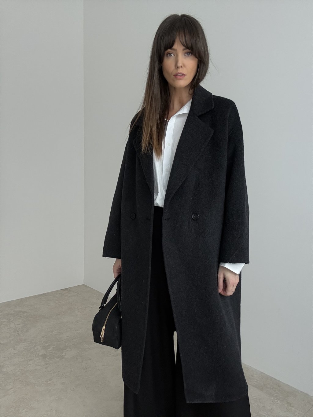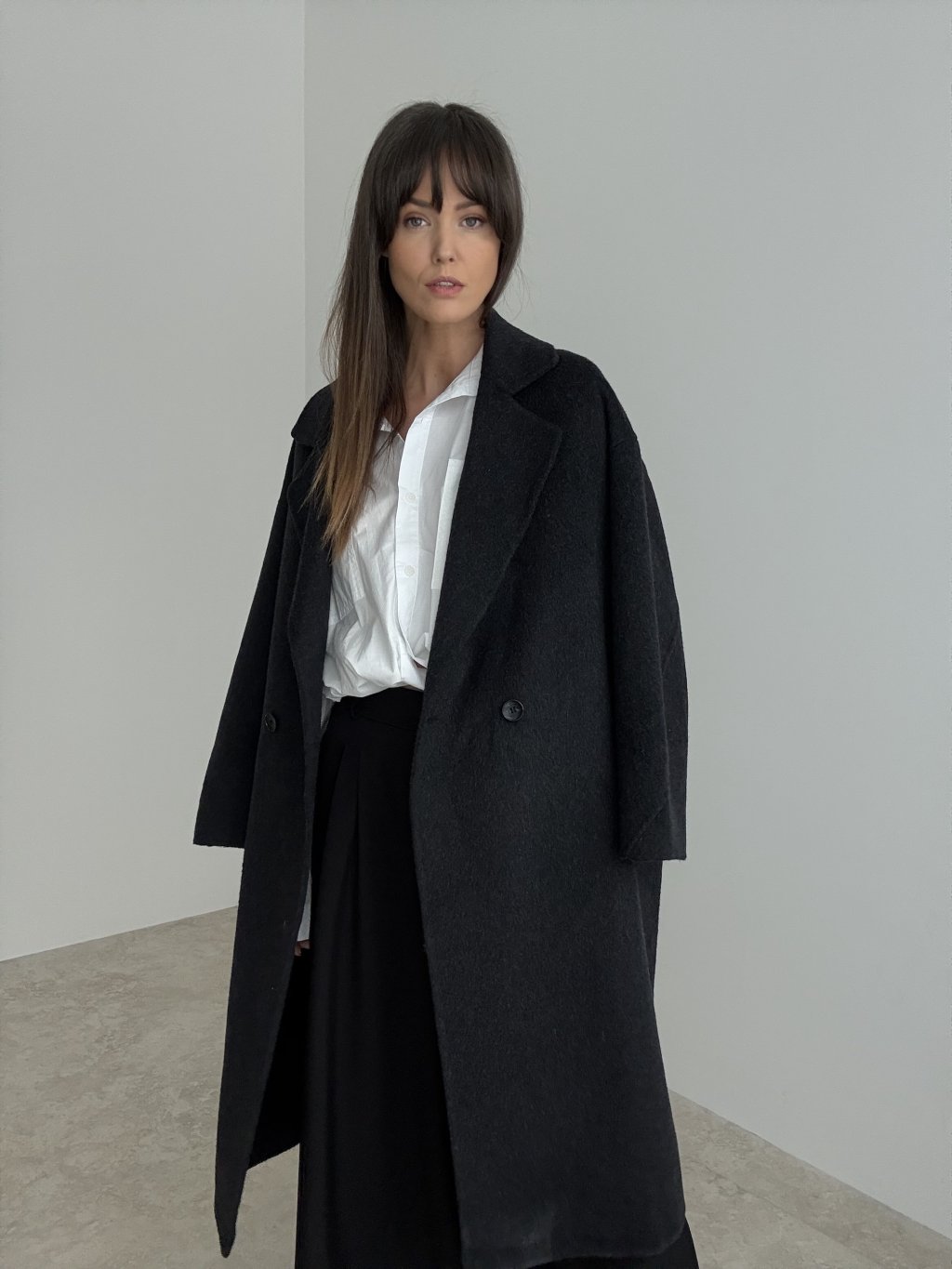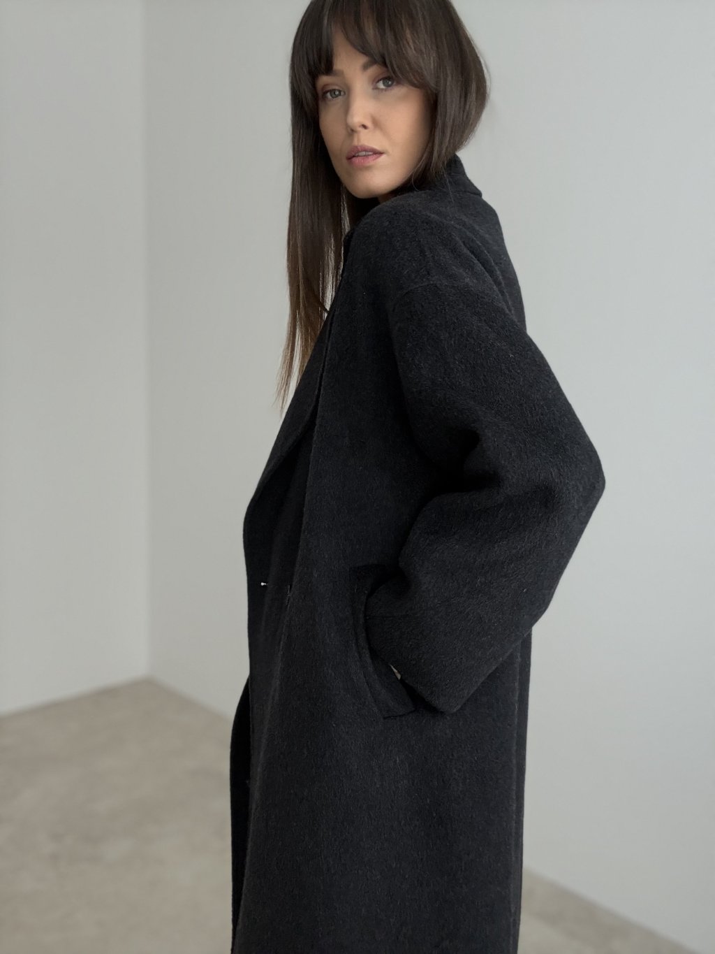 Ręcznie wykonany wełniany płaszcz o dłuższym, luźniejszym kroju z klasycznymi klapami.