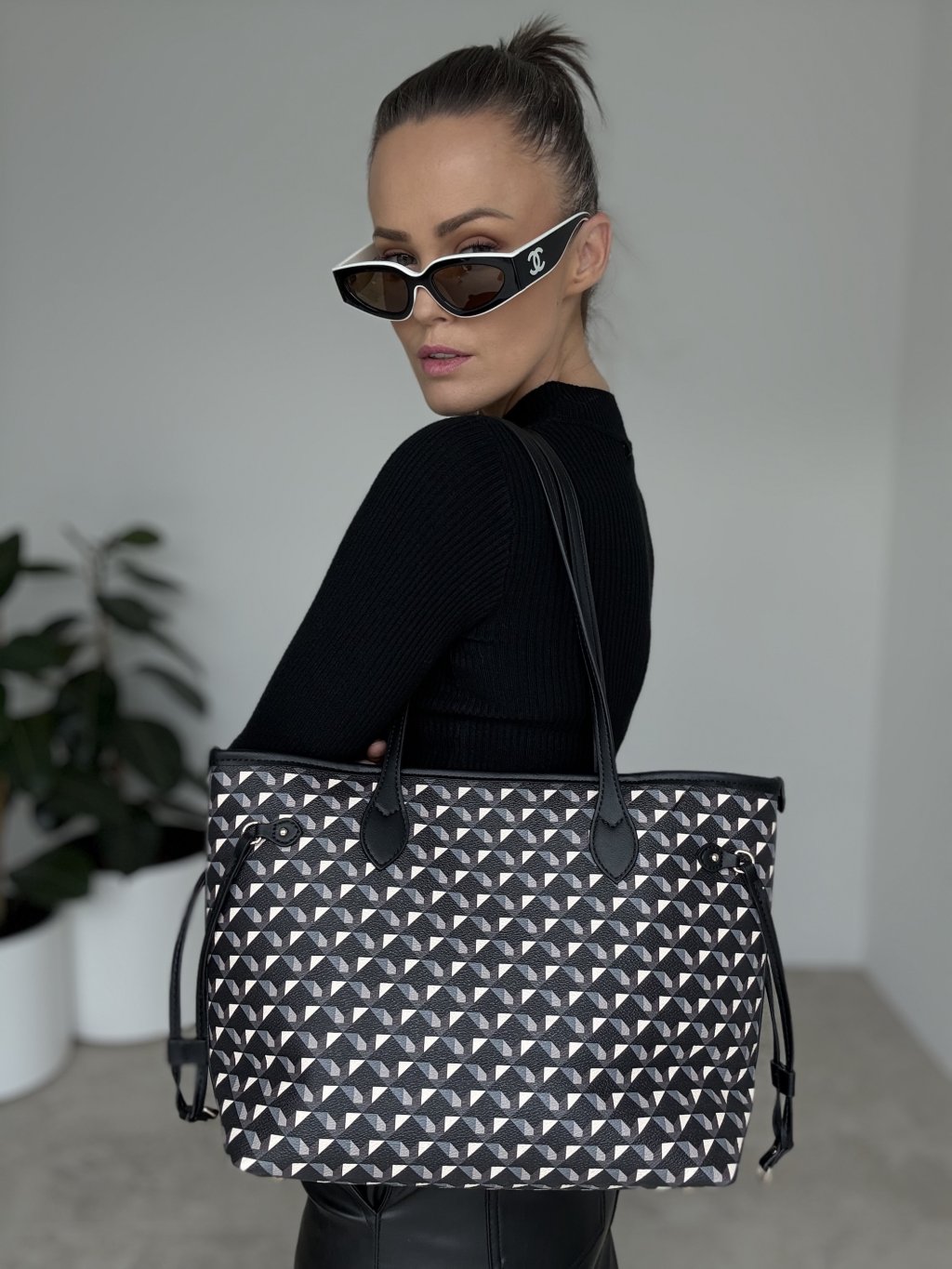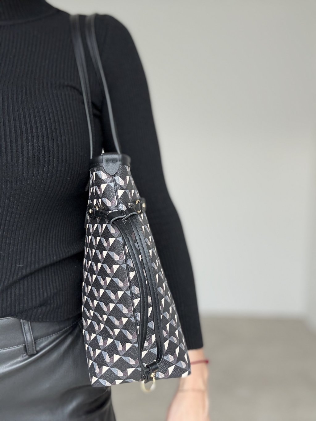 Pojemna torebka z nowoczesnym geometrycznym wzorem to idealny dodatek na co dzień. Wykonana z solidnego materiału, gwarantuje trwałość i praktyczne użytkowanie, a długie uchwyty pozwalają na wygodne noszenie na ramieniu. Wnętrze jest wystarczająco obszerne na wszystkie niezbędne rzeczy, a zapięcie na zamek zapewnia bezpieczeństwo. Torebka jest stylowa, uniwersalna i łatwa do łączenia z różnymi stylizacjami.