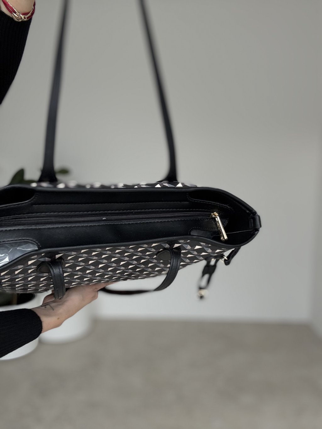 Pojemna torebka z geometrycznym wzorem i zapięciem na zamek – stylowa i praktyczna.