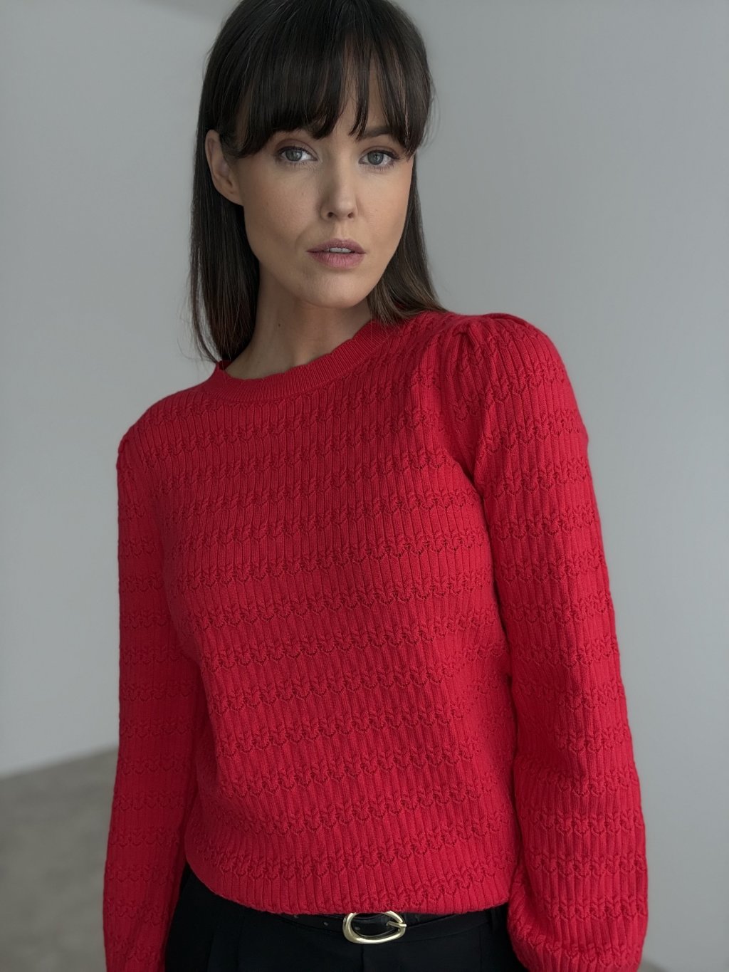 Elegancki wzorzysty sweter z subtelnym, teksturowanym splotem, lekko marszczonymi ramionami i prążkowanymi ściągaczami, który podkreśla sylwetkę i nadaje stylizacjom kobiecego, dopracowanego charakteru.