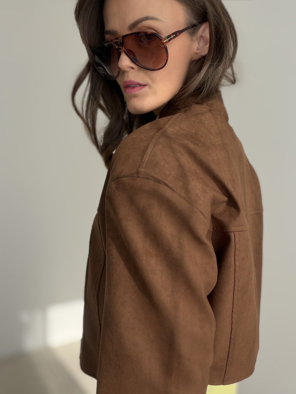 Ta kurtka to ponadczasowy element garderoby, który od razu nadaje stylizacji elegancki, dopracowany charakter. Ma krótszy, lekko pudełkowy fason, który świetnie wygląda ze spodniami lub spódnicą z wyższym stanem i ładnie wyrównuje proporcje sylwetki. Materiał jest przyjemny w dotyku, o miękkim, zamszowym wykończeniu, a jednocześnie zachowuje bardziej usztywnioną formę. Minimalistyczna stójka i czyste linie zostały uzupełnione subtelnymi metalowymi detalami, które dodają nowoczesności. Przeszycia i podziały na przodzie oraz na plecach podkreślają konstrukcję kurtki i sprawiają, że całość wygląda bardzo stylowo zarówno na co dzień, jak i na wyjścia do miasta.
