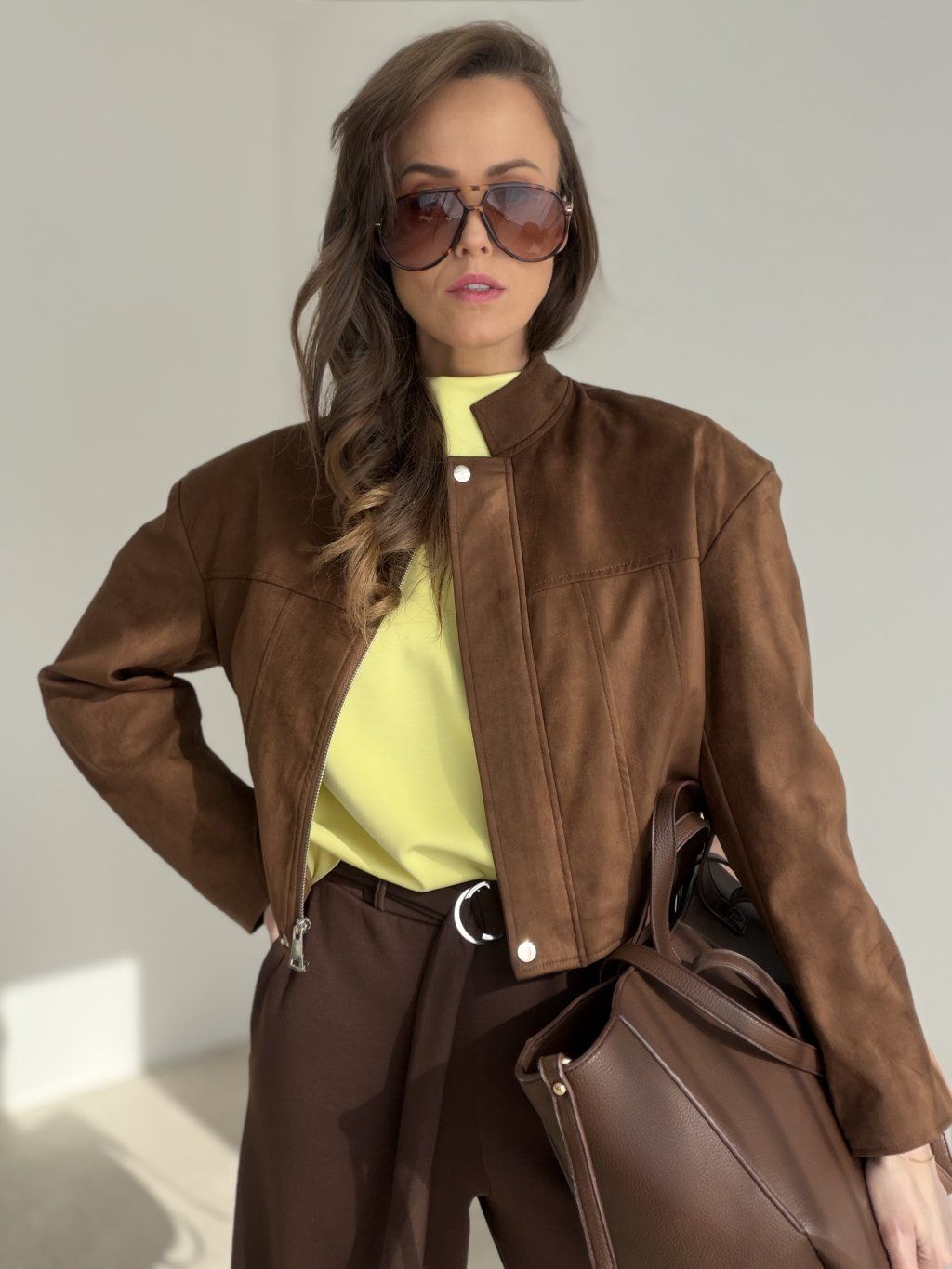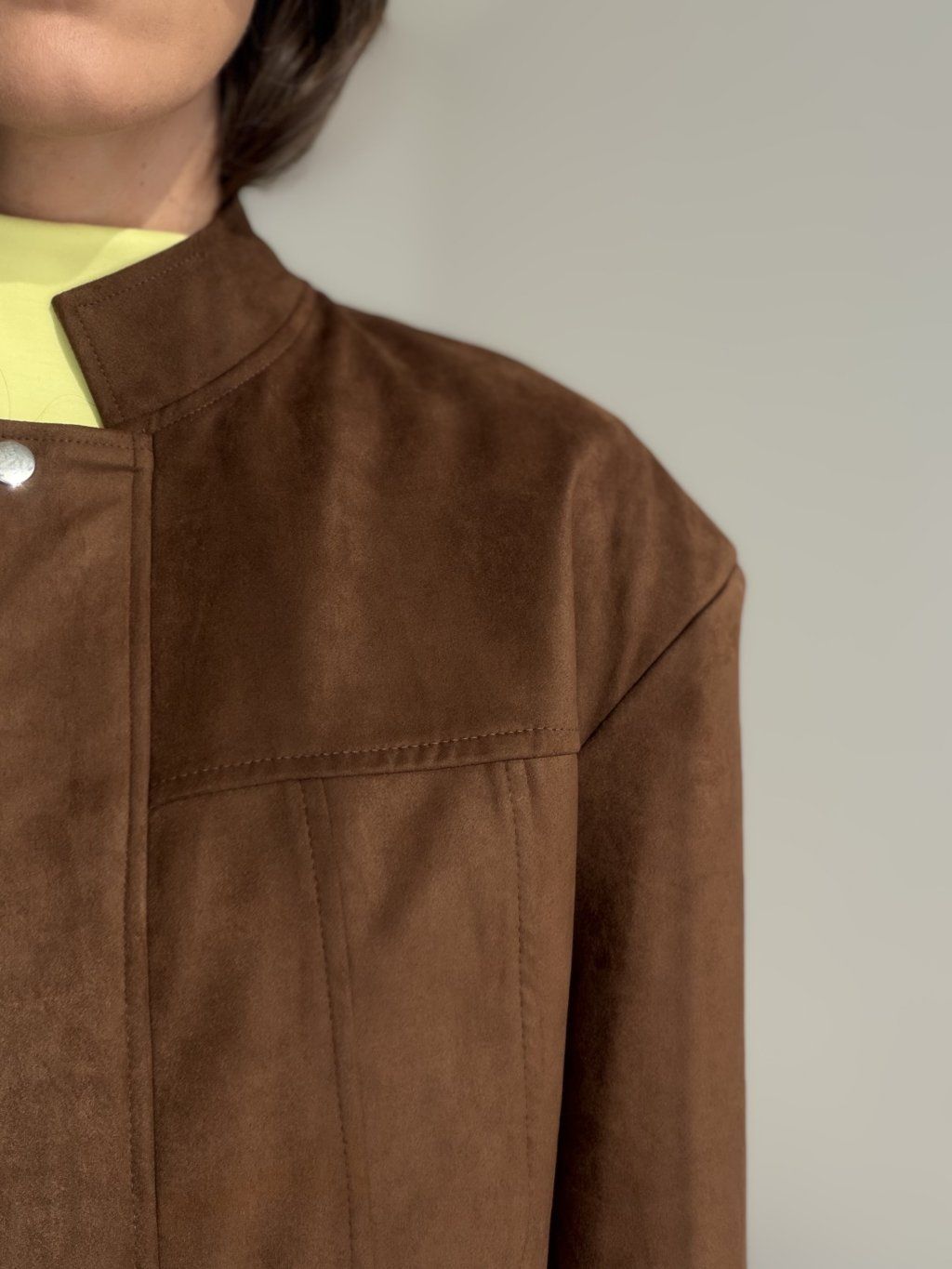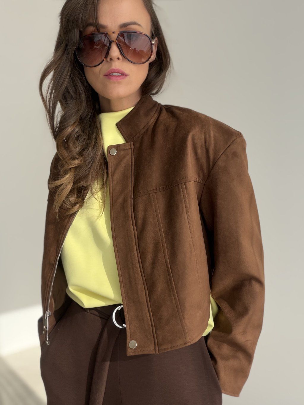 Krótka, strukturalna kurtka o zamszowym wykończeniu ze stójką, czystą linią i metalowymi detalami, idealna do stylizacji z wyższym stanem.