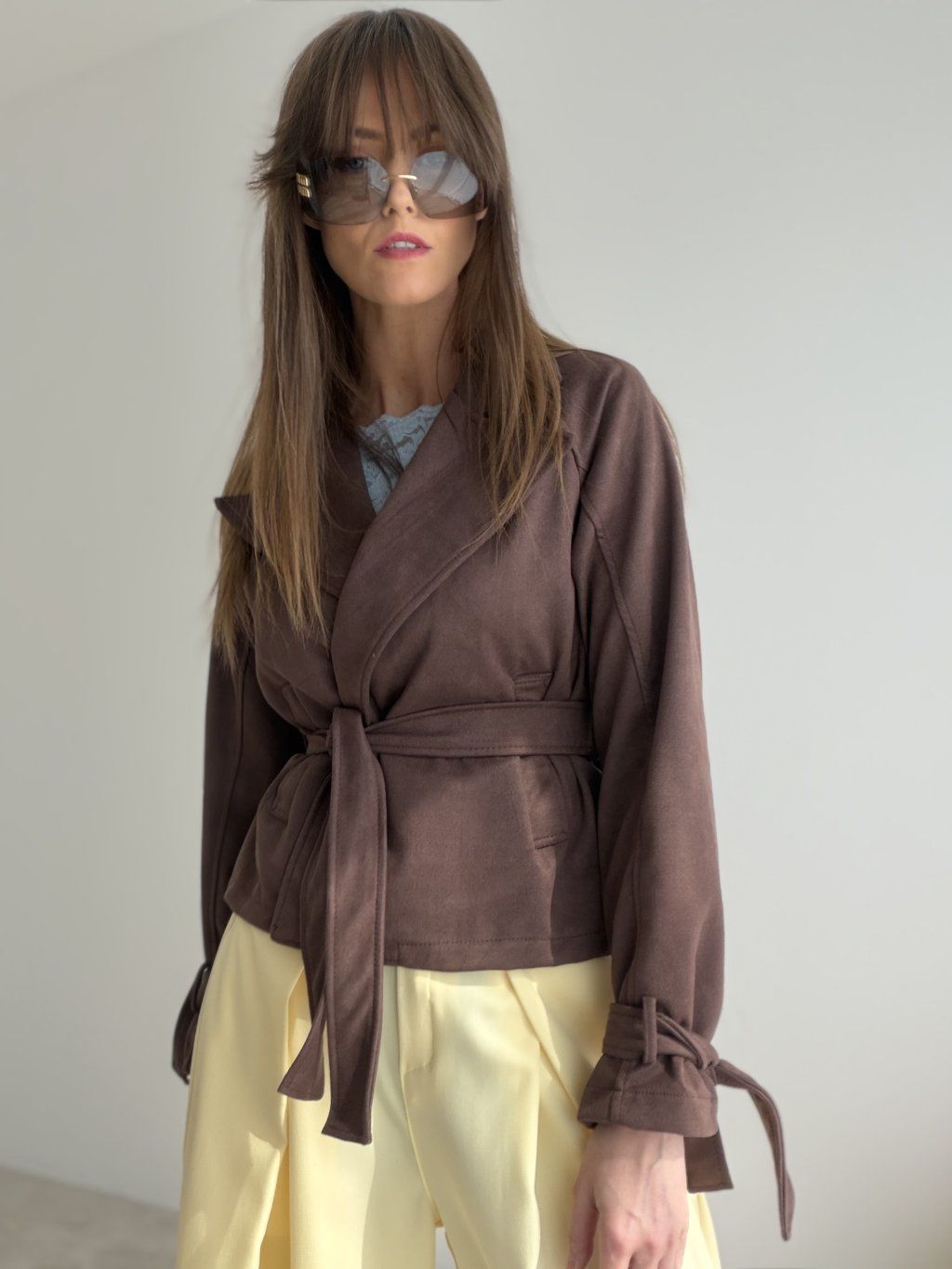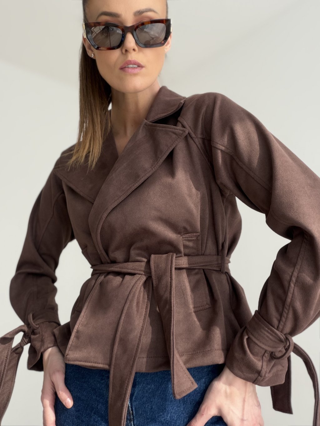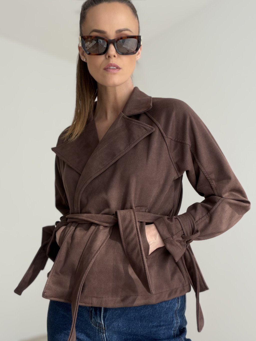Zamszowa marynarka z wiązaniem w talii to elegancki i stylowy model do codziennych oraz kobiecych stylizacji. Nie ma podszewki, dzięki czemu jest lekka, miękka i bardzo wygodna w noszeniu.